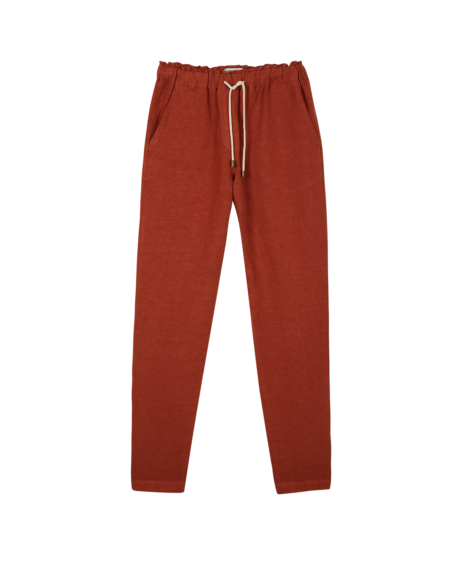 Pantalon en lin et viscose rouge de Mars. La viscose, mélangée au lin, est obtenue à partir de la cellulose du bois. Il s'agit donc d'une matière artificielle entièrement recyclable, d'une fluidité et d'une souplesse incroyable, autrefois appelée soie artificielle.