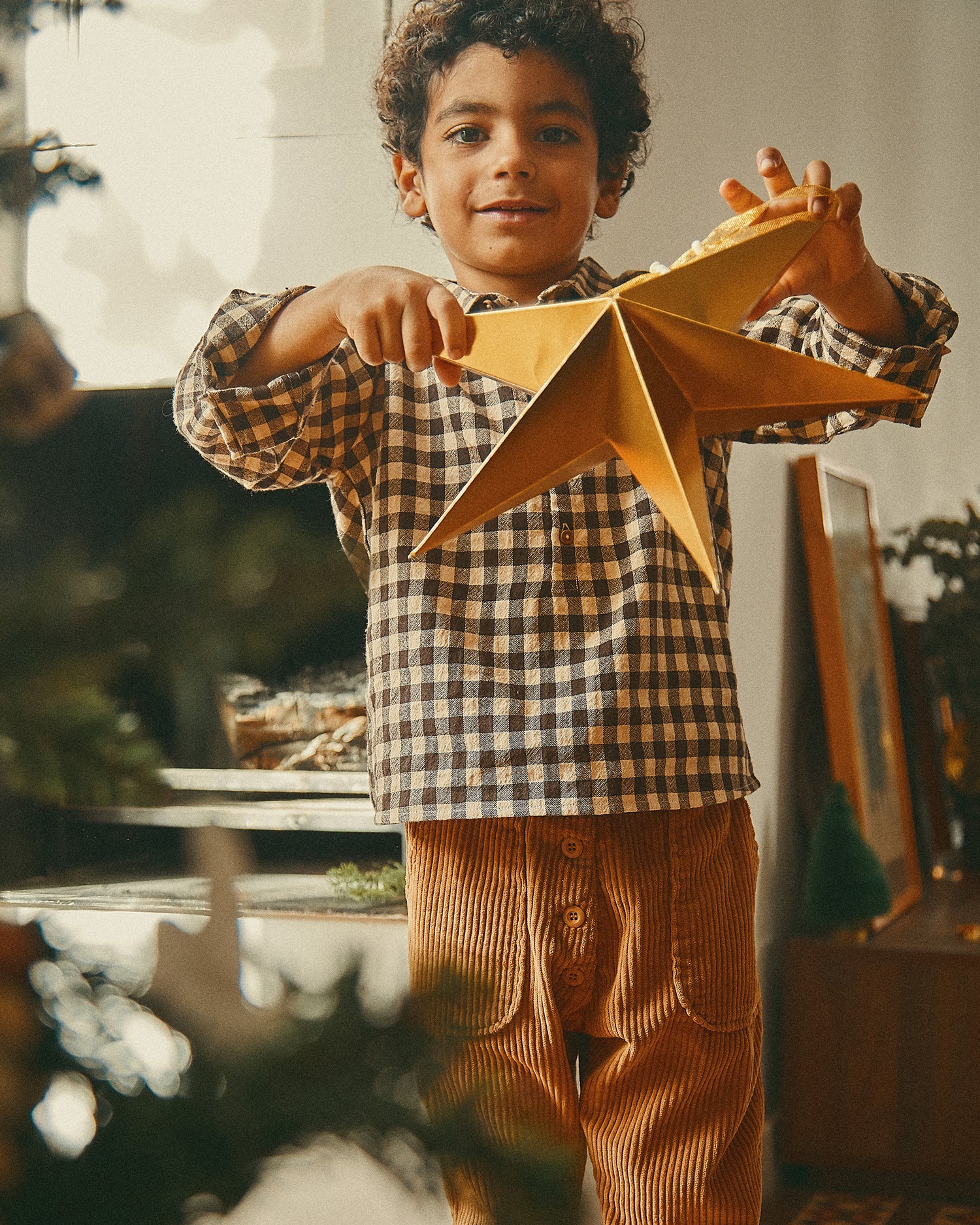 Pantalon en velours de coton côtelé caramel. La forme sarouel, la braguette à boutons et la ceinture élastiquée ajustable avec un lien en sergé de coton font de ce pantalon un basique du vestiaire de Emile & ida. En plus de ses 2 poches plaquées devant, il a également 1 poche arrière boutonnée. Un pantalon dont les grosses côtes sont beaucoup moins difficiles à grimper que celles du tour de France car il suffit de les caresser dans le sens du poil !