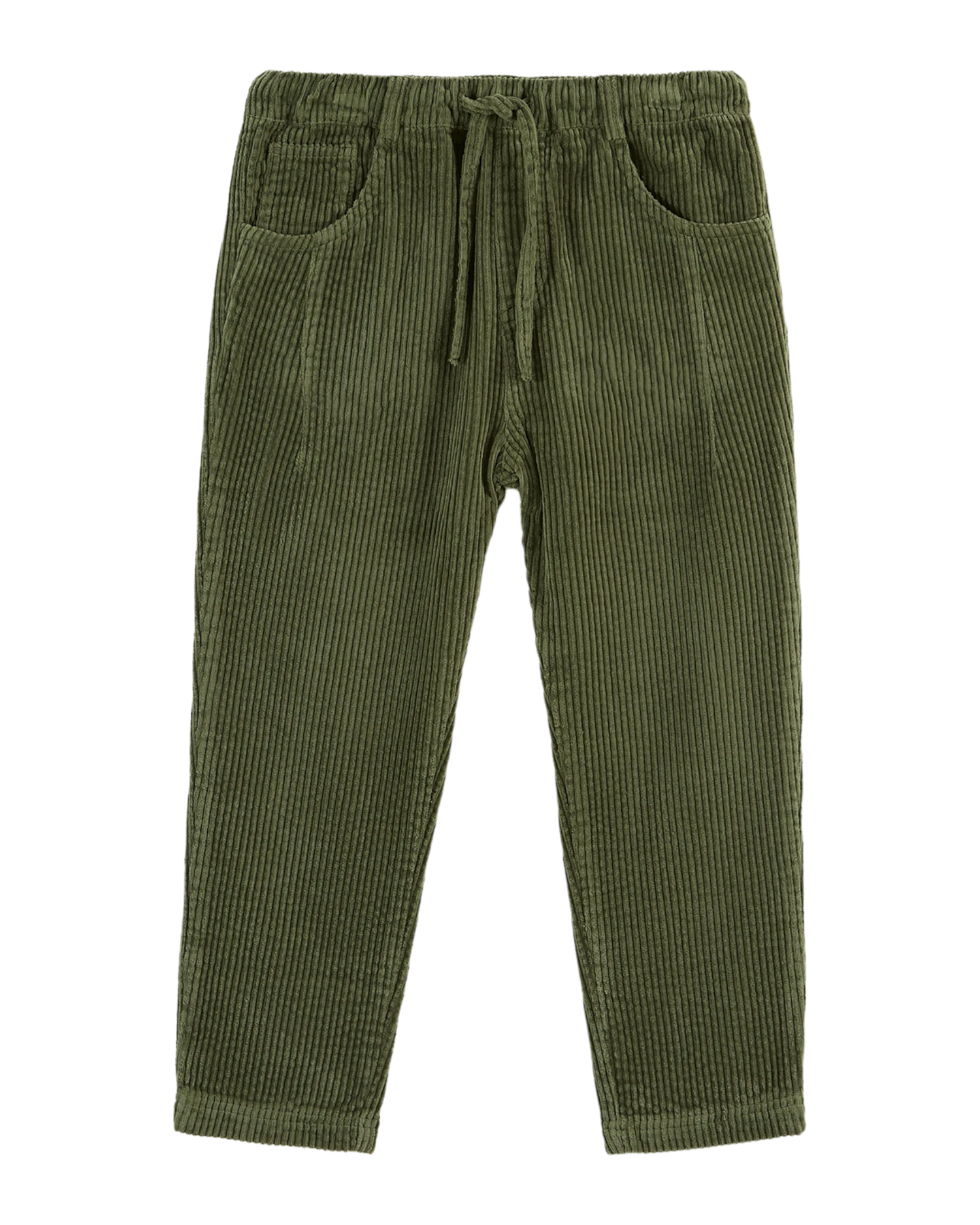 Pantalon en velours de coton côtelé vert. Le pantalon est monté sur une ceinture élastiquée et un lien en velours ton sur ton sur le devant permet d'ajuster la taille. Il s'enfile et se retire donc en un tour de main et même les plus petits pourront s'habiller tout seul ! Il a 2 poches western, la petite poche pour la monnaie du pain et deux poches plaquées sur les fesses. Des surpiqûres soulignent les poches, la ceinture, l'emplacement de la braguette et marquent les pinces qui descendent des poches.