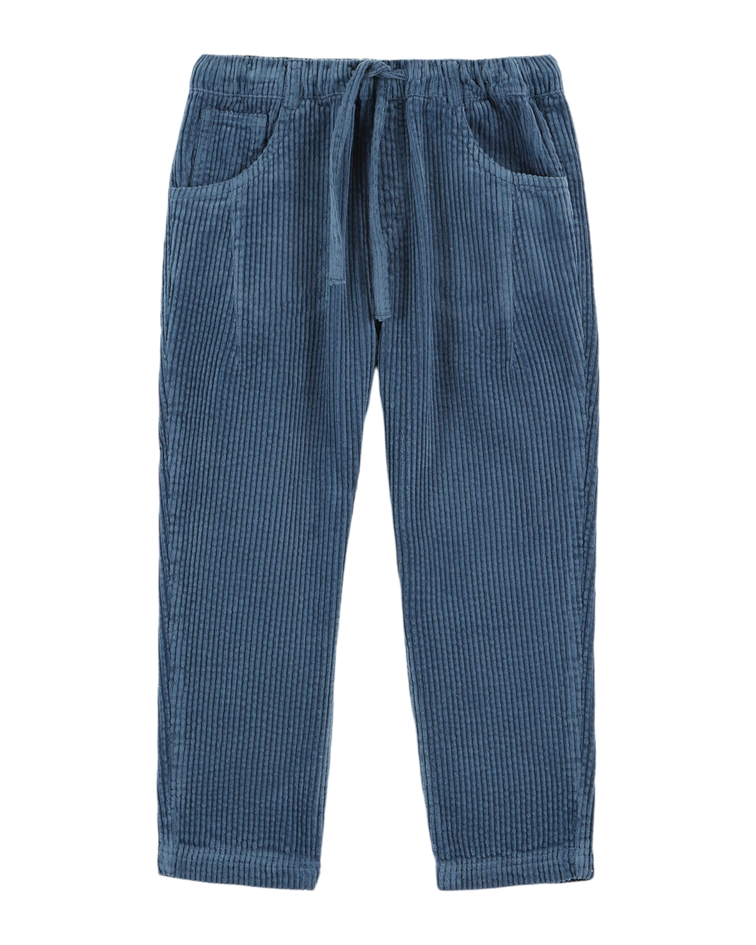 Pantalon en velours de coton côtelé bleu. Le pantalon est monté sur une ceinture élastiquée et un lien en velours ton sur ton sur le devant permet d'ajuster la taille. Il s'enfile et se retire donc en un tour de main et même les plus petits pourront s'habiller tout seul ! Il a 2 poches western, la petite poche pour la monnaie du pain et deux poches plaquées sur les fesses. Des surpiqûres soulignent les poches, la ceinture, l'emplacement de la braguette et marquent les pinces qui descendent des poches.