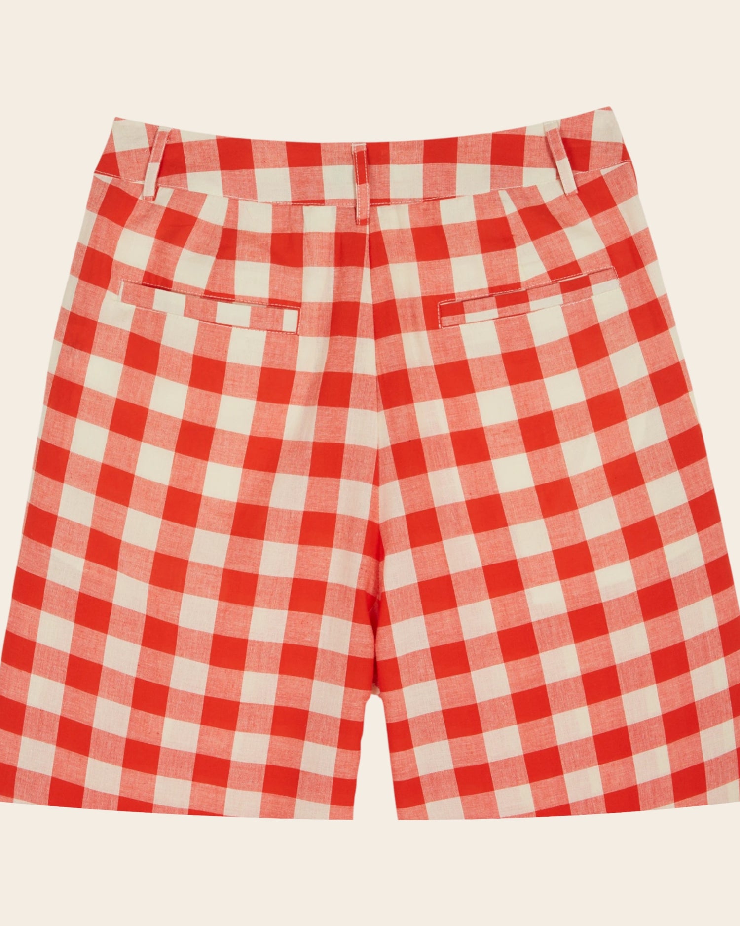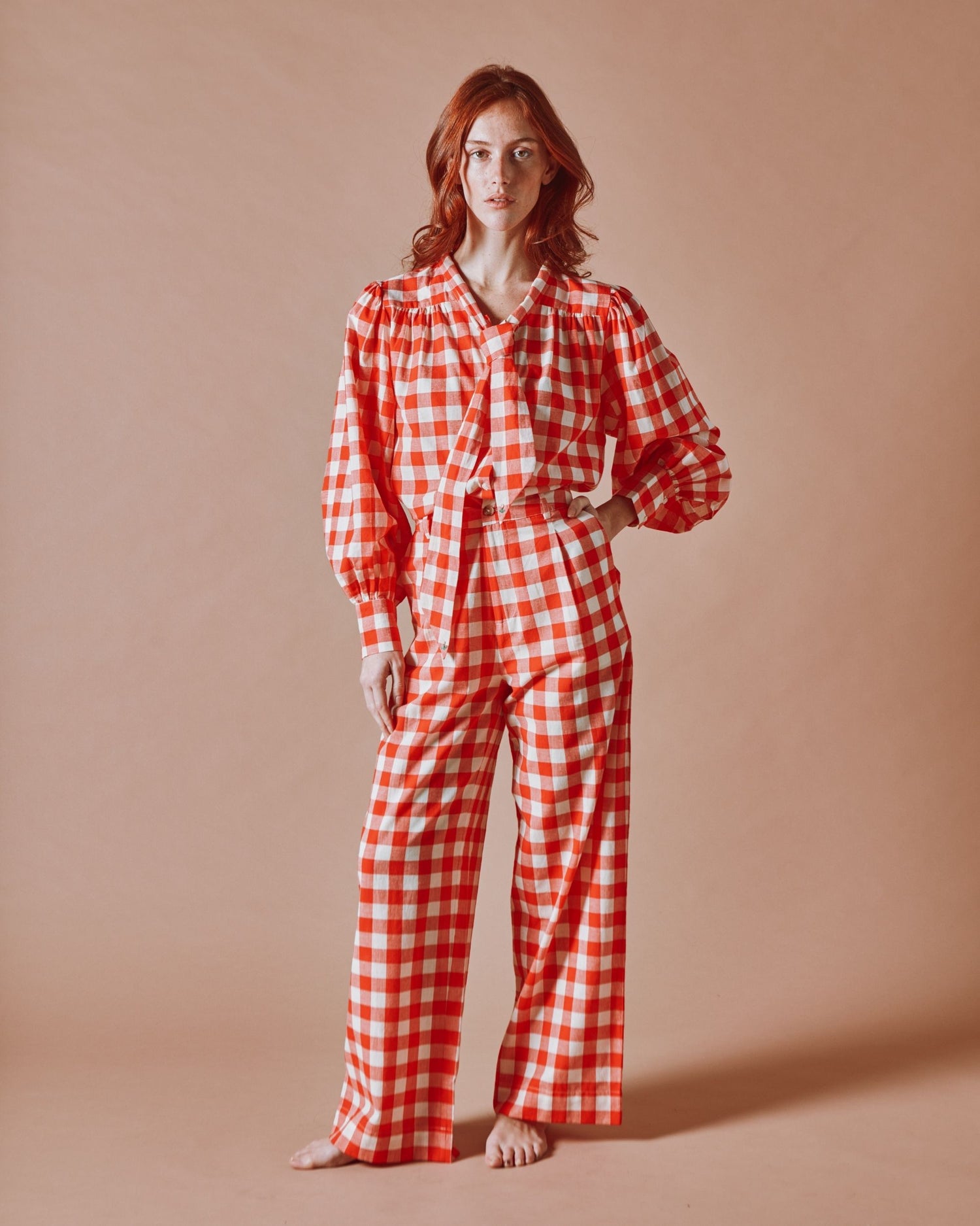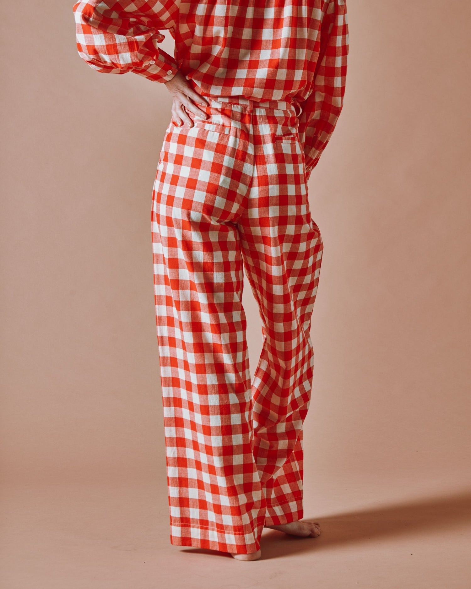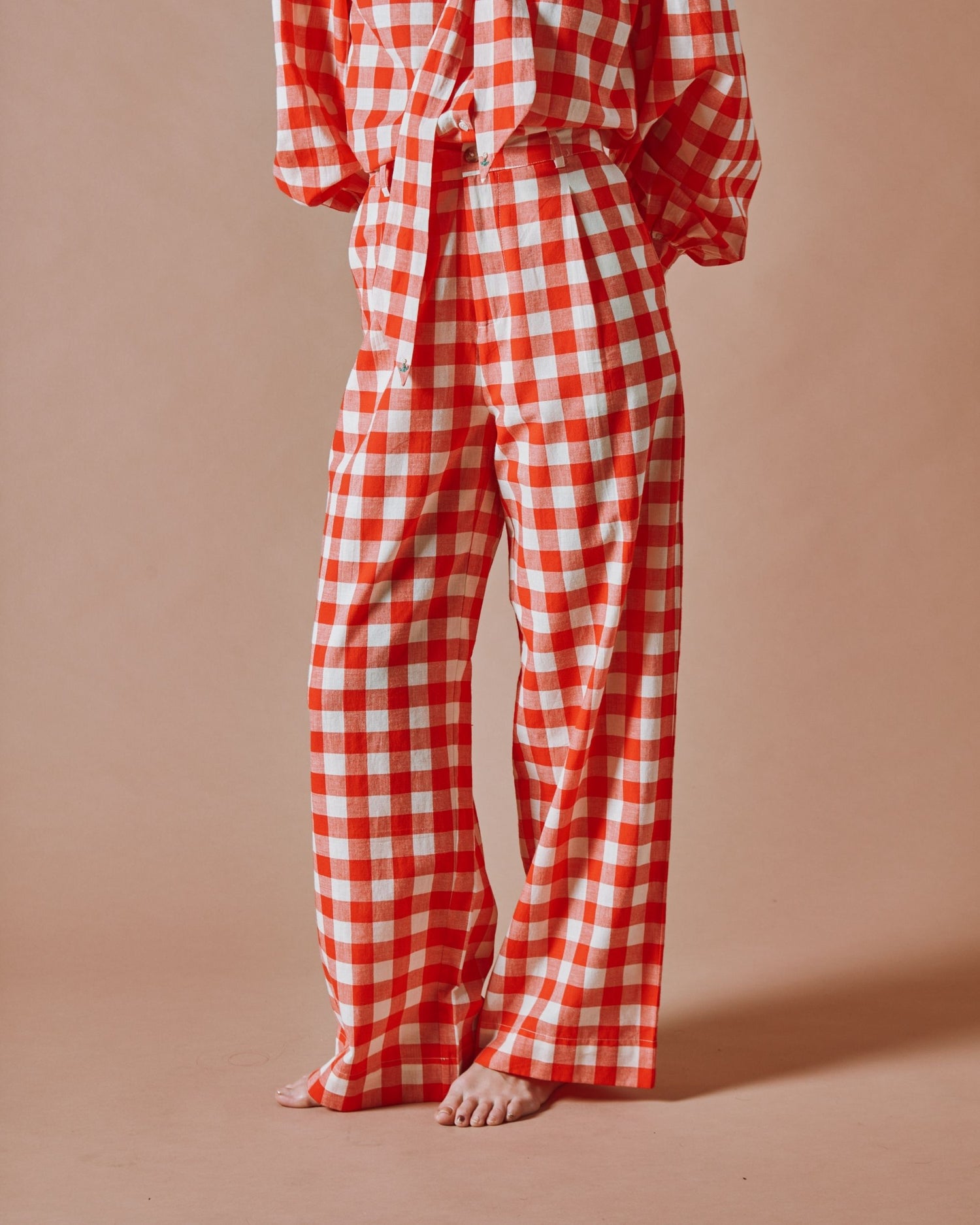 Pantalon large en coton bio vichy rouge et blanc. Taille haute, jambes larges, ce modèle a l'avantage de flatter toutes les silhouettes.