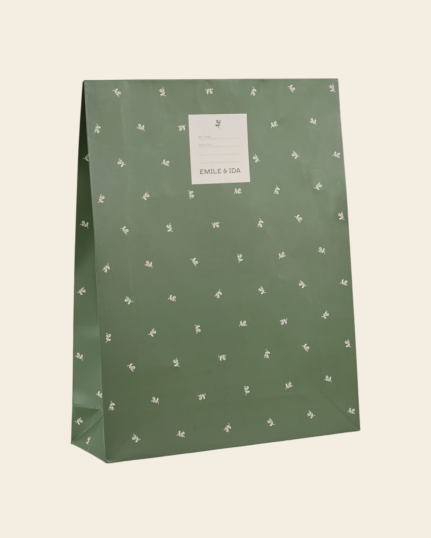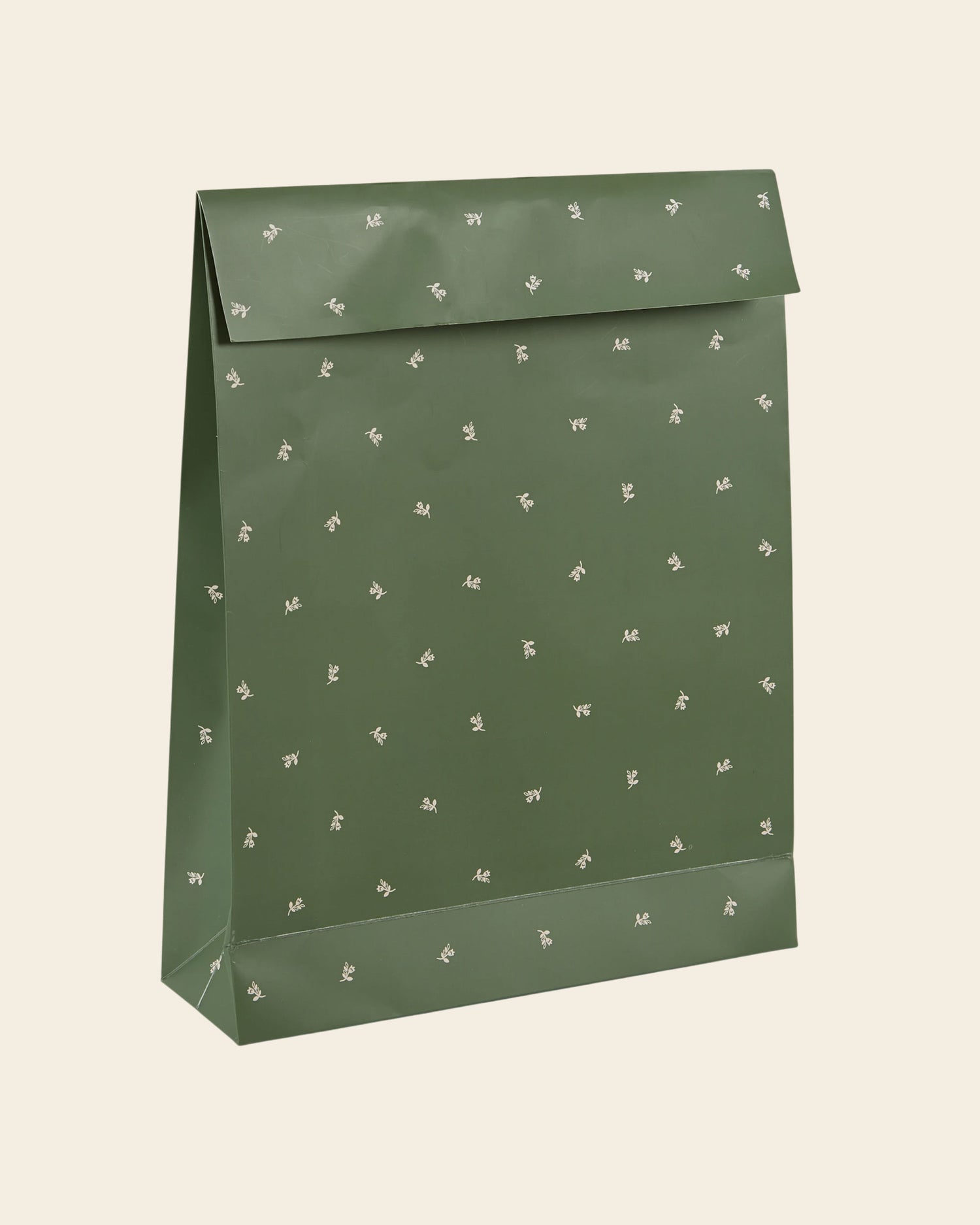 Pochette cadeau verte parsemée de jonquilles écrues. Fermeture adhésive au dos.