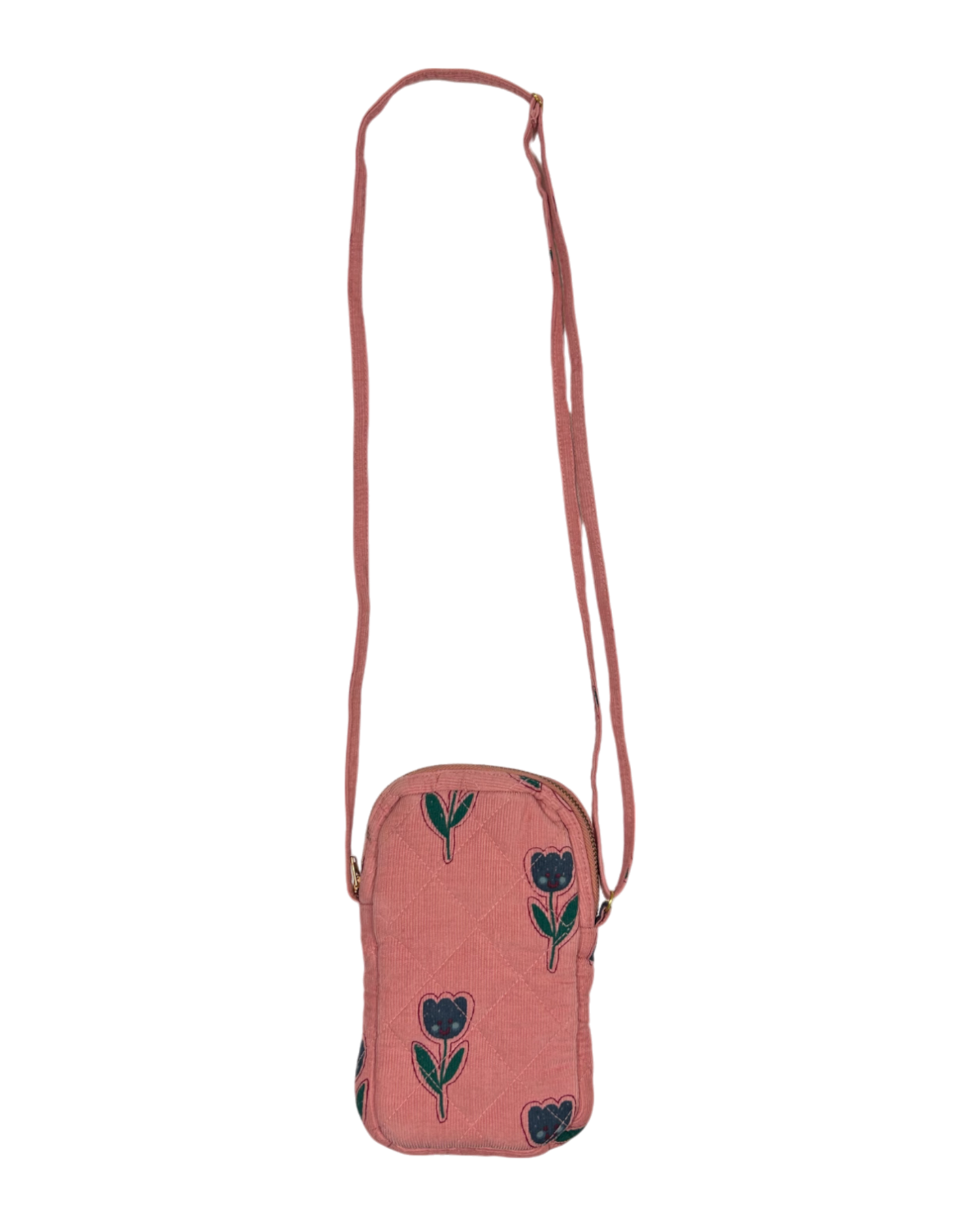 Pochette pour smartphone en velours de coton milleraie rose où fleurissent des tulipes joyeuse bleues. Une petite poche sur le dessus se ferme avec un bouton pression doré. L'intérieur, doublé du même tissu offre une plus grande capacité de rangement et se ferme avec une fermeture à glissière en métal. Une courroie réglable permet de le porter en bandoulière ou en sautoir autour du cou. Dimensions : 10x17x2cm