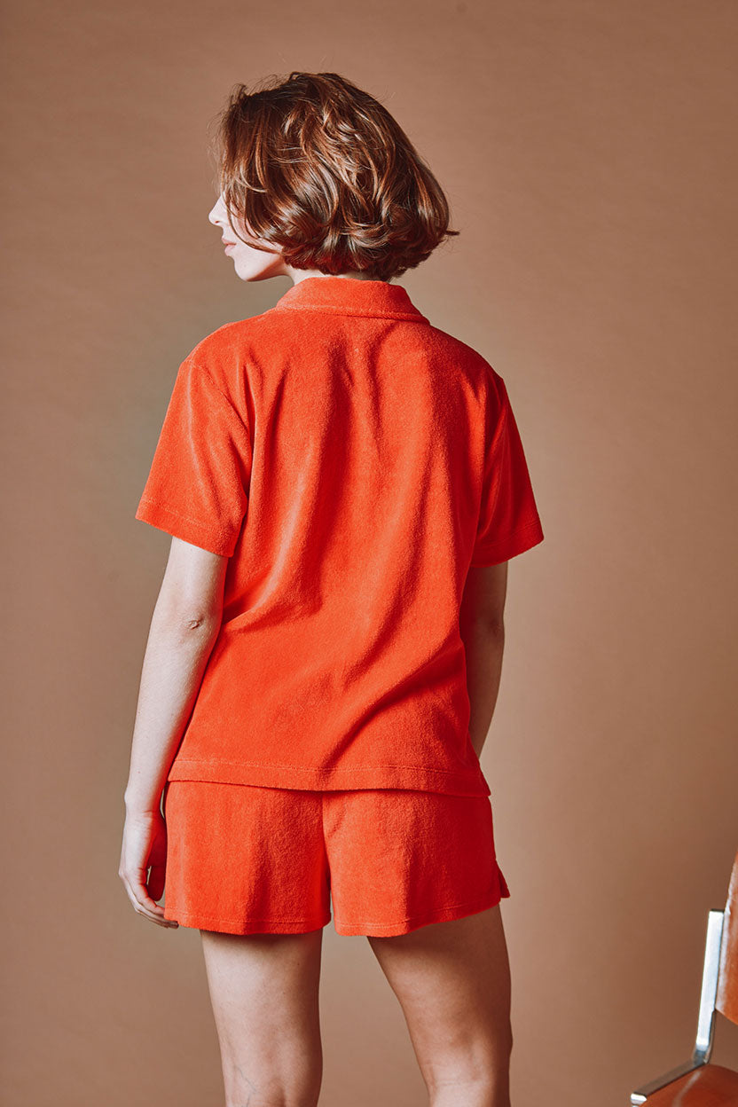 Polo éponge rouge coquelicot, réalisé en velours éponge extra doux, offrant une texture moelleuse, extensible et confortable. - Col pointu - Encolure ras-du-cou - Patte de boutonnage dissimulée sous une bande en jersey de coton - "Amour" brodé sur la poitrine