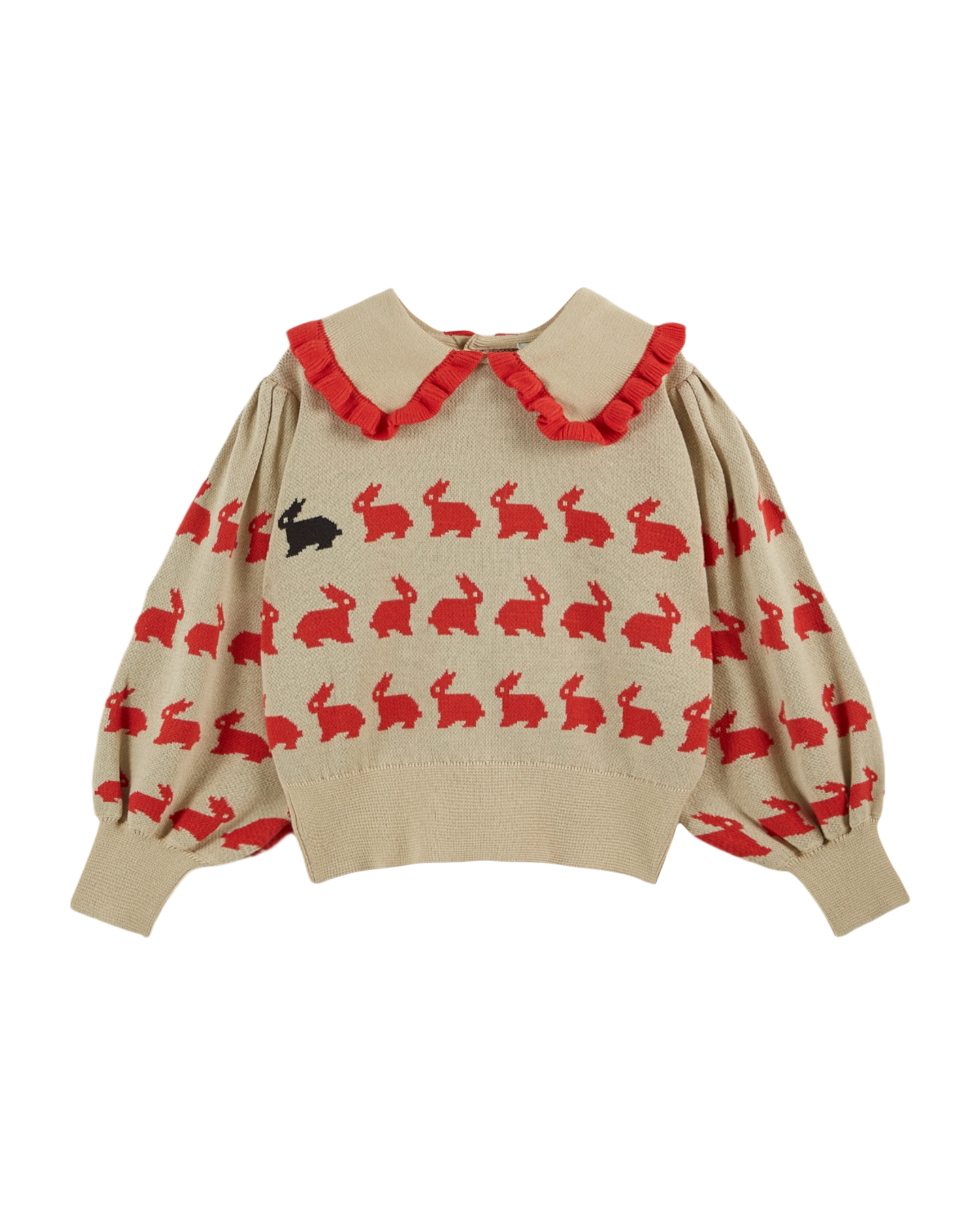 Pull jacquard en coton biologique beige. Le point fantaisie dans lequel il est tricoté change du graphisme du point de jersey et la technique du jacquard apporte de l'épaisseur à la pièce. Pull à la sage encolure ras du cou ceinte d'un col bordé d'un froufrou rouge qui s'étend sur les épaules, larges manches, côtes 1X1 ton sur ton à la base et aux poignets dans lesquelles sont tissés des fils élastiques grâce auxquels les côtes ne se détendront pas au fil du temps. Les lapins rouges parmi lesquels un intrus s'est glissé, sont prêts à emmener qui les suit au pays des merveilles.