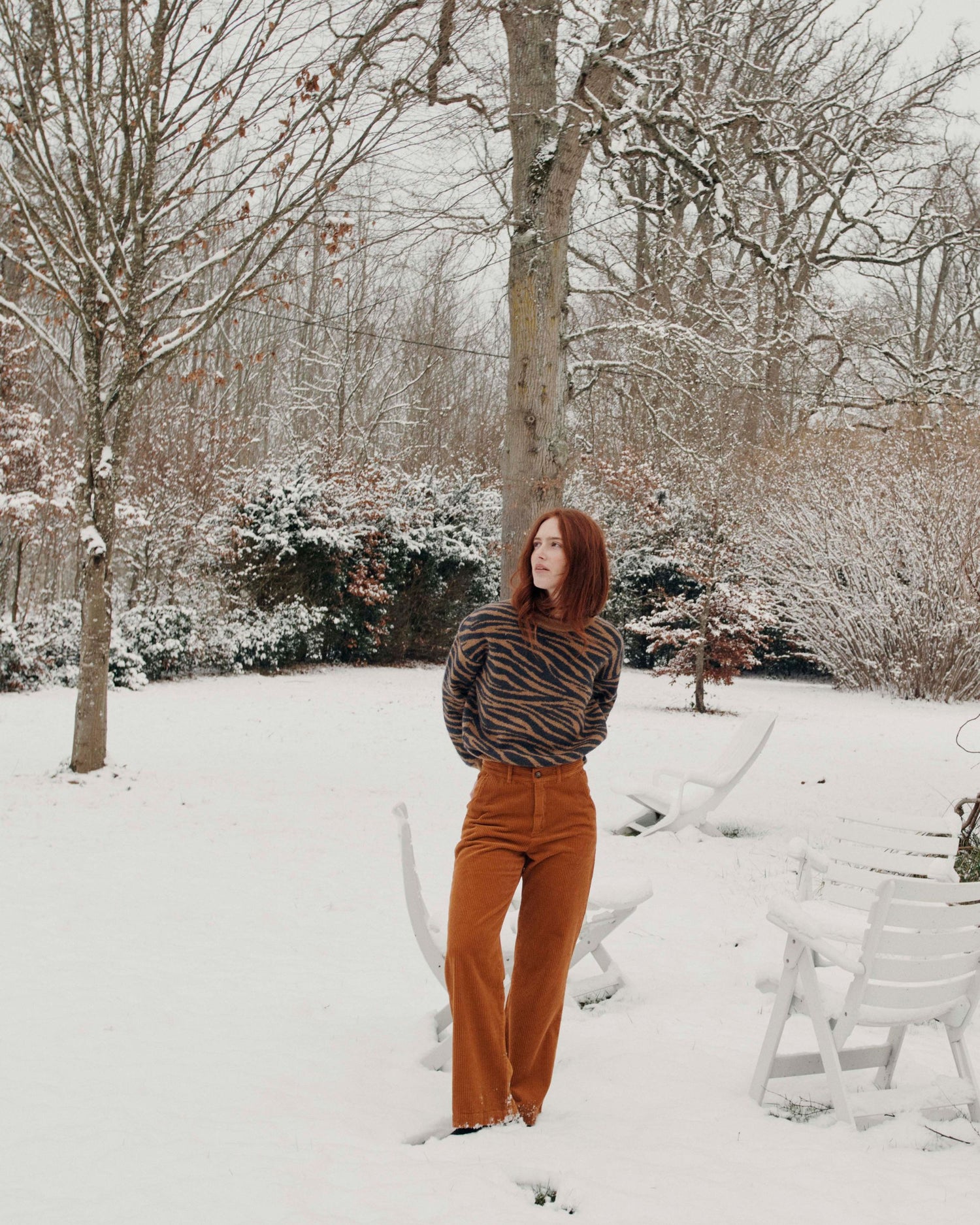 Pull jacquard en laine alpaga mélangé beige et noir. Un pull tigré très chaud, qui vous camouflera dans les forêts et vous permettra d'observer la nature. Alors, bien que le fil soit fin, l'épaisseur générée par la technique du tricotage vous gardera douillettement au chaud des premiers frimas aux derniers jours de l'hiver. N'hésitez pas à porter un t-shirt manches longues en-dessous ! Les manches longues et la base sont terminées par de simples côtes 1x1 là où l'encolure ronde est bordée des mêmes côtes mais en double épaisseur.