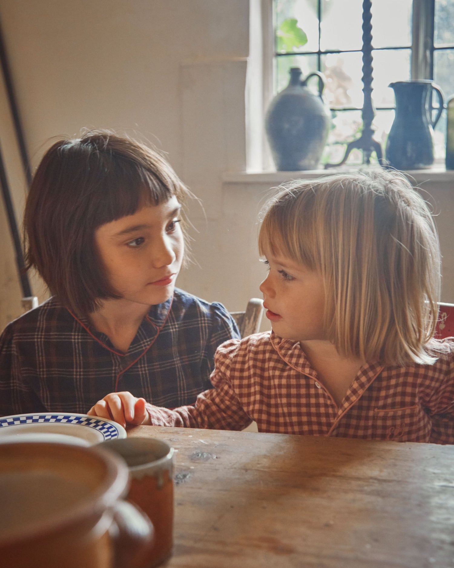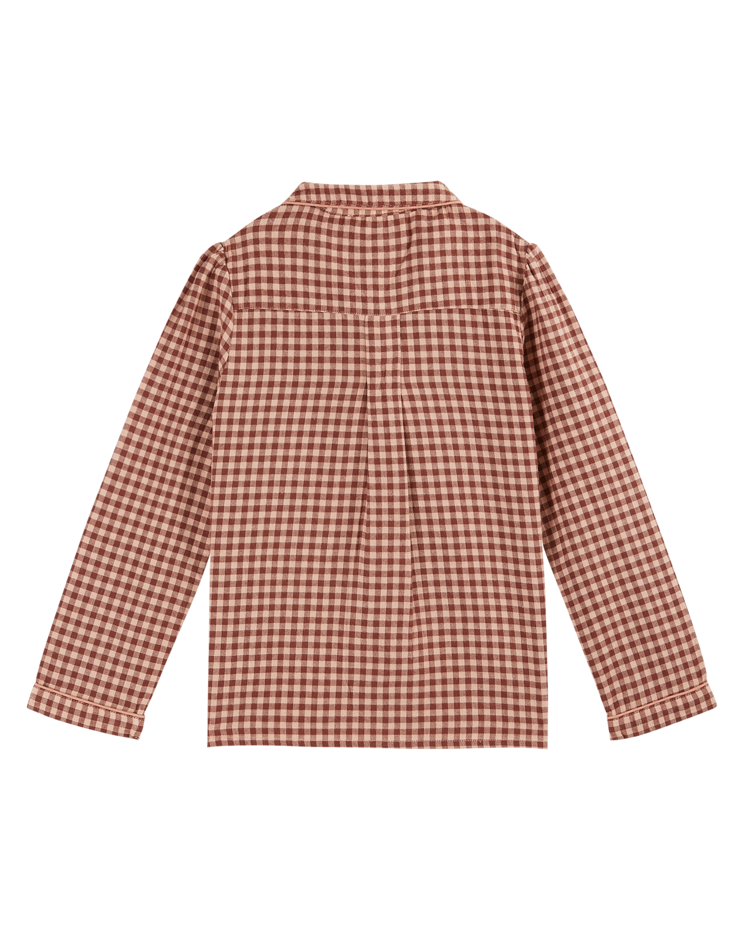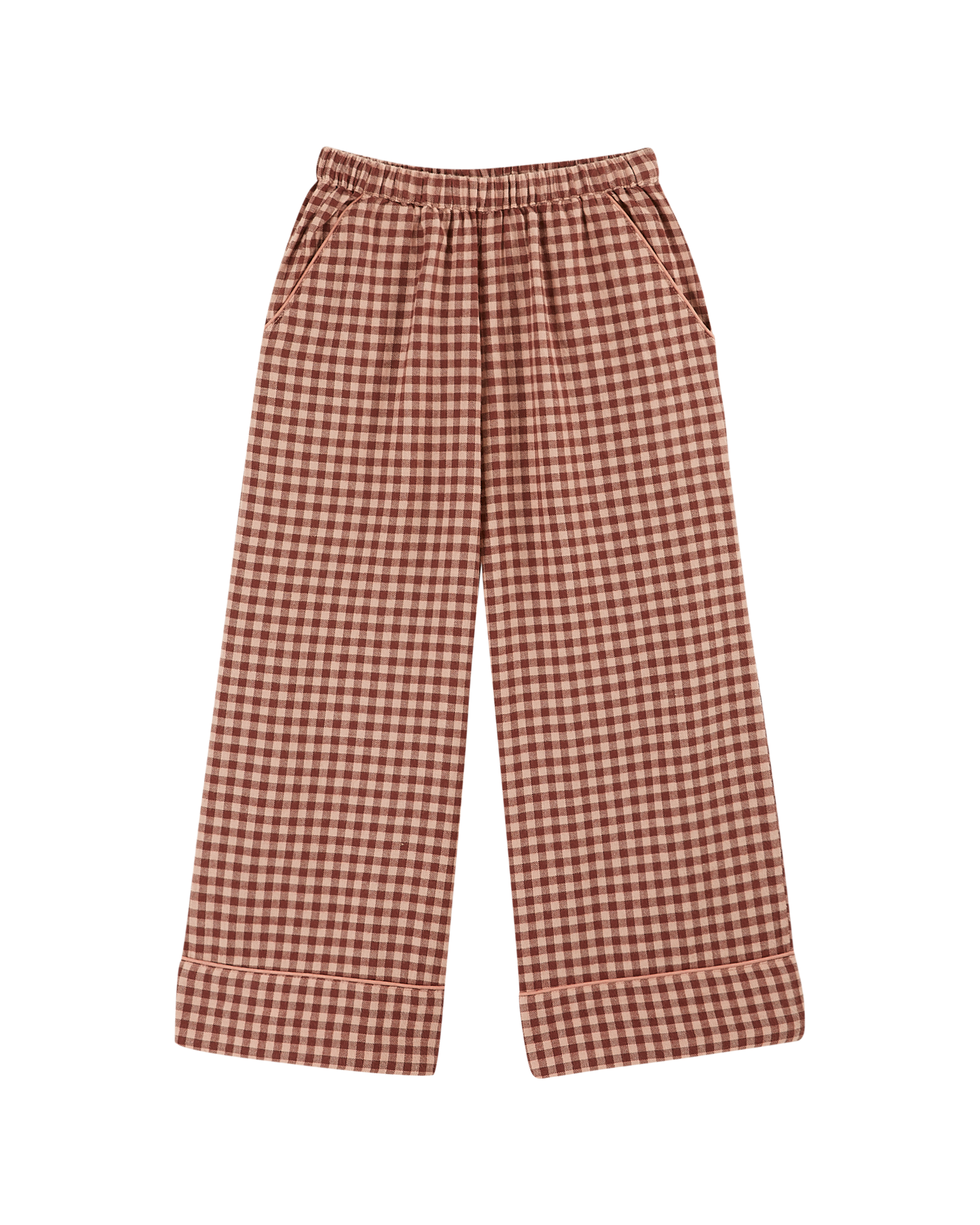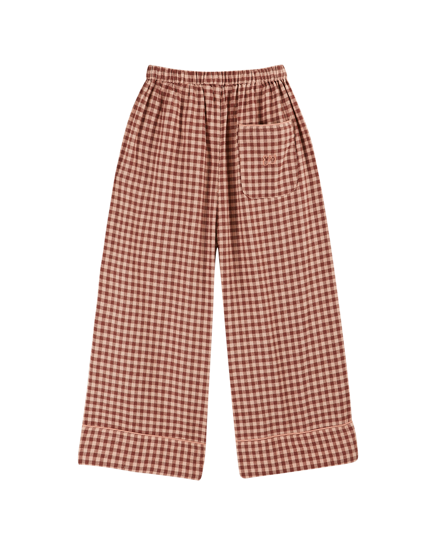 Pyjama en coton vichy rose avec son pochon assorti. Une veste à manches longues avec un petit col tailleur et une poche sur la poitrine. Elle se ferme avec des boutons en nacre naturelle sur toute la hauteur. Le pantalon coupe wide pour être à l'aise est monté sur une ceinture élastiquée. Il est agrémenté de deux poches italiennes et d'une poche sur les fesses brodée en blanc du monogramme de la marque. Le passepoil bleu souligne la patte de boutonnage et les poches, le col, les poignets et les chevilles.