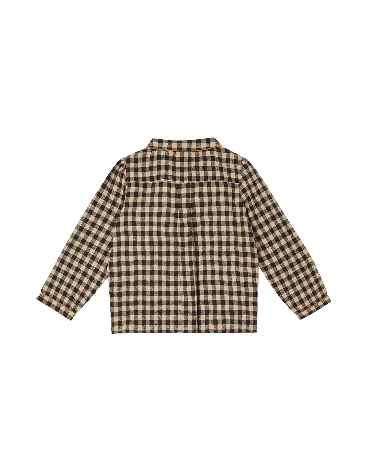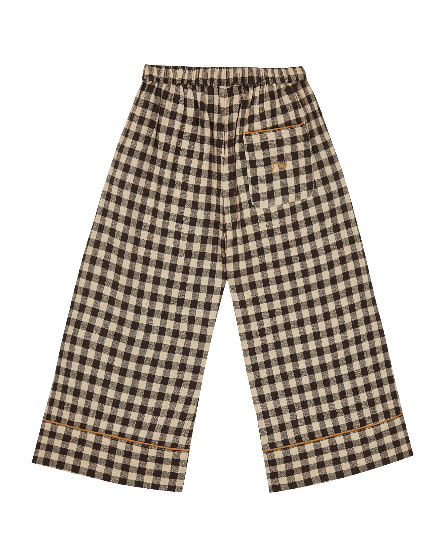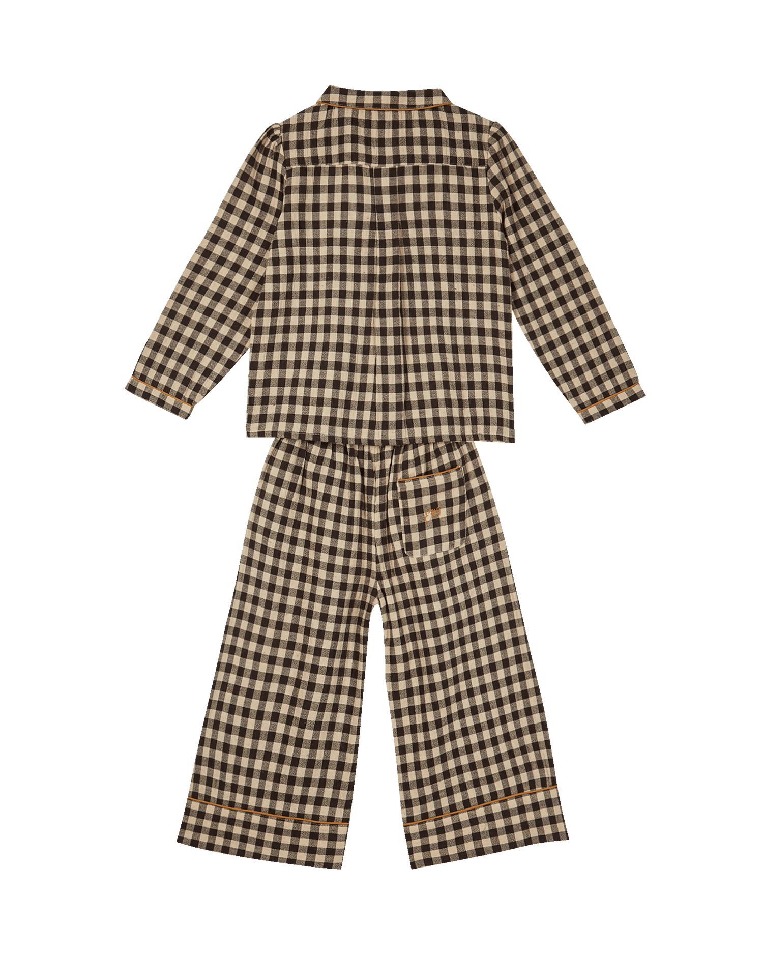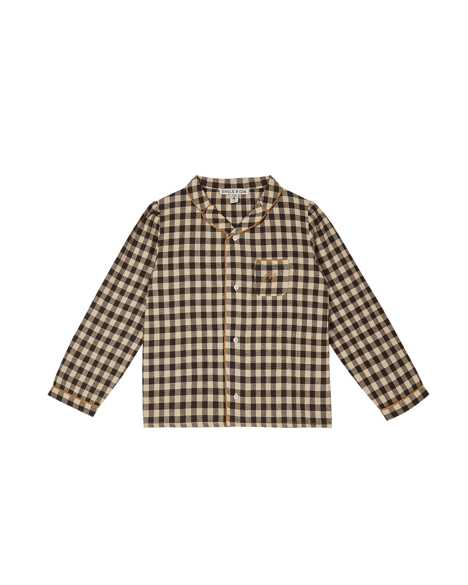 Pyjama en coton vichy écru et café. "Couleur, café, que j'aime ta couleur café...". Une veste à manches longues avec un petit col tailleur et une poche sur la poitrine. Elle se ferme avec des boutons en nacre naturelle sur toute la hauteur. Le pantalon coupe wide pour être à l'aise est monté sur une ceinture élastiquée. Il est agrémenté de deux poches italiennes et d'une poche sur les fesses brodée en blanc du monogramme de la marque. Le passepoil caramel souligne la patte de boutonnage et les poches, le col, les poignets et les chevilles. Il se range dans une pochette brodée au monogramme de Emile & Ida fournie.