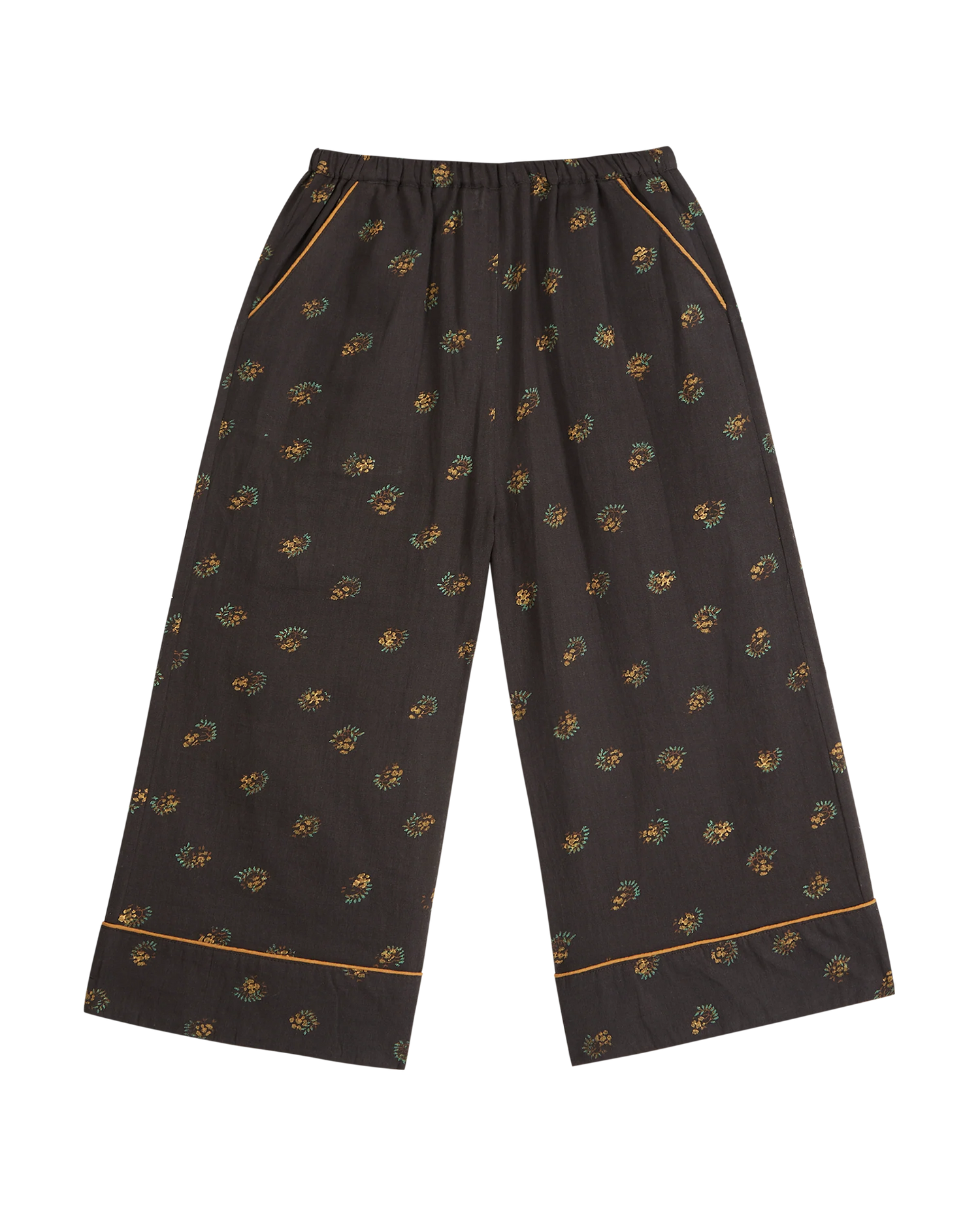 Pyjama en coton imprimé de motifs végétaux en all-over sur fond gris foncé. Le motif, exclusivité Emile & Ida a été dessiné par notre styliste Mélanie qui s'est inspirée des groseilliers du jardin de son père. Une veste à manches longues avec un petit col tailleur et une poche sur la poitrine. Elle se ferme avec des boutons en nacre naturelle sur toute la hauteur. Le pantalon coupe wide pour être à l'aise est monté sur une ceinture élastiquée. Il est agrémenté de deux poches italiennes et d'une poche sur les fesses brodée en blanc du monogramme de la marque. Le passepoil caramel souligne la patte de boutonnage et les poches, le col, les poignets et les chevilles. Il se range dans une pochette brodée au monogramme de Emile et Ida. Ce pyjama à un pouvoir magique : il suffit de l'enfiler pour faire de beaux rêves !