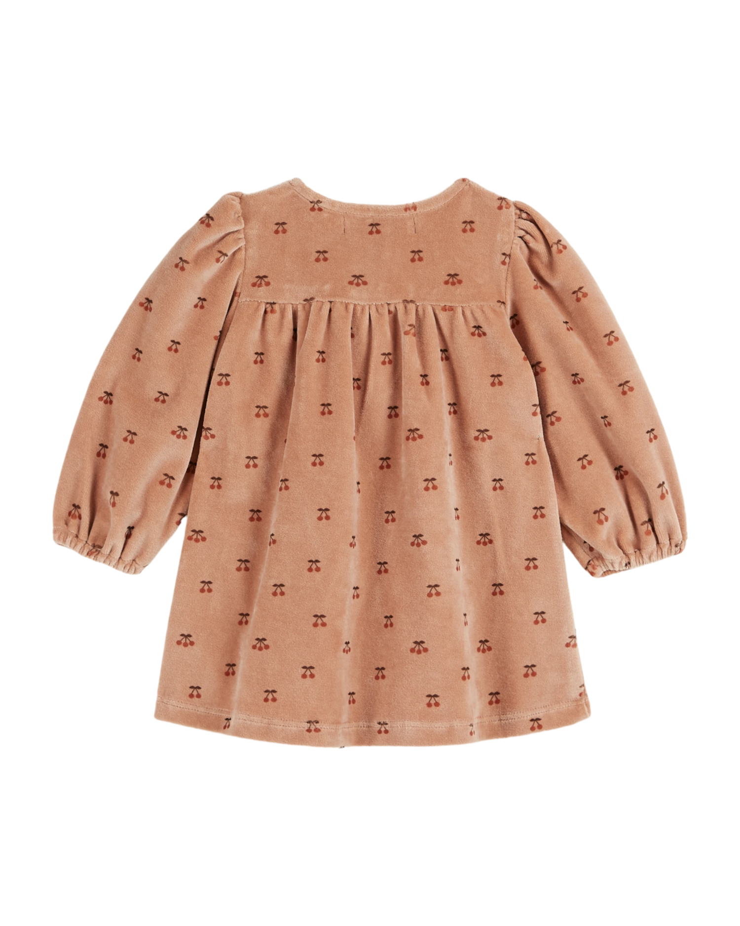 On aime tout dans cette robe : la forme évasée, l'empiècement qui soutient le corps de la robe froncé, l'ouverture et ses trois boutons en nacre naturelle qui permet de largement passer le tête sans arracher les oreilles, les deux poches plaquées et les poignets élastiqués qui ne laissent pas le froid remonter le long des bras.