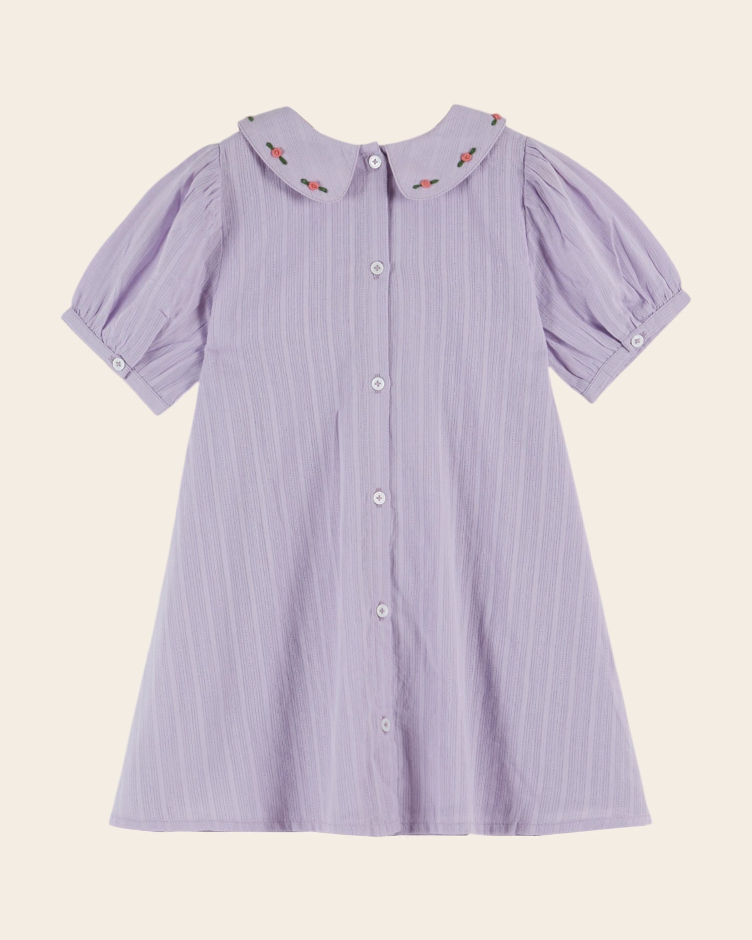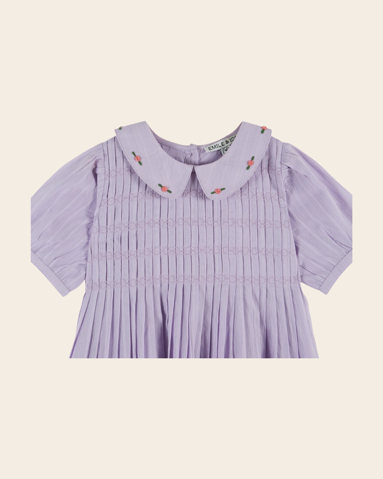 Robe en voile de coton biologique mauve ligné de mini ours échelle. Confectionnée dans un tissu léger, cette robe est entièrement doublée afin d'en contrer la transparence.