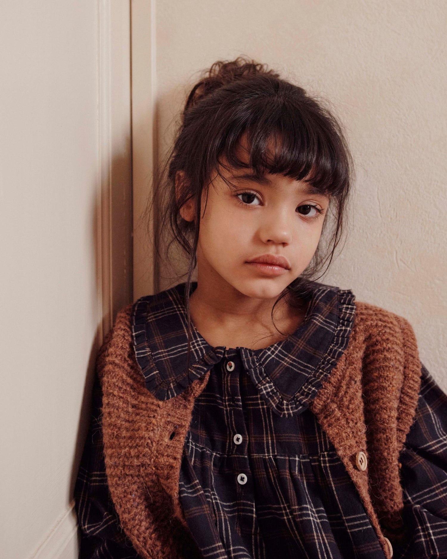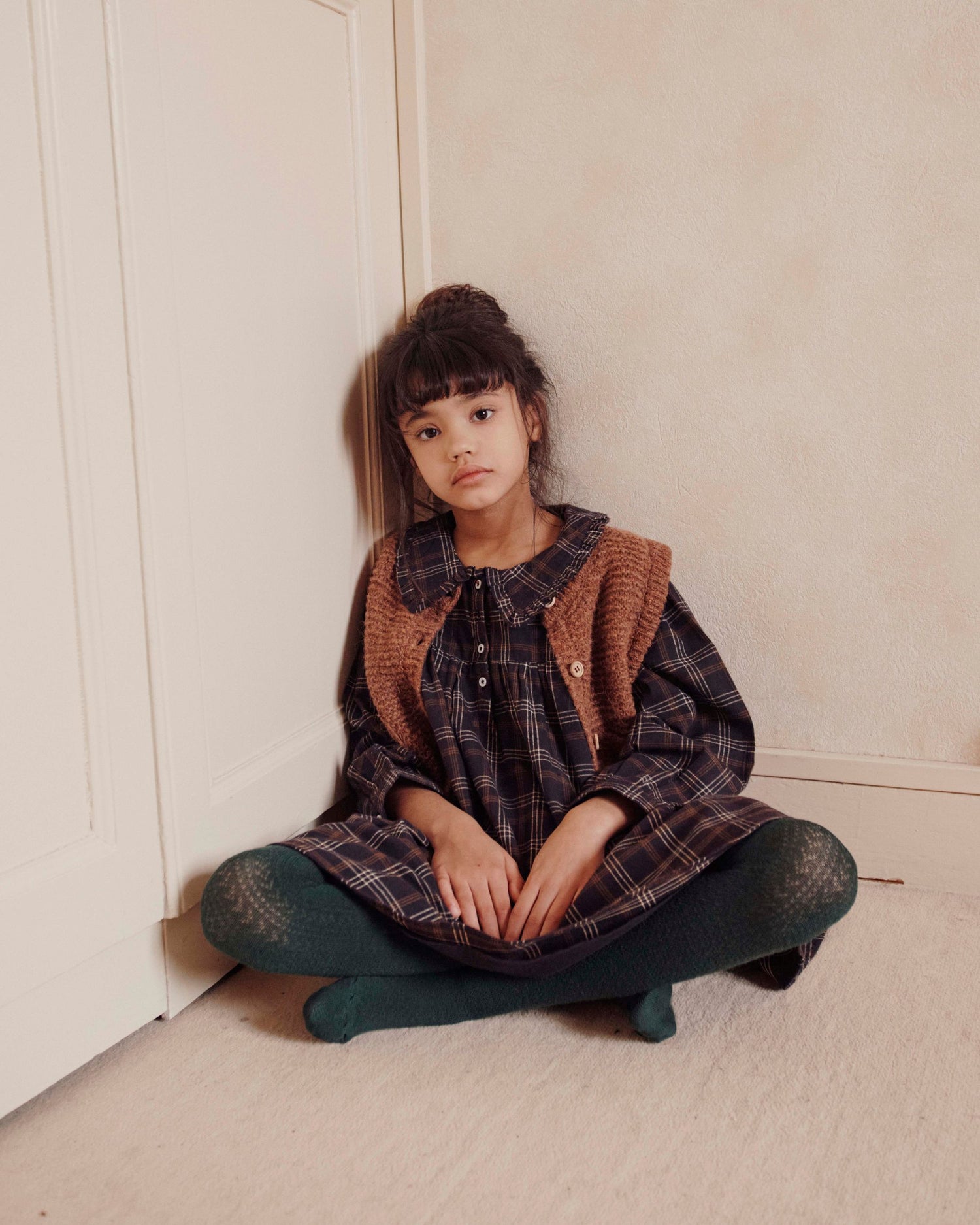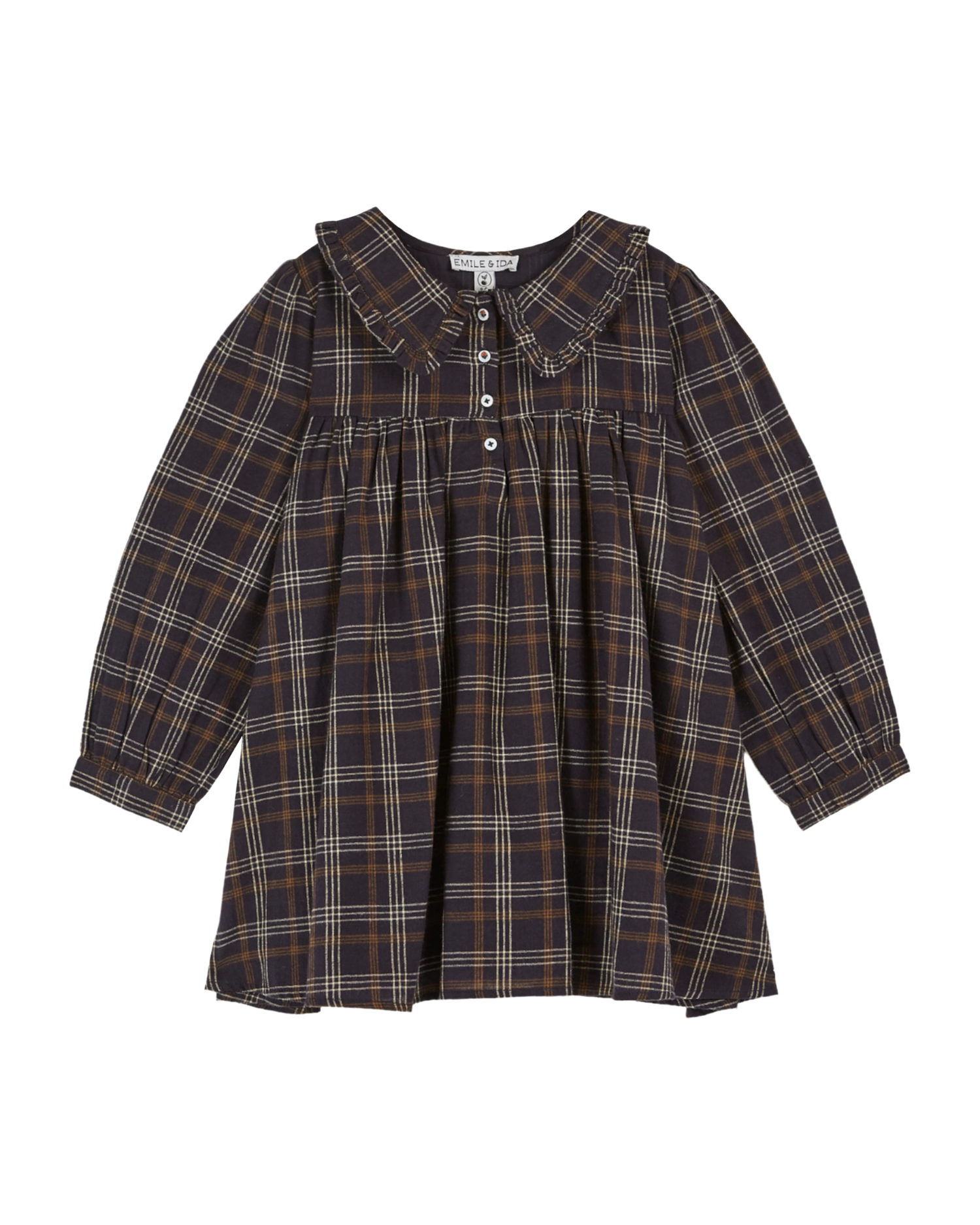 Robe en coton bitume sur lequel s'entrecroisent des lignes verticales et horizontales blanches et marron. Vous aimerez la matière toute douce et la forme ample que procurent les fronces soutenues par les empiècements devant et dos. Manches longues resserrées par une manchette boutonnée, patte de boutonnage sur la hauteur de l'empiècement accompagnée de ses boutons en nacre naturelle et le col plat agrémenté d'un petit volant. Vient ensuite le détail qui rend cette robe unique : les fleurs brodées à la main sur les boutons. Puis le détail que vous ne voyez pas : les assemblages sont exécutés en couture anglaise ce qui prolonge la durée de vie de la robe. Il est possible de la porter comme une robe courte ou comme une tunique sur un pantalon ou un legging pour faire la belle !
