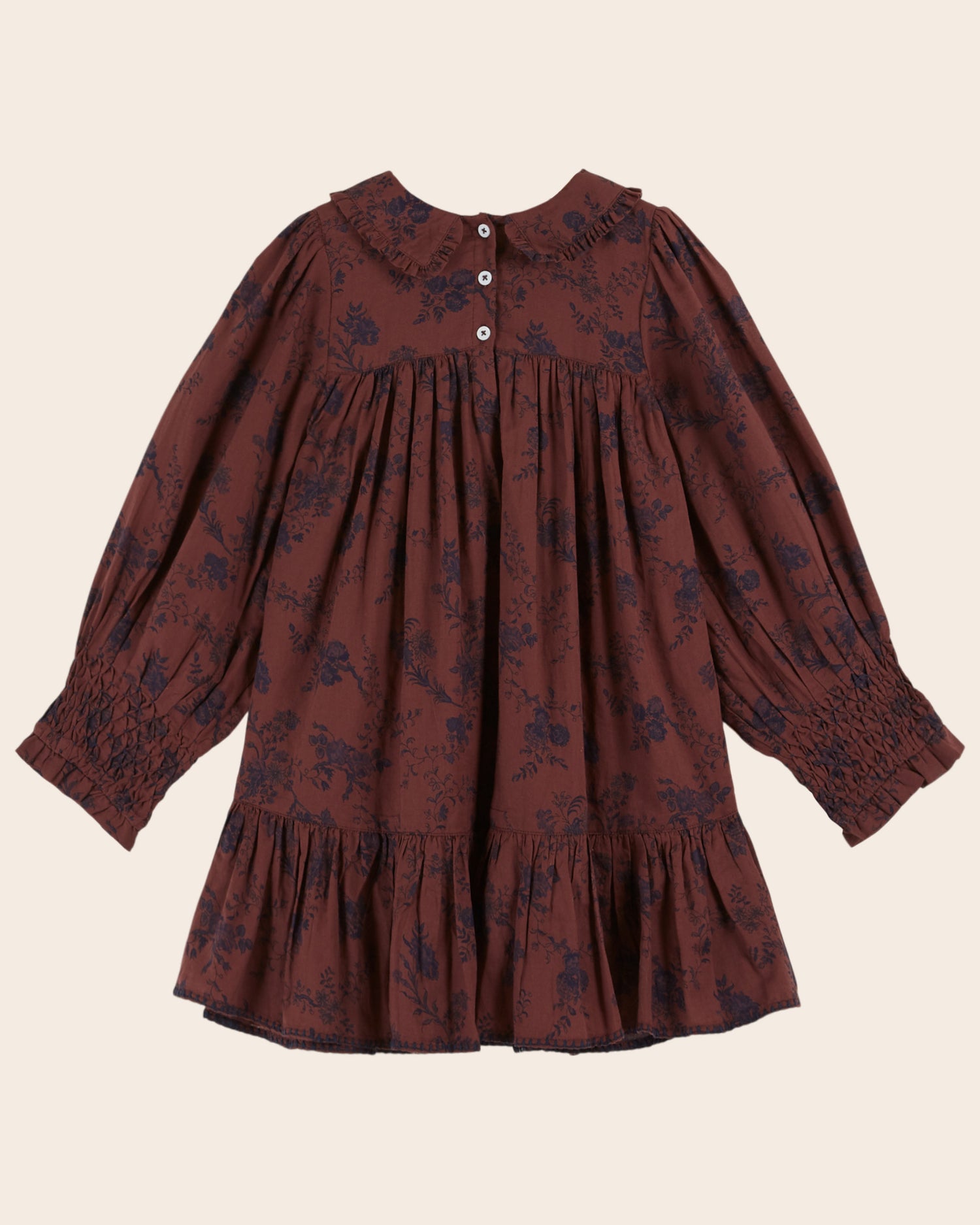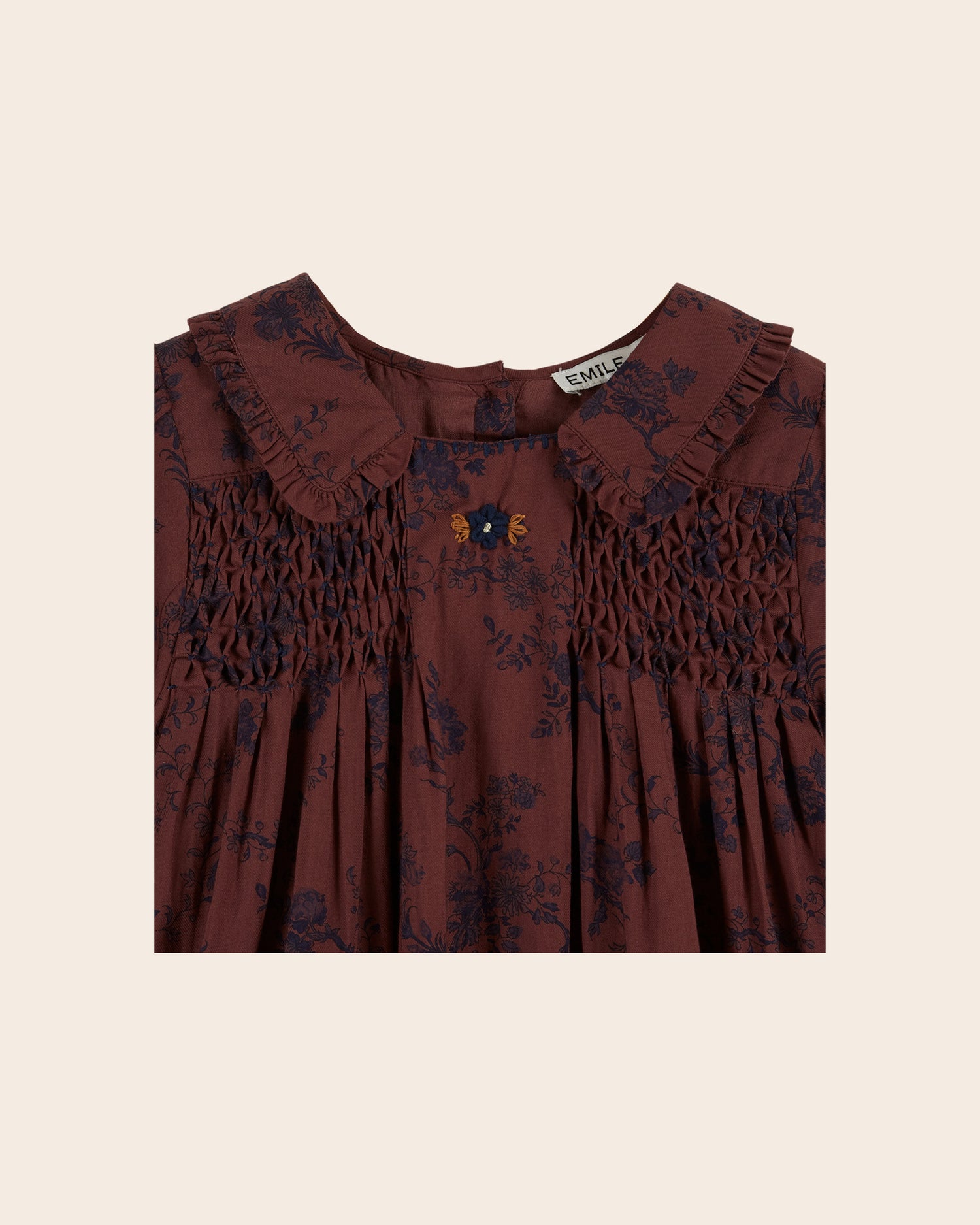 Robe en flanelle de coton smockée et volantée, ornée de fleurs bleues sur fond violine. - Smocks sur la poitrine et aux poignets - Fleur bleue brodée main au centre - Coupe ample - Col pointu rehaussé par un volant - Ouverture boutonnée dans le dos - Doublure en voile de coton - Bas de robe volanté