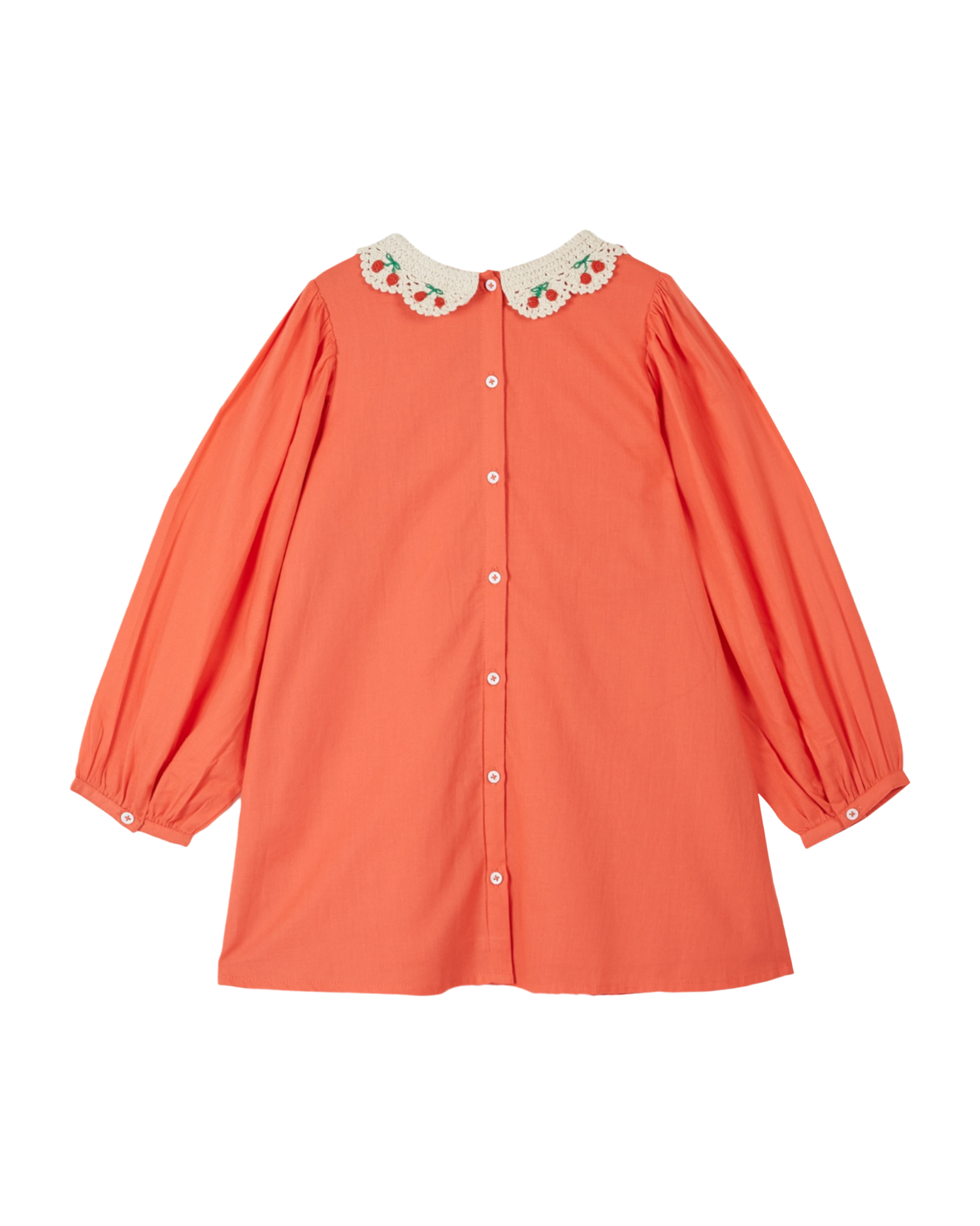 Robe en coton vermillon. À l'inverse du dos plat, le devant de la robe est délicatement travaillé. Des plis couchés en rythment toute la hauteur et toute la largeur. Ils sont retenus, jusque sous la poitrine, par trois lignes de smocks beige. A partir de la dernière ligne les plis sont libres et la robe exprime toute son ampleur. Le col festonné qui ceint l'encolure ronde est crocheté dans un fil de coton écru et rebrodé de bouquets de cerises rouge vermillon. Les manches sont longues et resserrées par une fine manchette boutonnée aux poignets. Le chemisier s'ouvre sur toute la hauteur du dos et se ferme, comme les poignets, avec des boutons en nacre naturelle. Une robe à la couleur éclatante et vitaminée à porter les jours de grisaille.