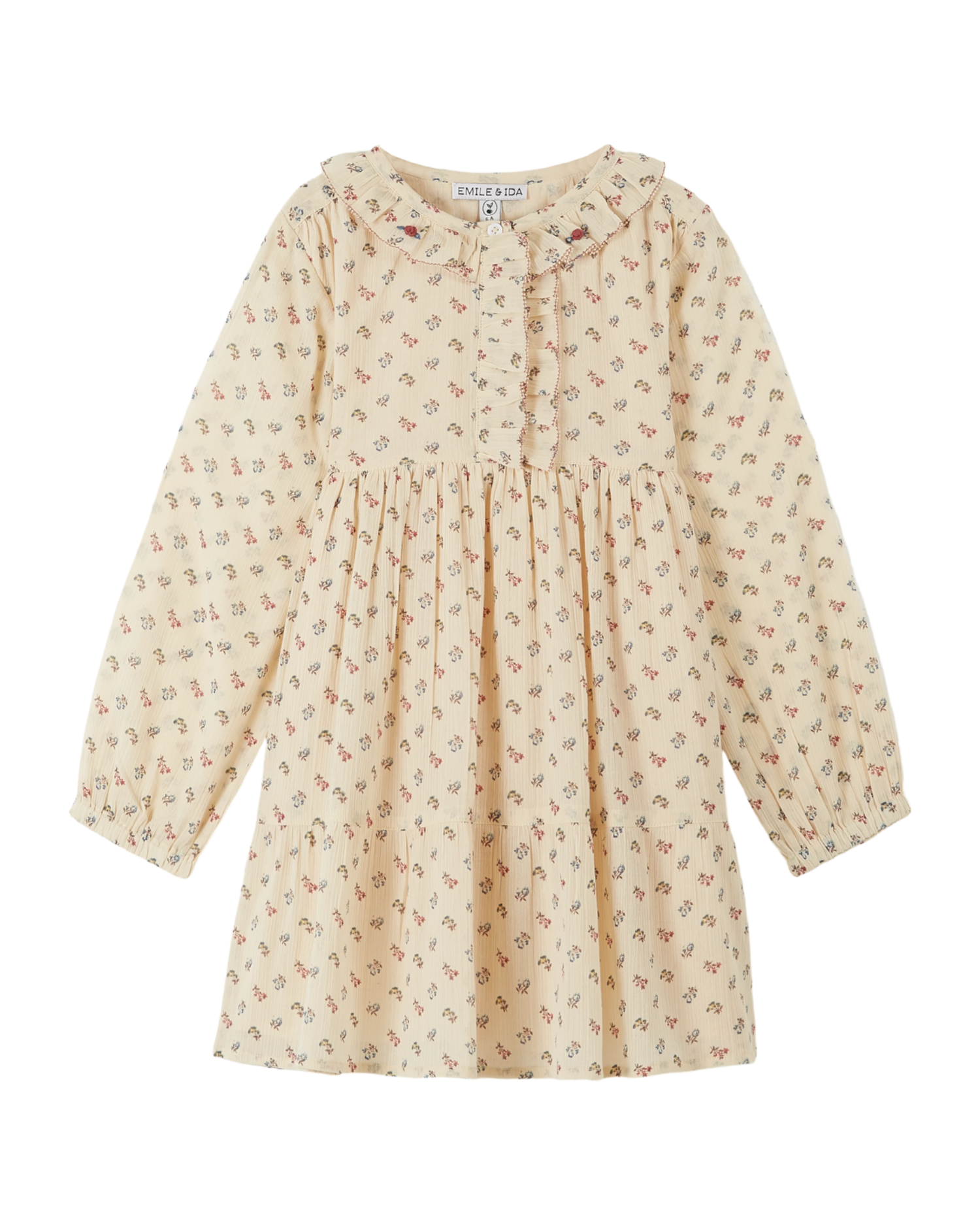Robe en coton créponné écru imprimé en all-over de fleurettes rouges et bleues. Les tout petits empiècement des épaules soutiennent les fronces du corsage. L'encolure ronde est ceinte d'un biais puis d'un volant ourlé au point de picot rouge en guise de col. La patte de boutonnage et ses boutons en nacre naturelle, sur toute la hauteur du corsage, est dissimulée sous deux volants lui qui se chevauchent, eux aussi ourlés au point de picot rouge. Les fronces de la jupe rattachées au corsage à la taille puis le large étage du bas donnent à la robe une belle ampleur. Les manches longues sont resserrées aux poignets par un élastique caché qui laissera largement passer les petites mains les plus dodues.