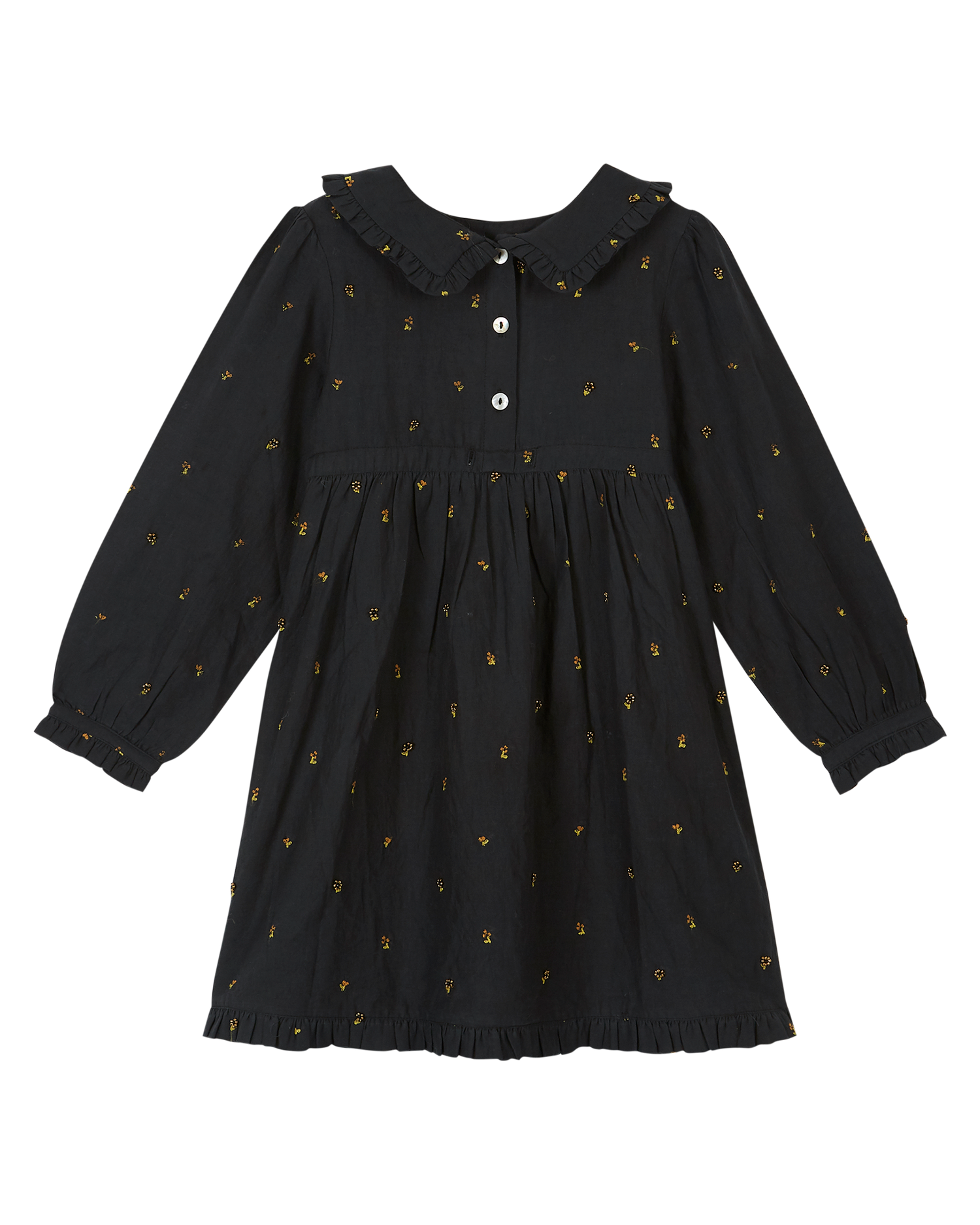 Robe à manches longues en twill de coton bitume à perles. La matière souple, légère et douce se pare de l'imprimé petites fleurs faites de perles, une exclusivité Emile et ida. La tonalité des couleurs bitume et doré fait référence aux couleurs traditionnelles de Noël. On apprécie le travail des artisans indiens qui ont exécuté à la main les fleurs en perles sur l'ensemble de la robe. On aime les détails : la collerette et les boutons en nacre naturelle, qui définissent cette robe à la coupe ample.
