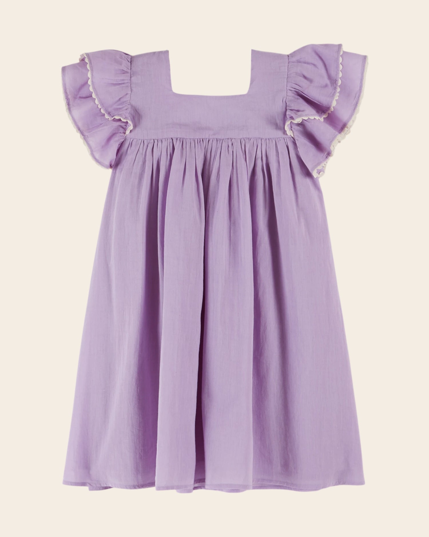 Robe en voile de coton biologique mauve. Confectionnée dans un tissu léger, cette robe est entièrement doublée afin d'en contrer la transparence.