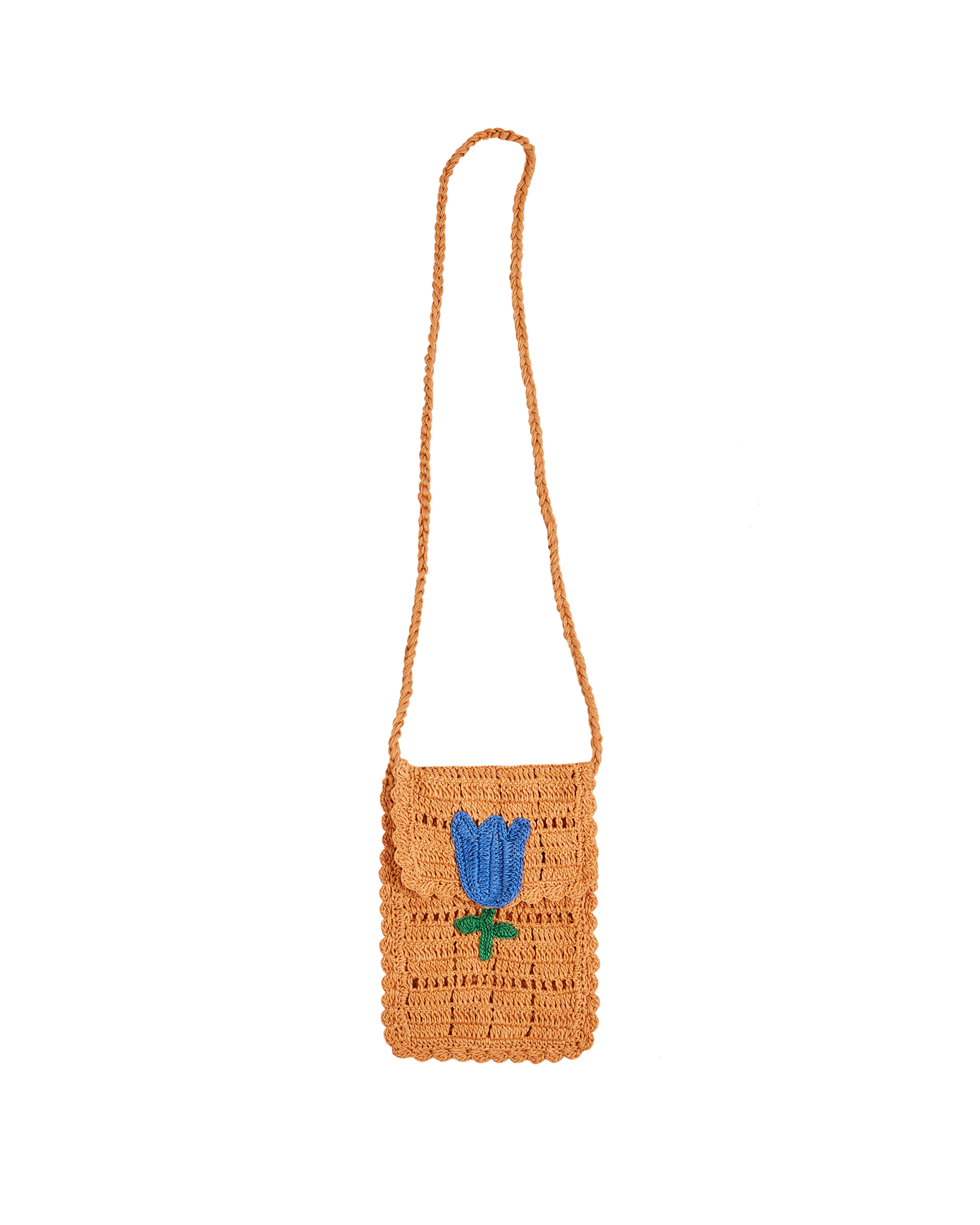 Pochette en coton naturel orangé. Ce mini sac est crocheté en mailles plus ou moins ajourées et une tulipe bleue est cousue sur le rabat pressionné qui ferme l'ouverture. Vous y rangerez vos clés, vos papiers et bien évidemment votre précieux. Porté en bandoulière, vous aurez toujours vos objets de première nécessité à portée de main.