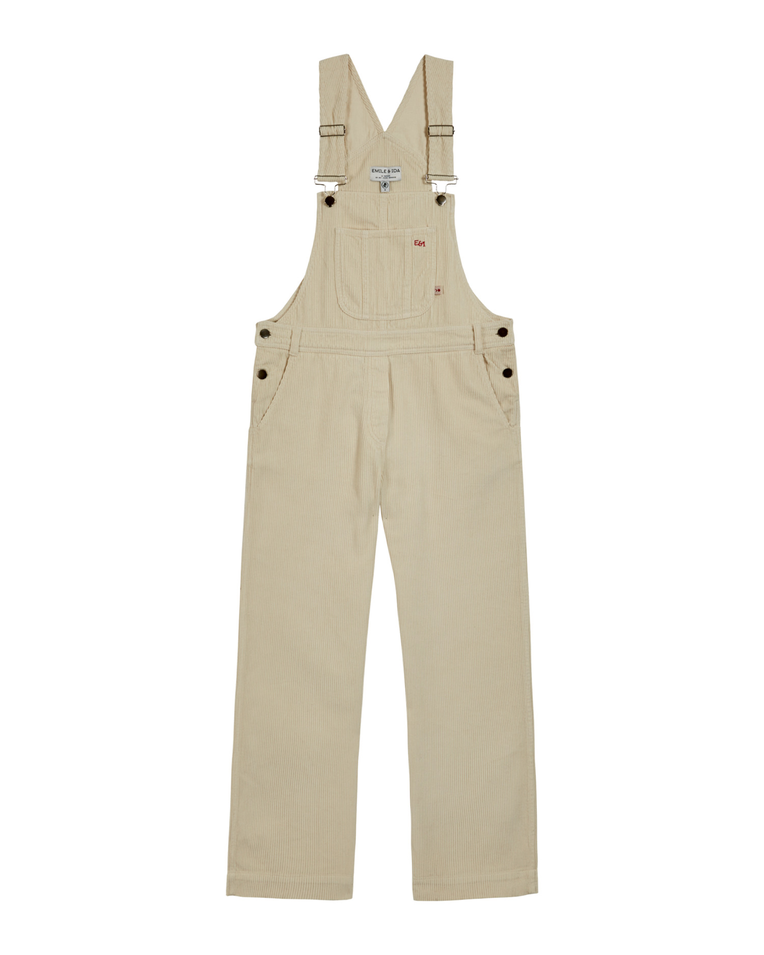 Salopette en velours de coton côtelé écru. On aime la matière douce, souple et chaude de cette salopette à la coupe boyfriend large, au dos remontant et aux bretelles en Y ajustables. La ceinture marque la taille entre le pantalon et la bavette sur laquelle s'attachent les bretelles. La bavette est ornée d'une grande poche brodée du monogramme Emile & Ida, parfaite pour y glisser son téléphone ou quelques bricoles. Deux autres poches sur les fesses, plaquées et surpiquées, accueilleront les mains et encore d'autres bricoles. Les deux ouvertures sur les côtés se ferment avec des boutons mécaniques et facilitent l'habillage. Une salopette qui se laisse adopter dès lors que vous la caressez dans le sens du poil ! Coupe ample.