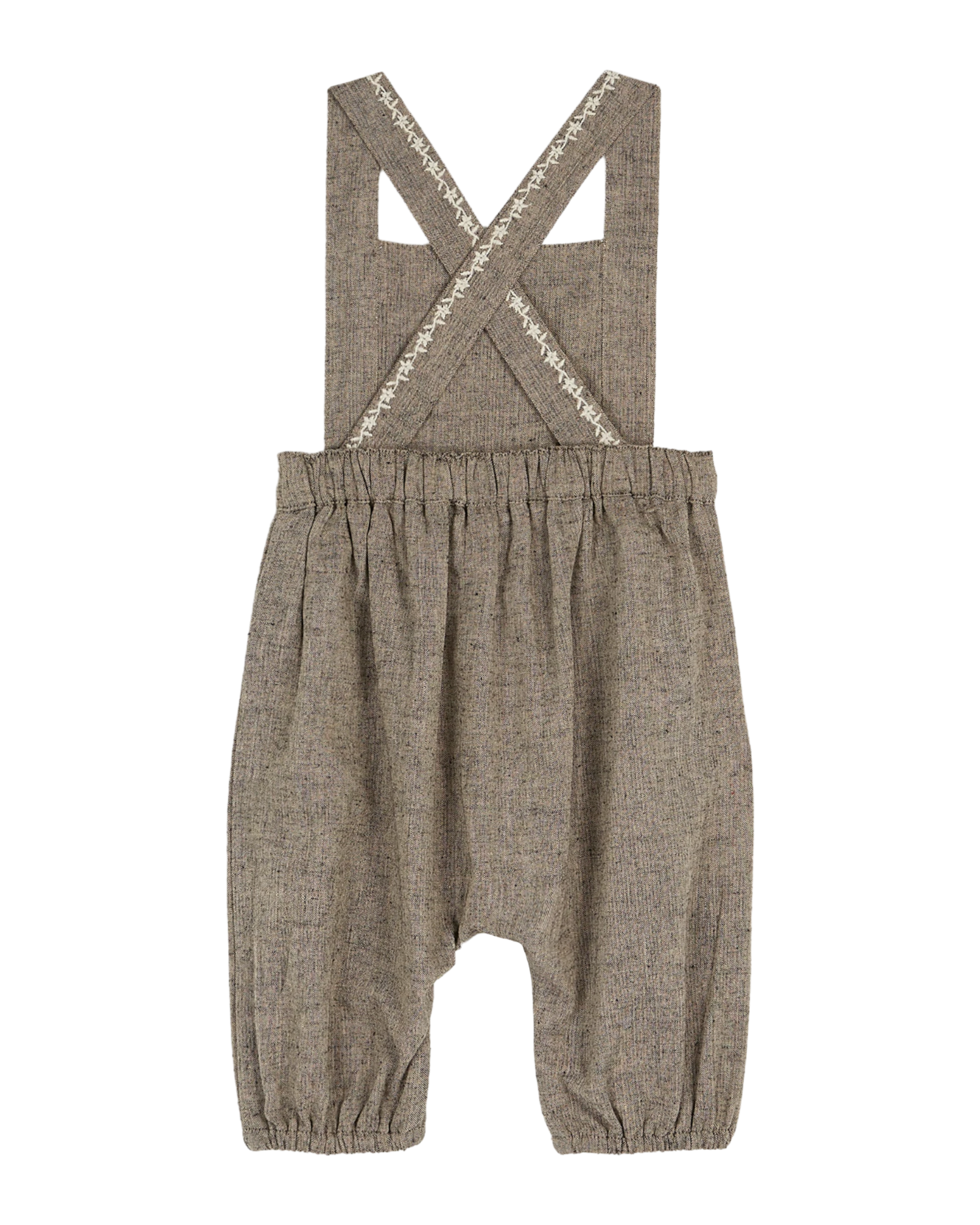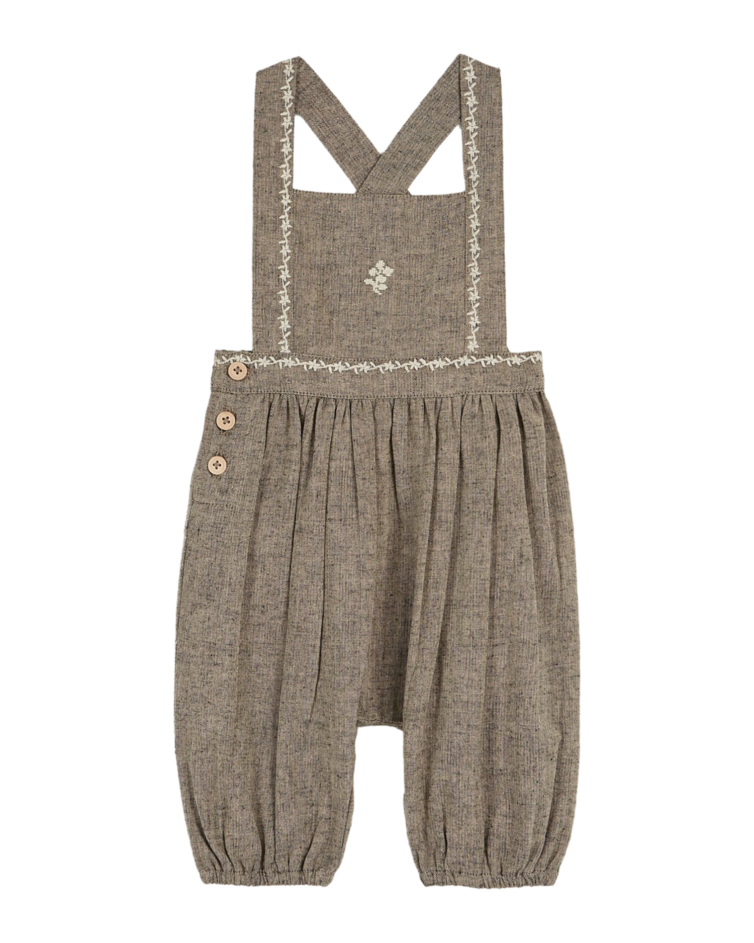 Salopette en coton brun chiné. Le pantalon, dont les jambes sont élastiquées aux chevilles, est froncé à la taille et s'adapte même aux plus dodues et aux plus menues grâce à l'élastique glissé dans la ceinture du dos. La bavette est fixée à la ceinture et est cadrée de chaque côté par les bretelles. Elles se croisent dans le dos et s'ajustent à toutes les longueurs de buste avec des boutons cousus à la ceinture qui se glissent dans des boutonnières étagées.