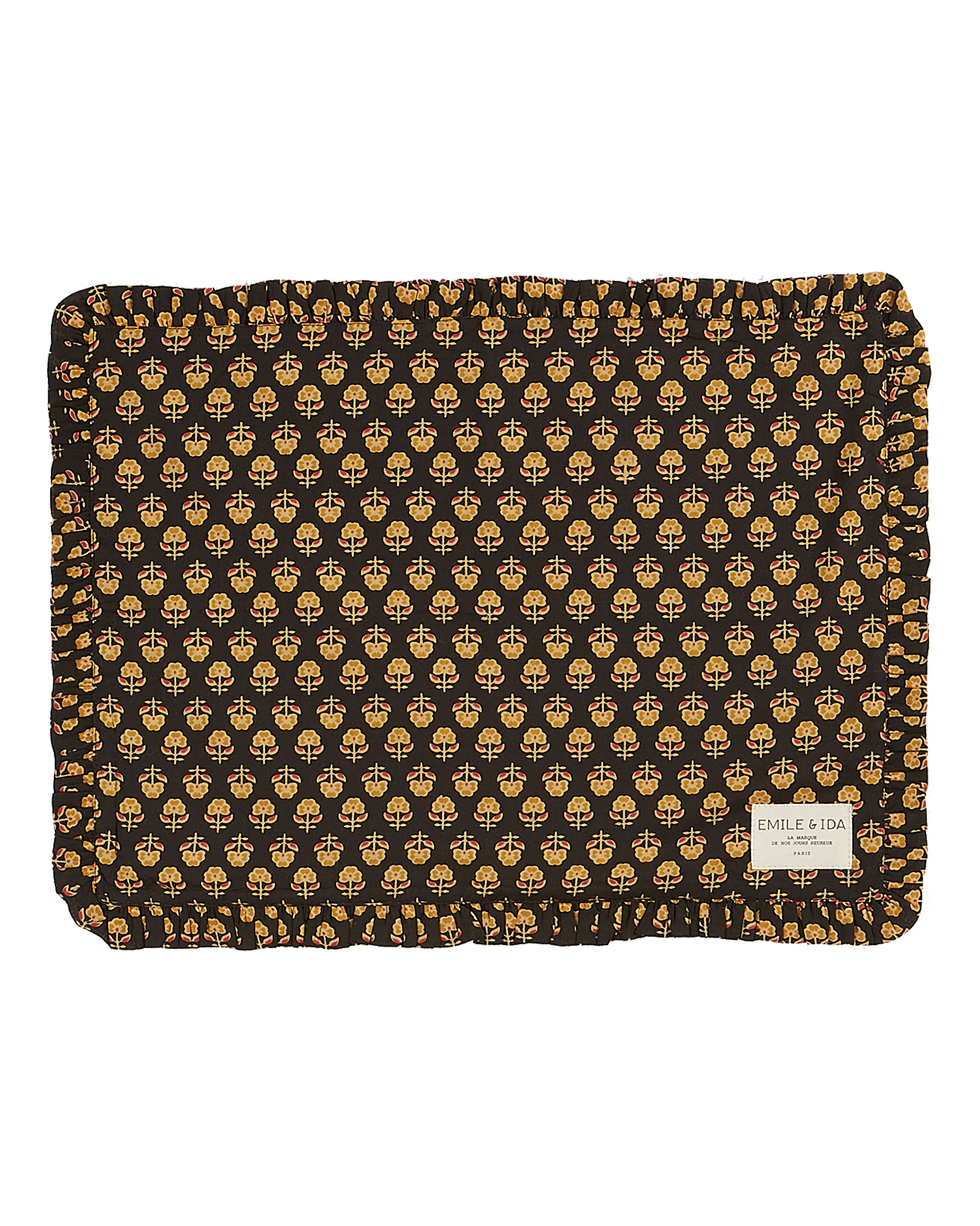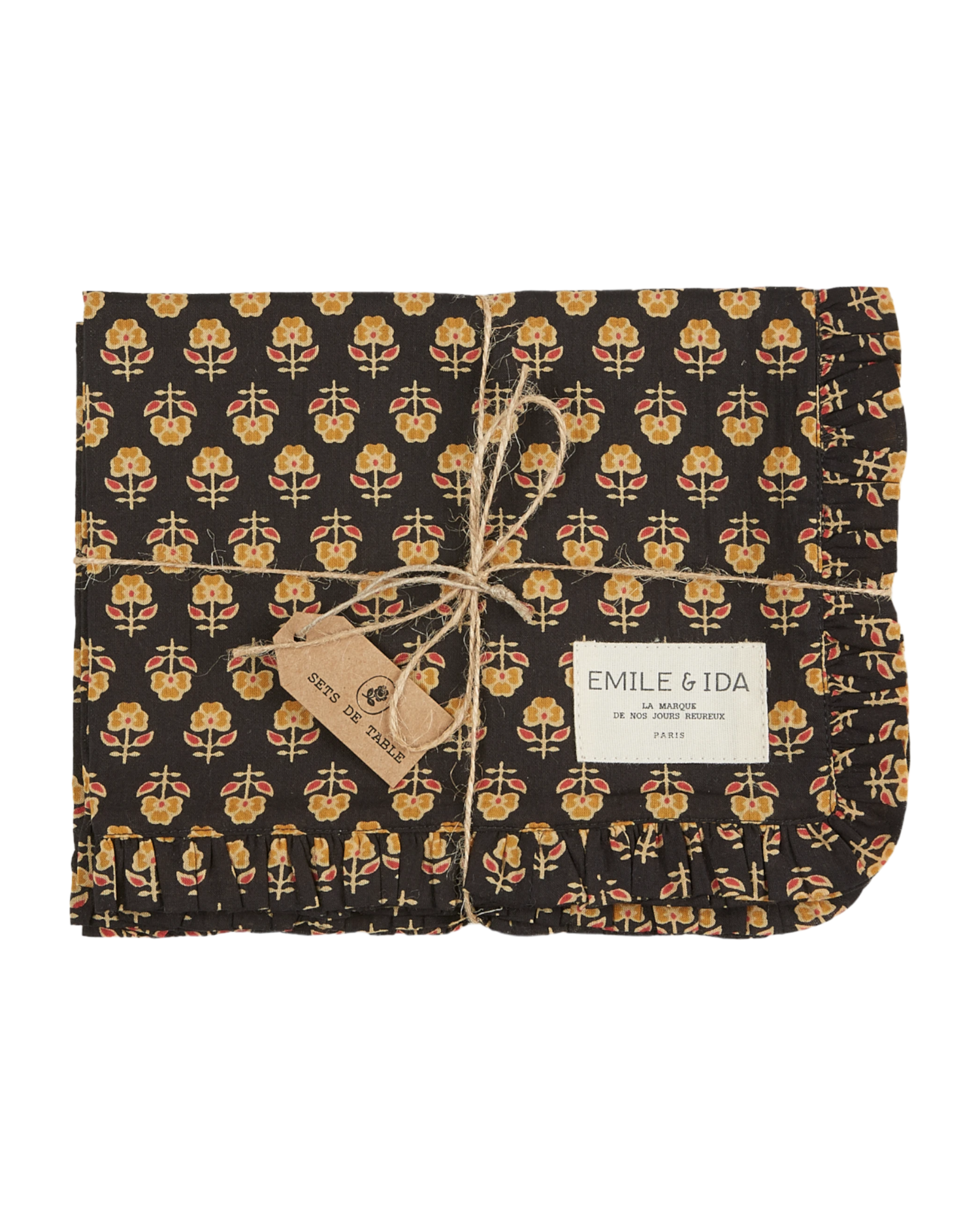 Des sets de table double face en coton noir sur lequel s'épanouissent des fleurs beiges. Ils sont ornés d'un petit volant sur le pourtour. Deux sets de table pour des dîners en tête à tête. Dimensions : 29 x 39 cm