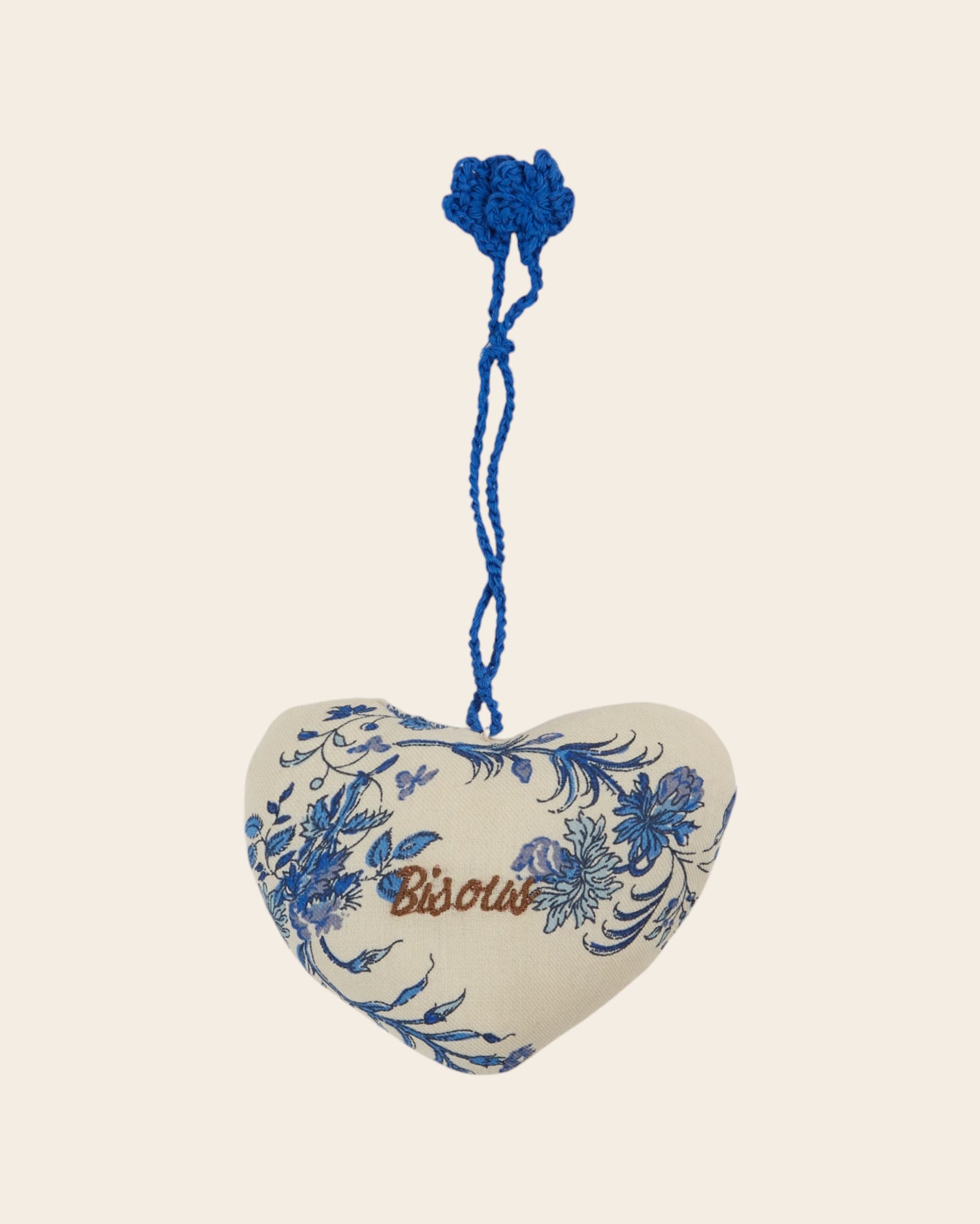 Décoration coeur de Noël en coton écru parsemé de fleurs bleues. Brodée de l'inscription "Bisous", elle est à suspendre aux poignées de fenêtres et de portes, dans le sapin…