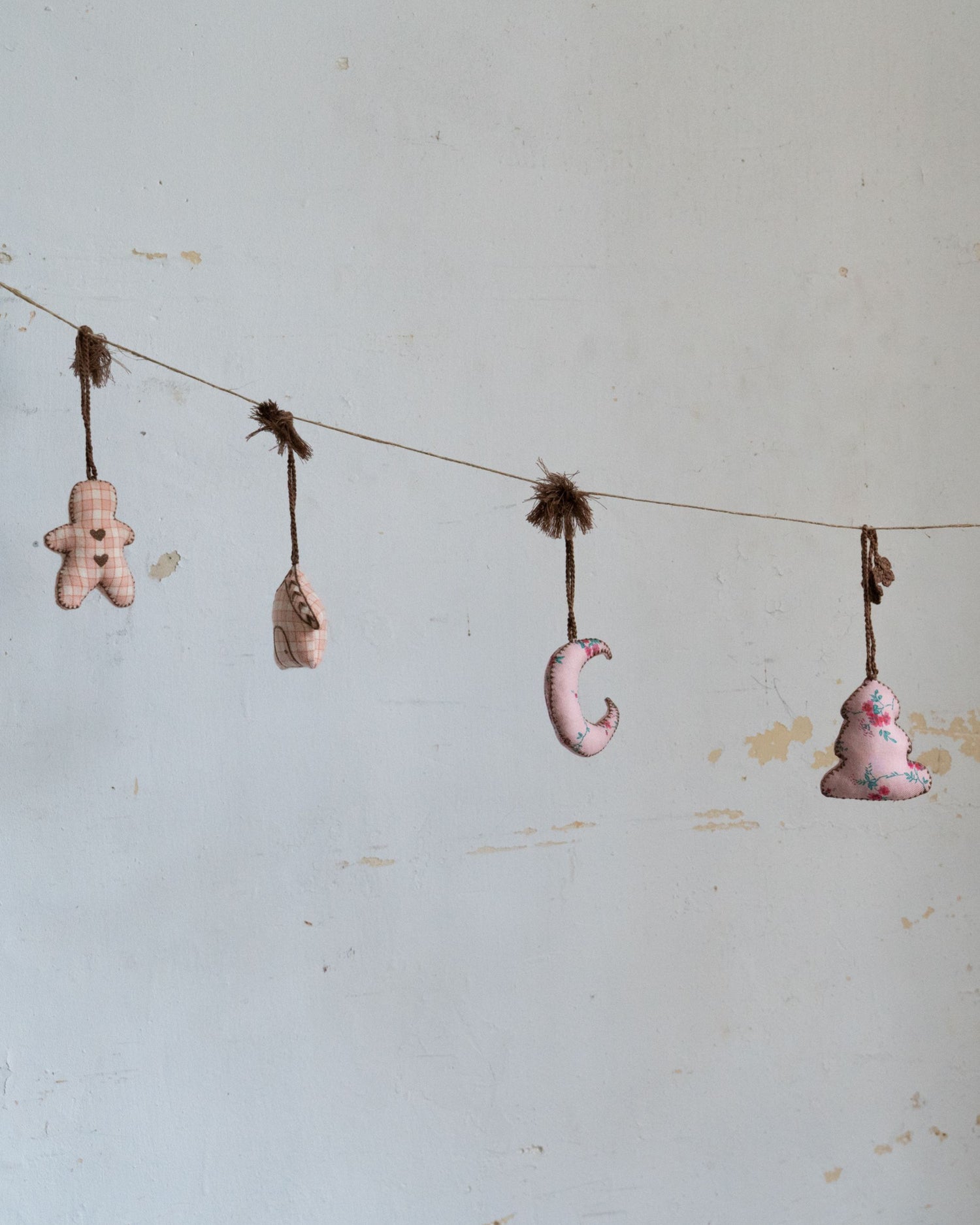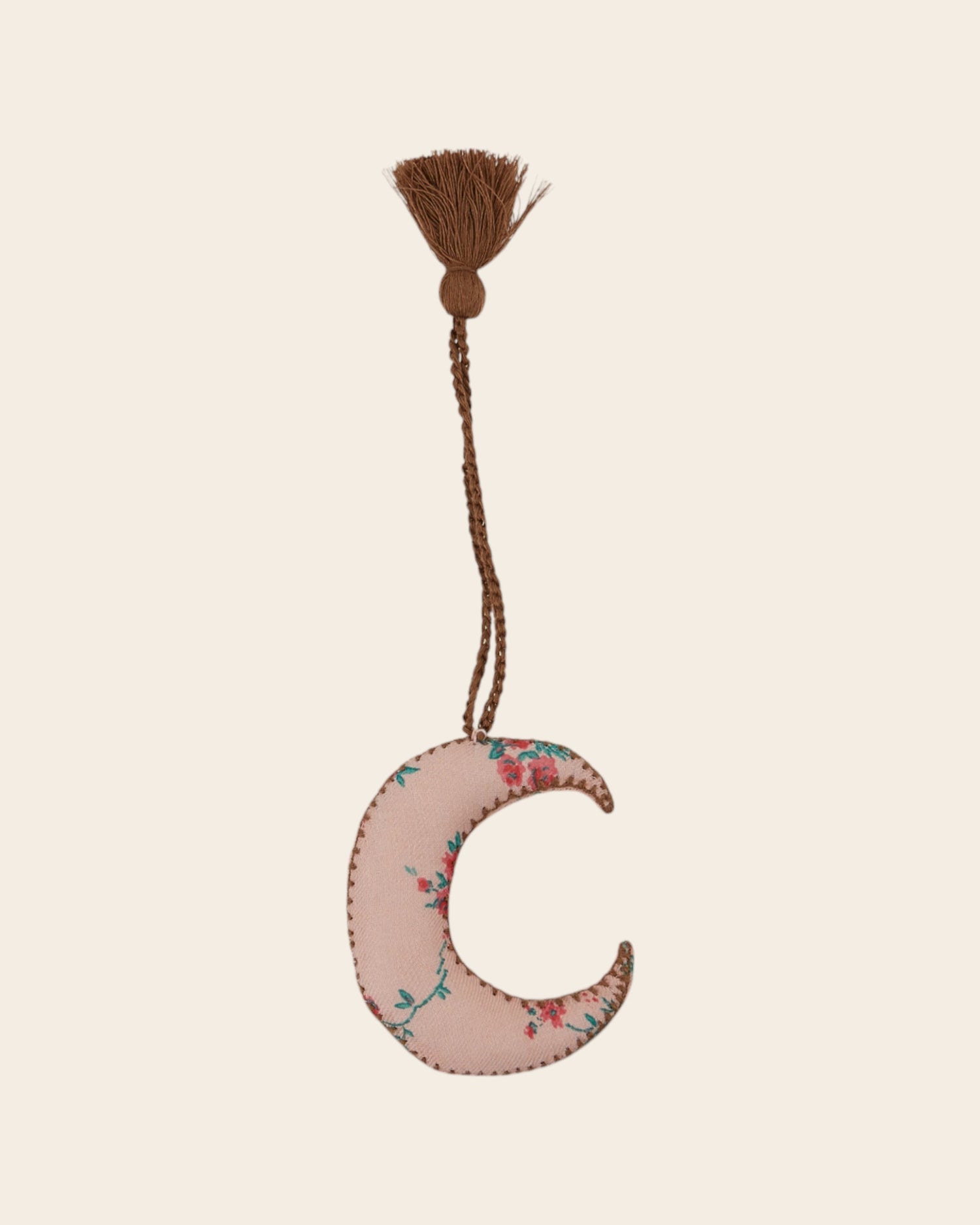 Décoration lune de Noël en coton recouvert de bouquets fleuris sur fond rose. Un croissant de lune à suspendre aux poignées de fenêtres et de portes, dans le sapin…