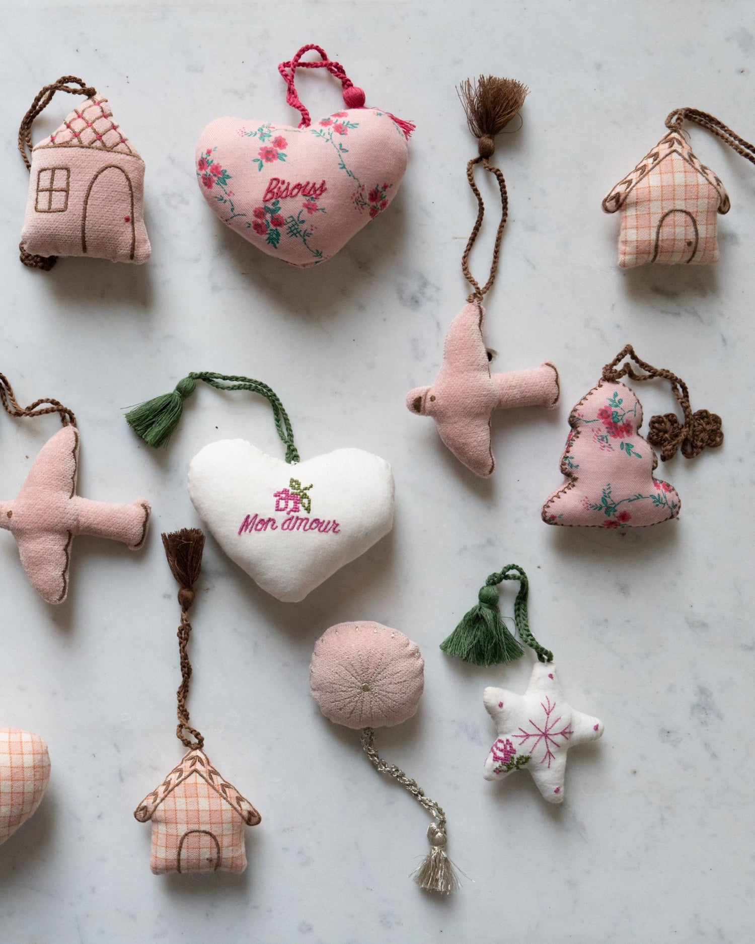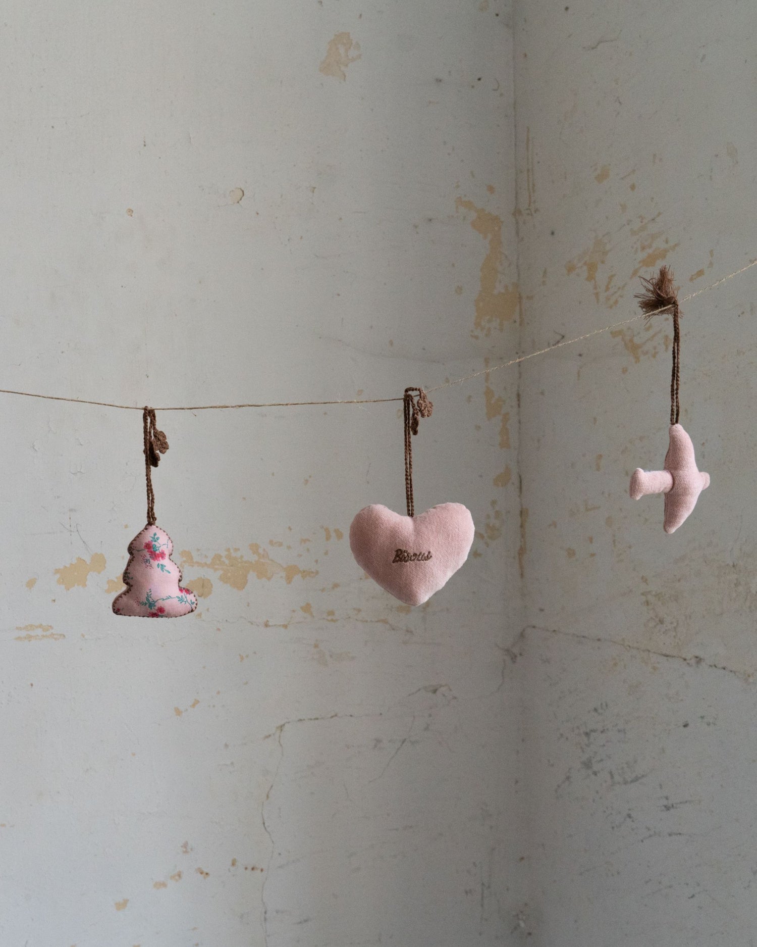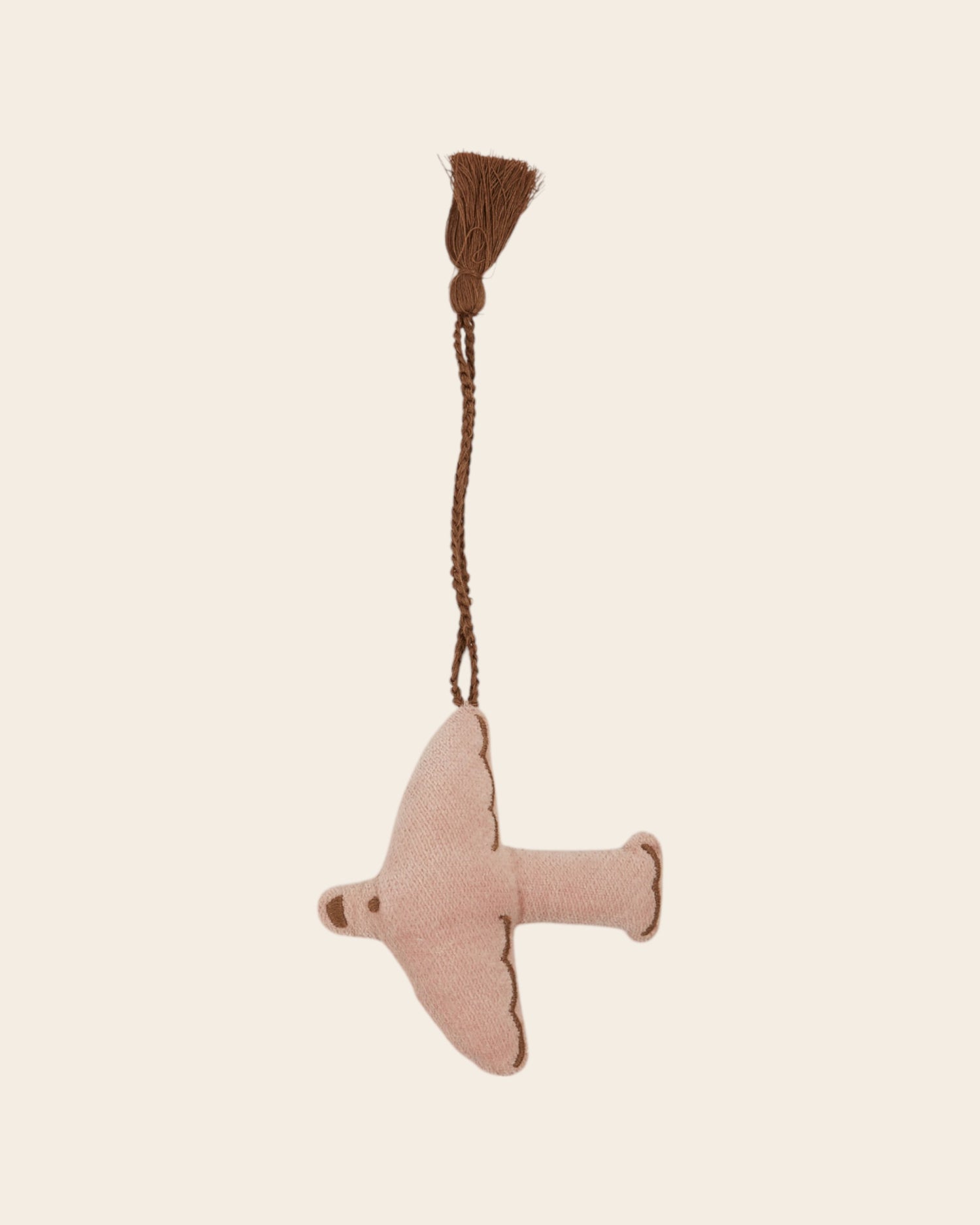 Décoration oiseau de Noël en velours de coton rose pâle. Un oiseau à suspendre aux poignées de fenêtres et de portes, dans le sapin…