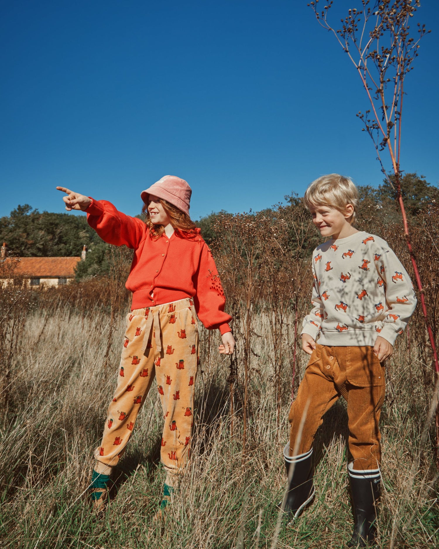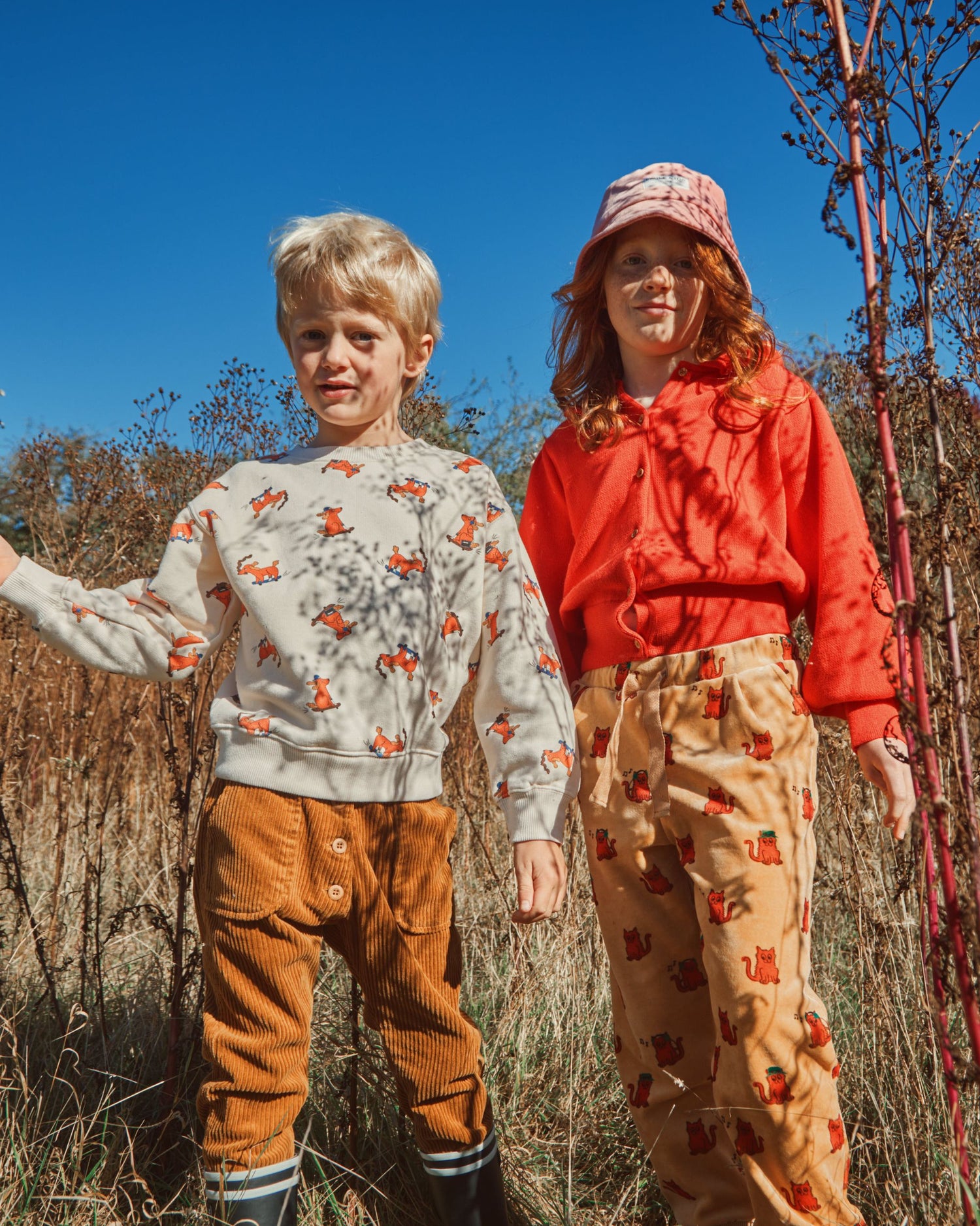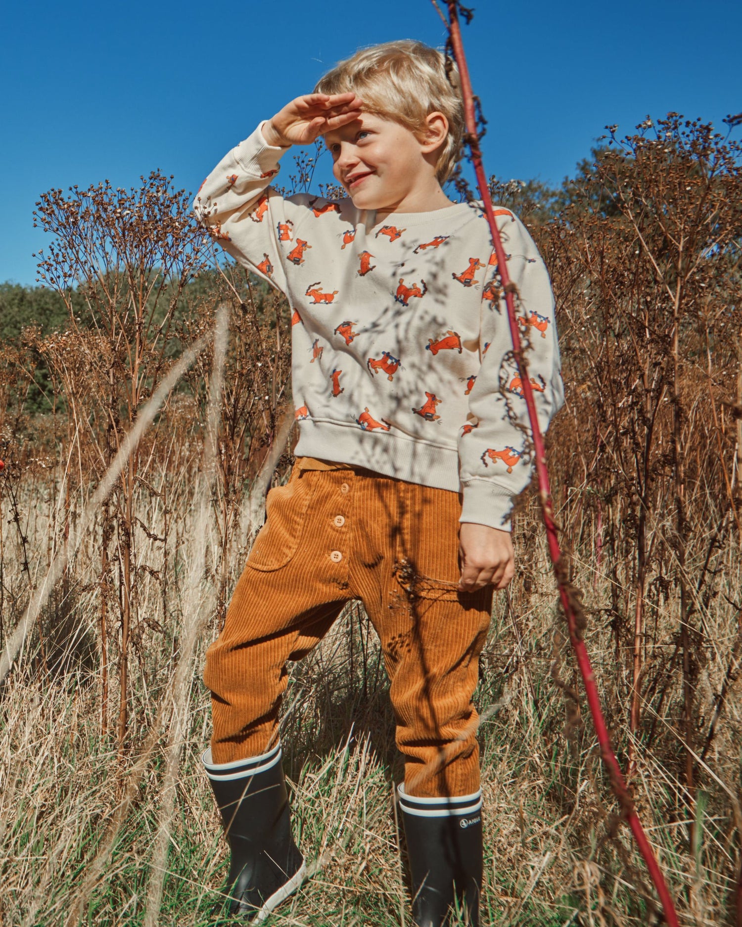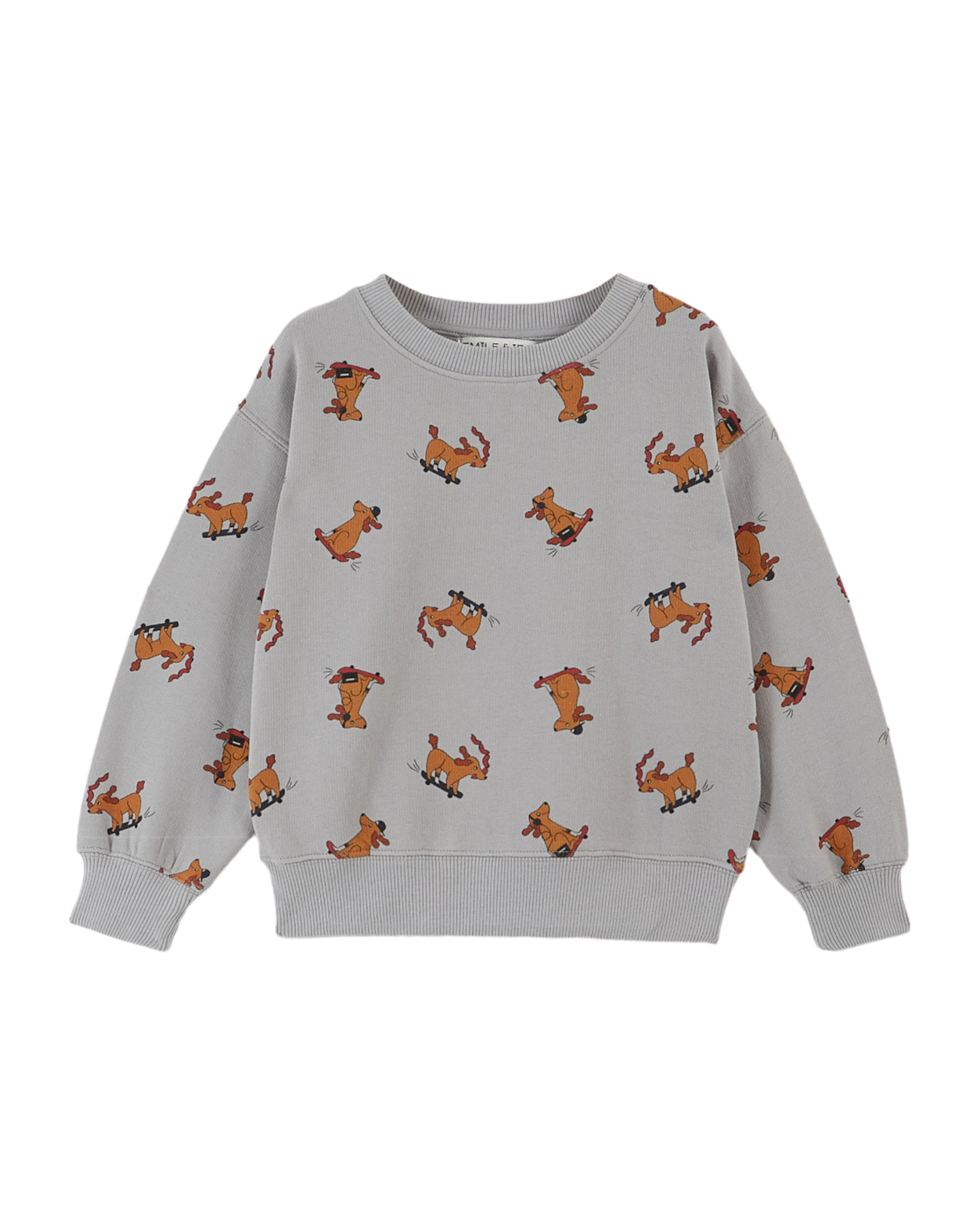Sweatshirt en coton biologique molletonné et gratté écru sur lequel s'amusent des chiens facétieux. Ils font du skateboard assis, debout ou couchés, font des pirouettes ou se sauvent après avoir dérobé un os. Pour confectionner ce sweat nous avons utilisé du molleton gratté car, outre le côté duveteux, cela renforce le pouvoir isolant du coton. Avec le bord-côte qui entoure l'encolure ras du cou, le bas des manches longues et la base c'est bien un sweat confortable.