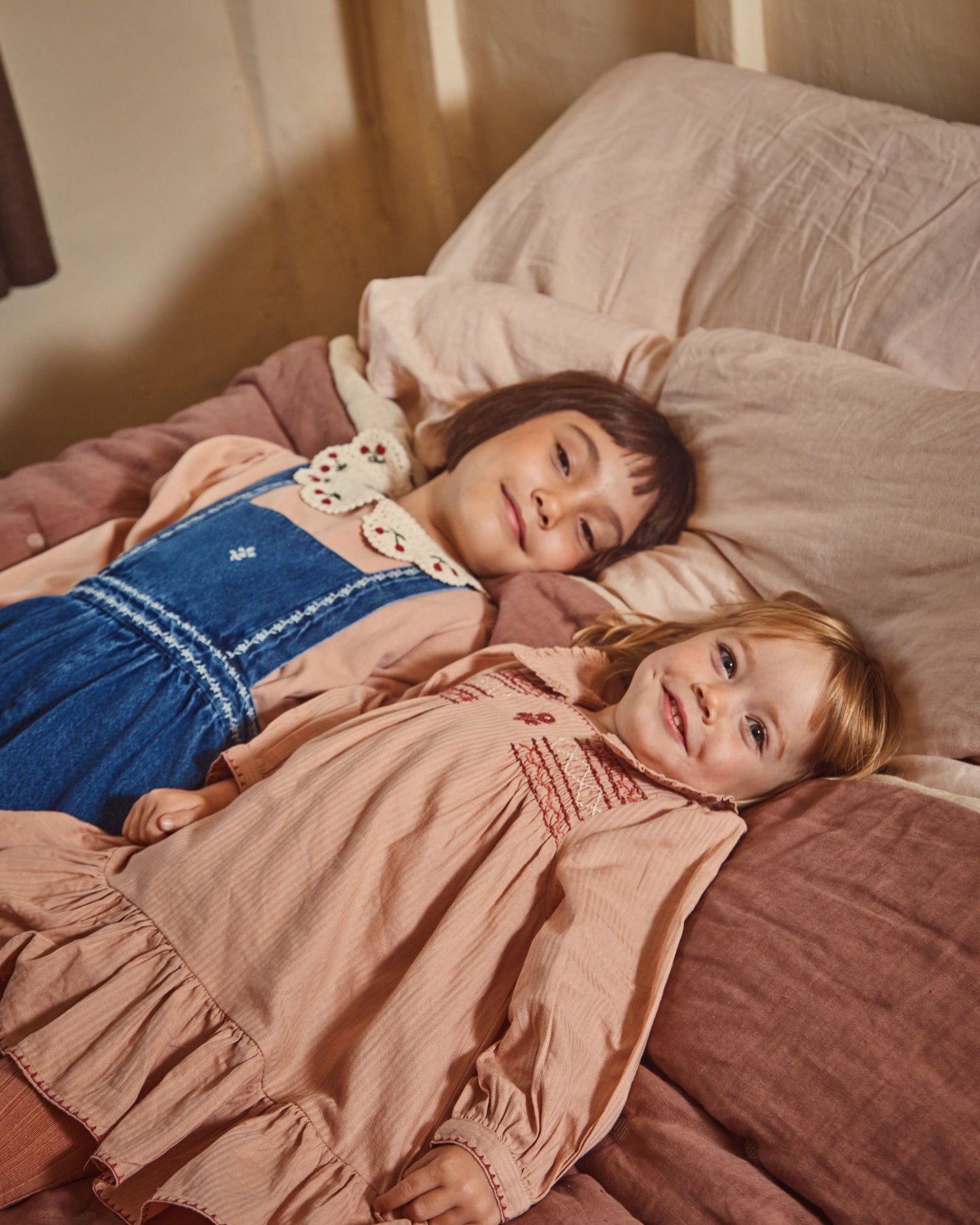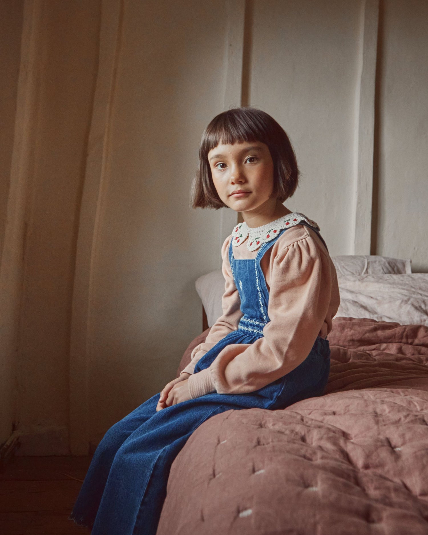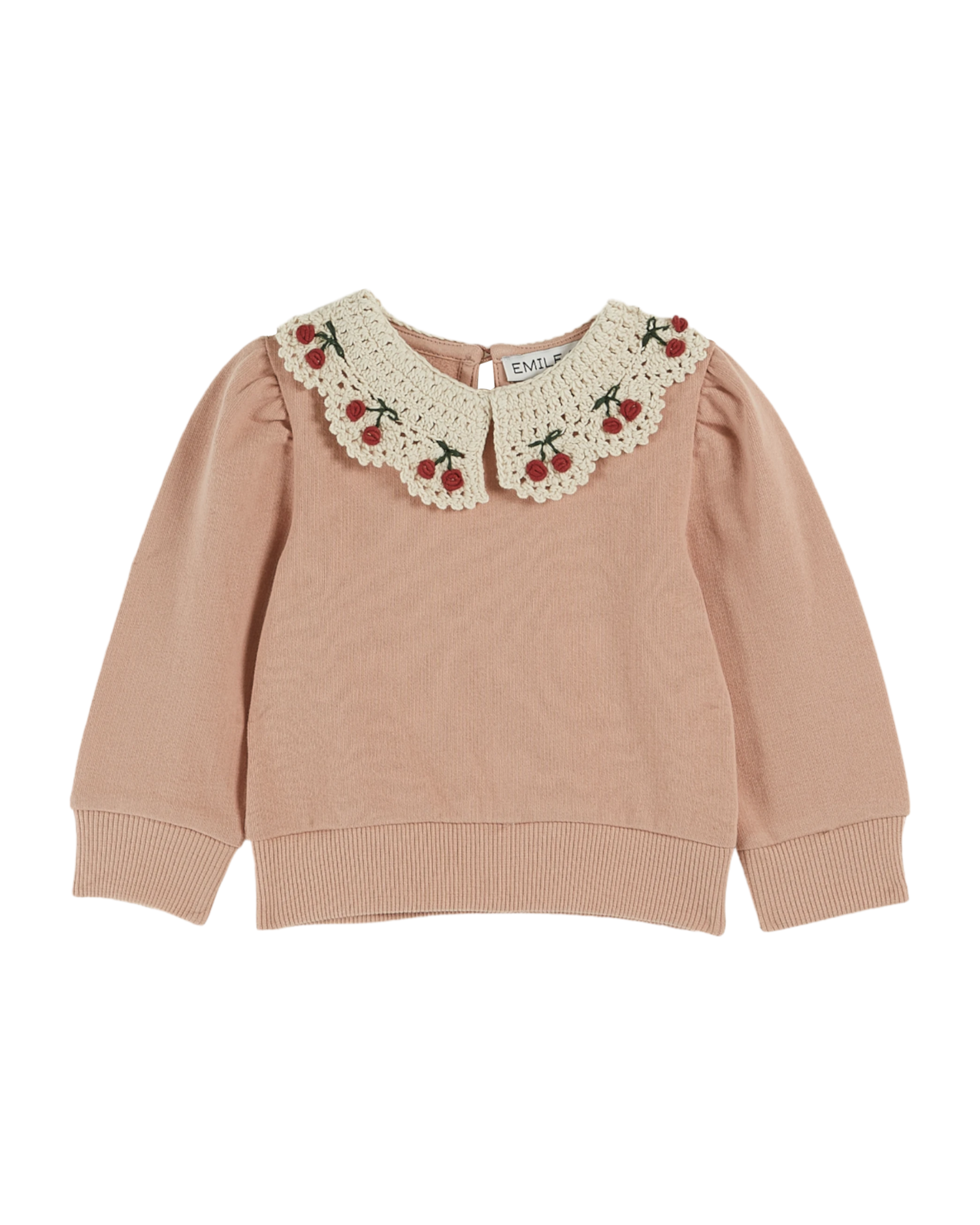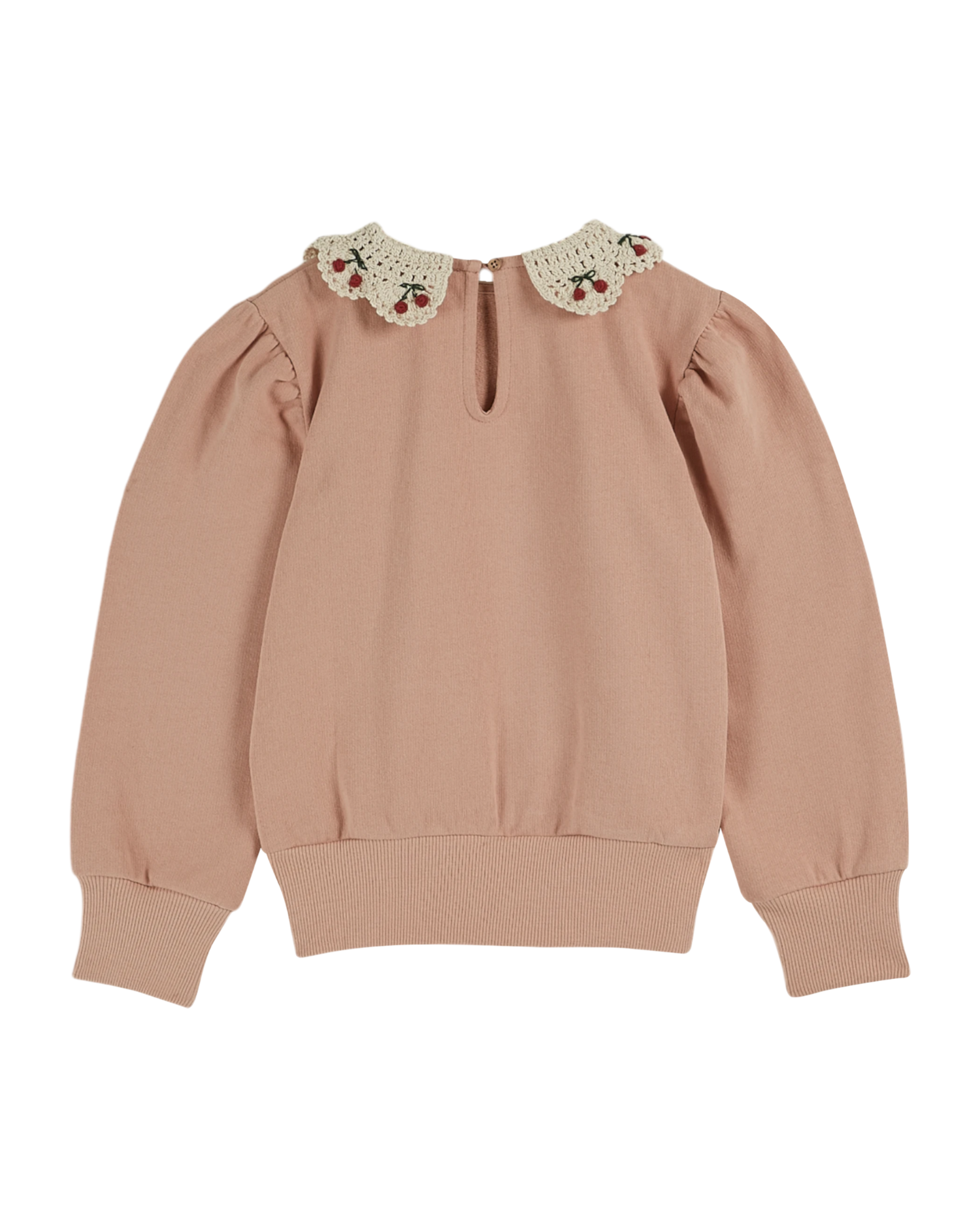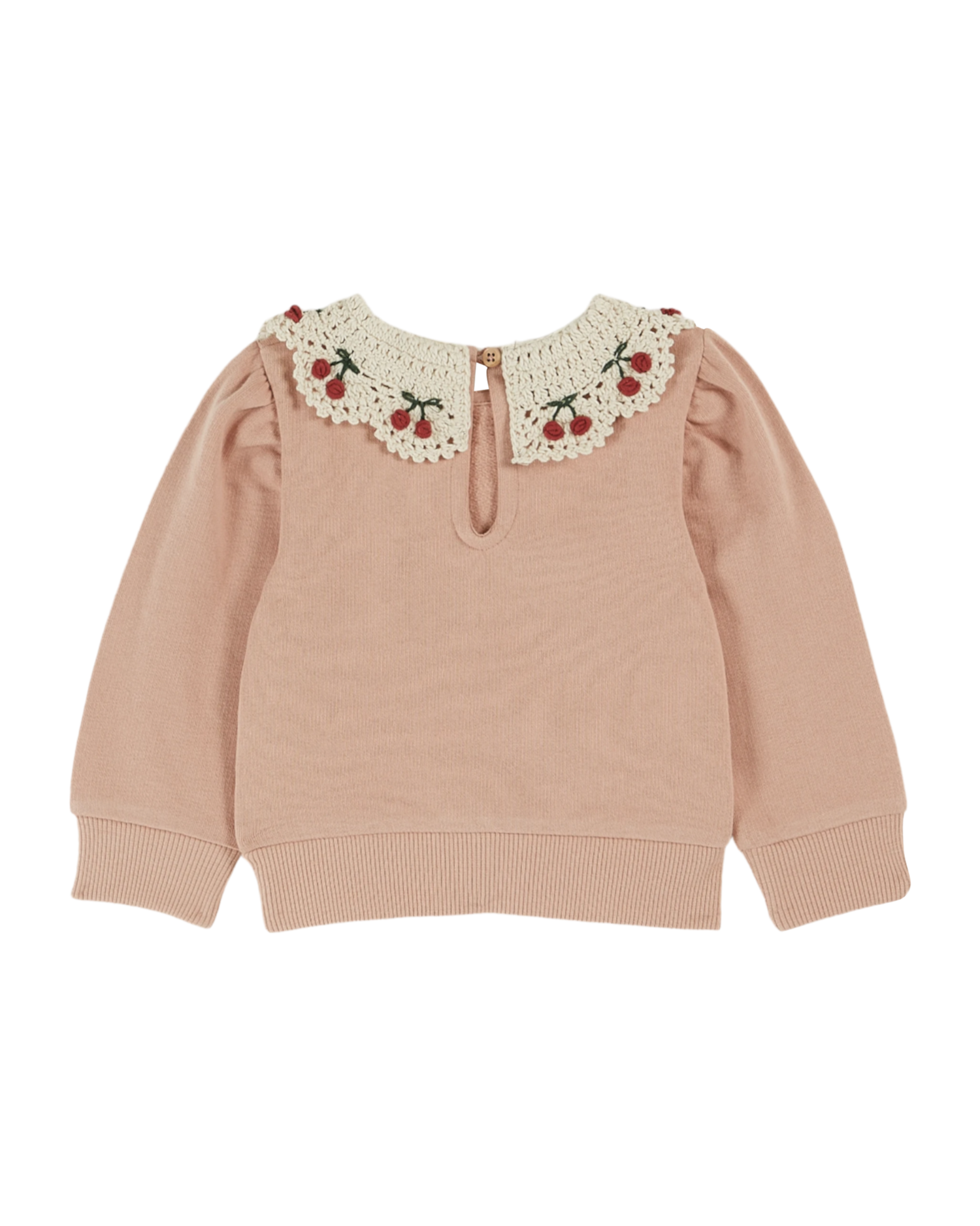 Sweatshirt en coton biologique rose poudré. Un sweat qui pourrait ressembler à tous les sweats avec des manches longues, une encolure ras du cou et du bord-côte autour des poignets et de la base. Mais le col fait la différence. Il est crocheté en coton ton sur ton et rebrodé à la main de petites cerises roses par des artisans indiens. Une ouverture goutte dans le dos avec sa bride et son bouton en bois permet de passer facilement la tête sans s'arracher les oreilles.