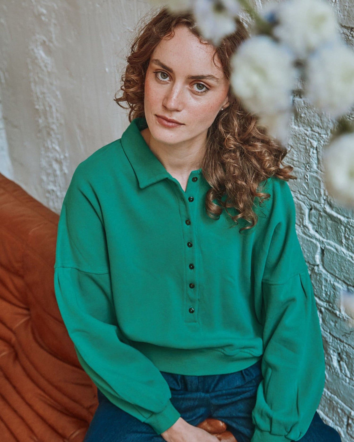 Sweatshirt en coton biologique molletonné et gratté vert printemps. Un sweat qui ressemble à presque tous les sweats mais en beaucoup plus doux : Emmanchures décalées, plis plats et couchés en tête de manches pour faire bouffer, bord-côte ton sur ton aux poignets et autour de la base, surpiqures. L'encolure ras du cou est ornée d'un col pointu et s'ouvre sur la patte de boutonnage qui vous permet de l'enfiler sans vous décoiffer.