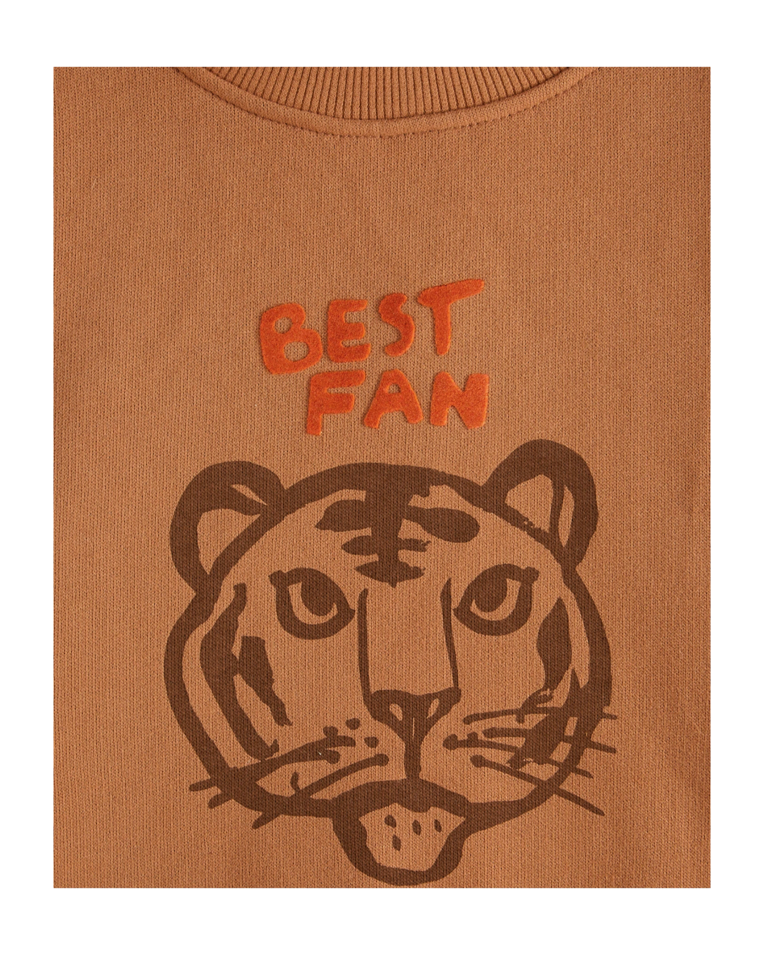 Avec ses deux manches longues, les finitions en bord-côte ton sur ton et l'encolure ras du cou, pas de doute c'est un sweatshirt. Ce qui le différencie des autres et que vous ne trouverez pas ailleurs... c'est le print du tigre attendrissant qui, pour l'instant, est notre "Best Fan" floqué orange.