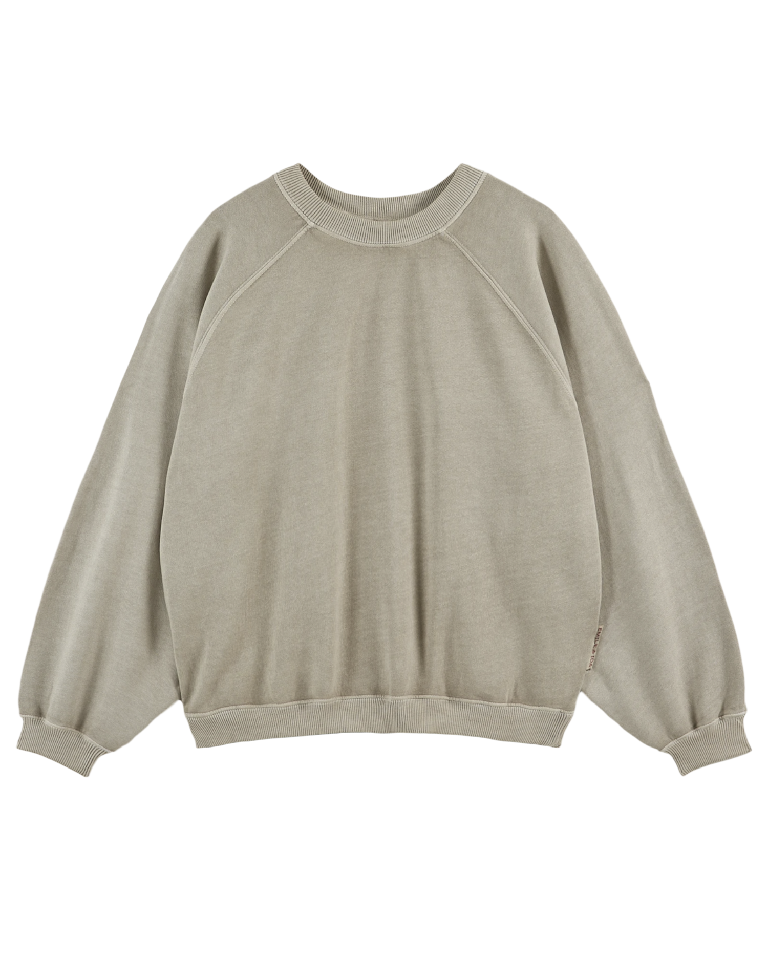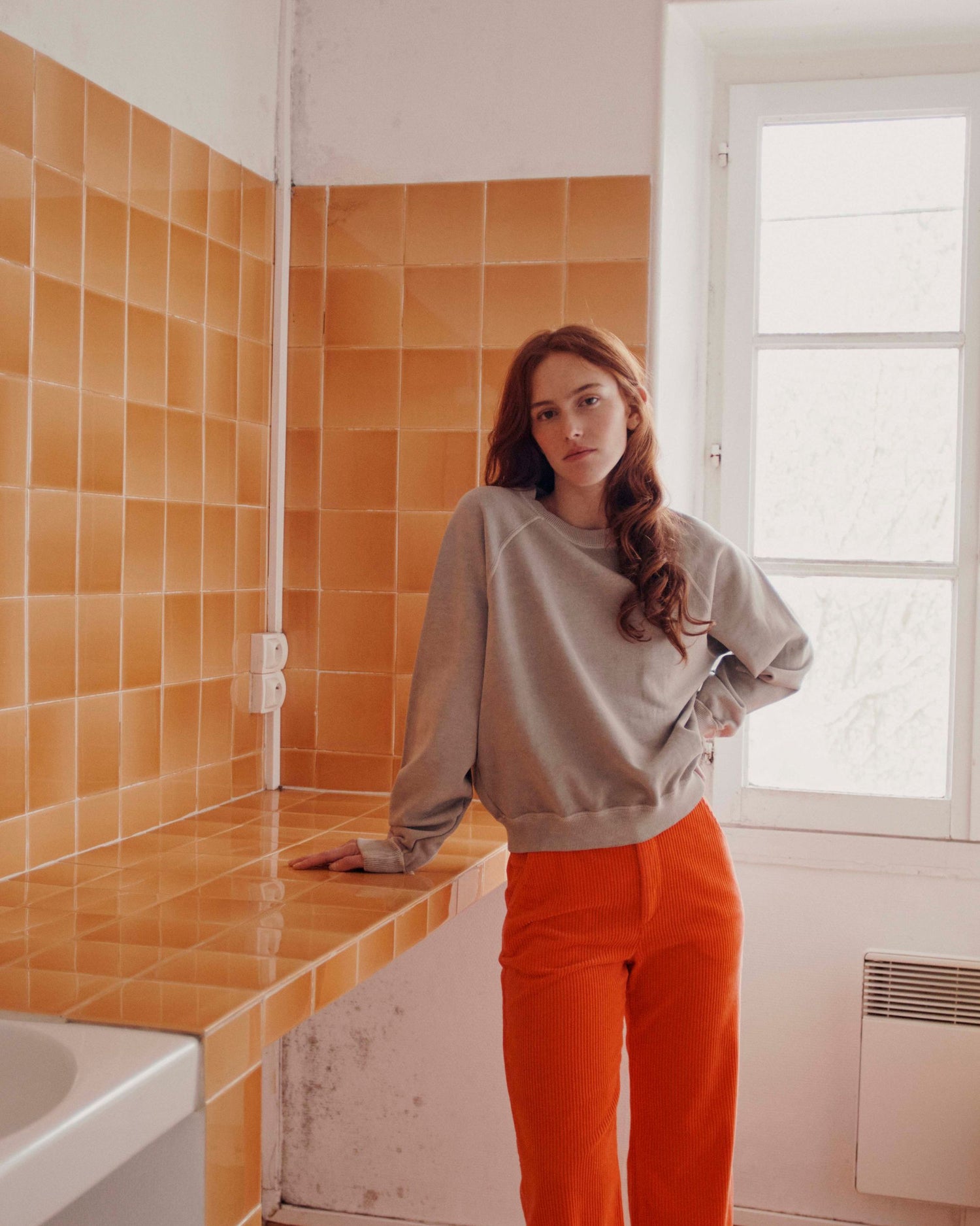 Sweatshirt en coton molletonné biologique gris argile. Un sweat qui ressemble à un sweat. Deux manches longues, bord-côte aux poignets, autour de l'encolure et à la base du corps. La spécificité du sweat ? Une teinture naturelle : il est teint en pièce, c'est-à-dire qu'il est coloré quand il est terminé avec des pigments minéraux tellement moins polluants.