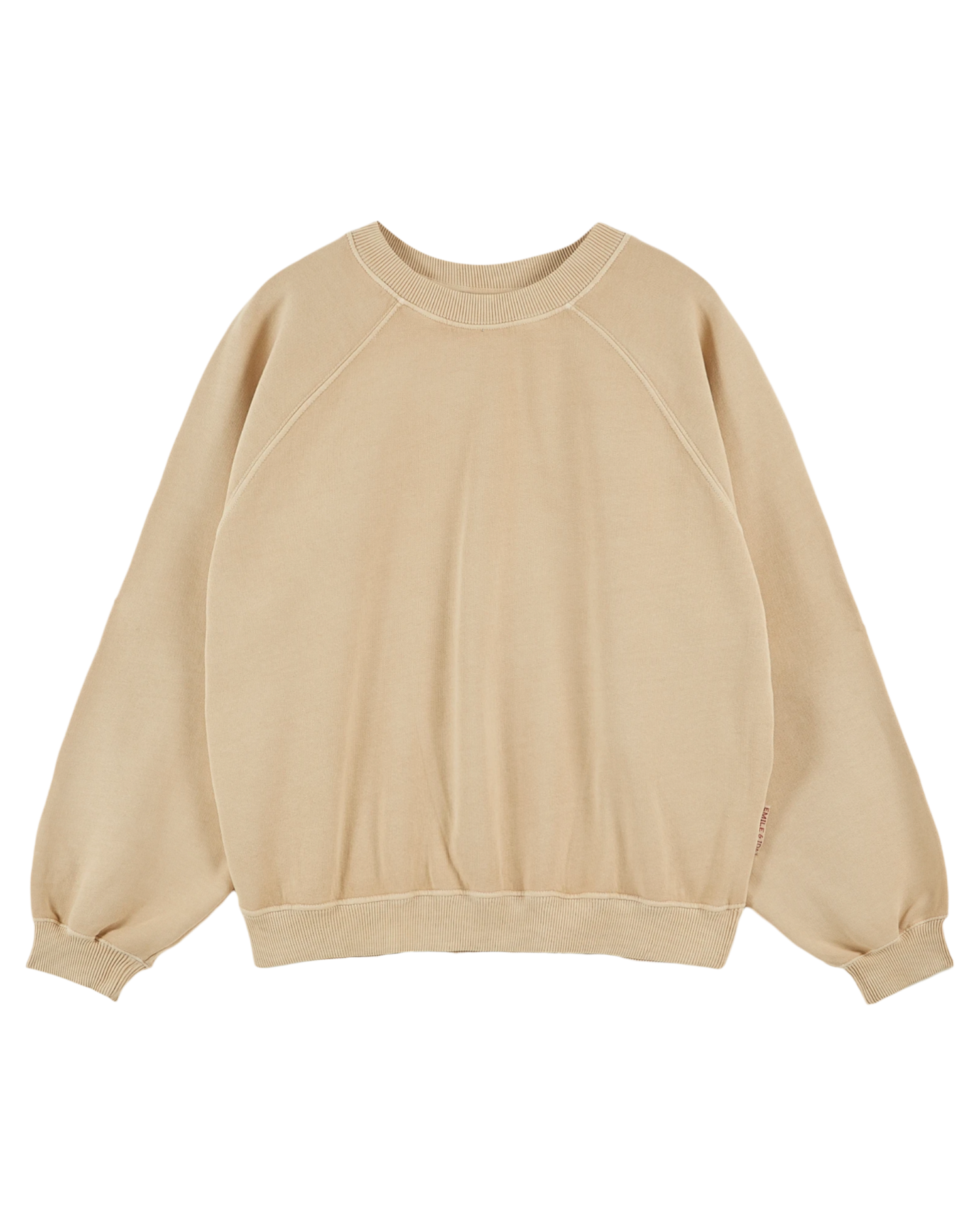 Sweatshirt en coton molletonné biologique beige. Un sweat qui ressemble à un sweat. Deux manches longues, bord-côte aux poignets, autour de l'encolure et à la base du corps. La spécificité du sweat ? Une teinture naturelle : il est teint en pièce, c'est-à-dire qu'il est coloré quand il est terminé avec des pigments minéraux tellement moins polluants.