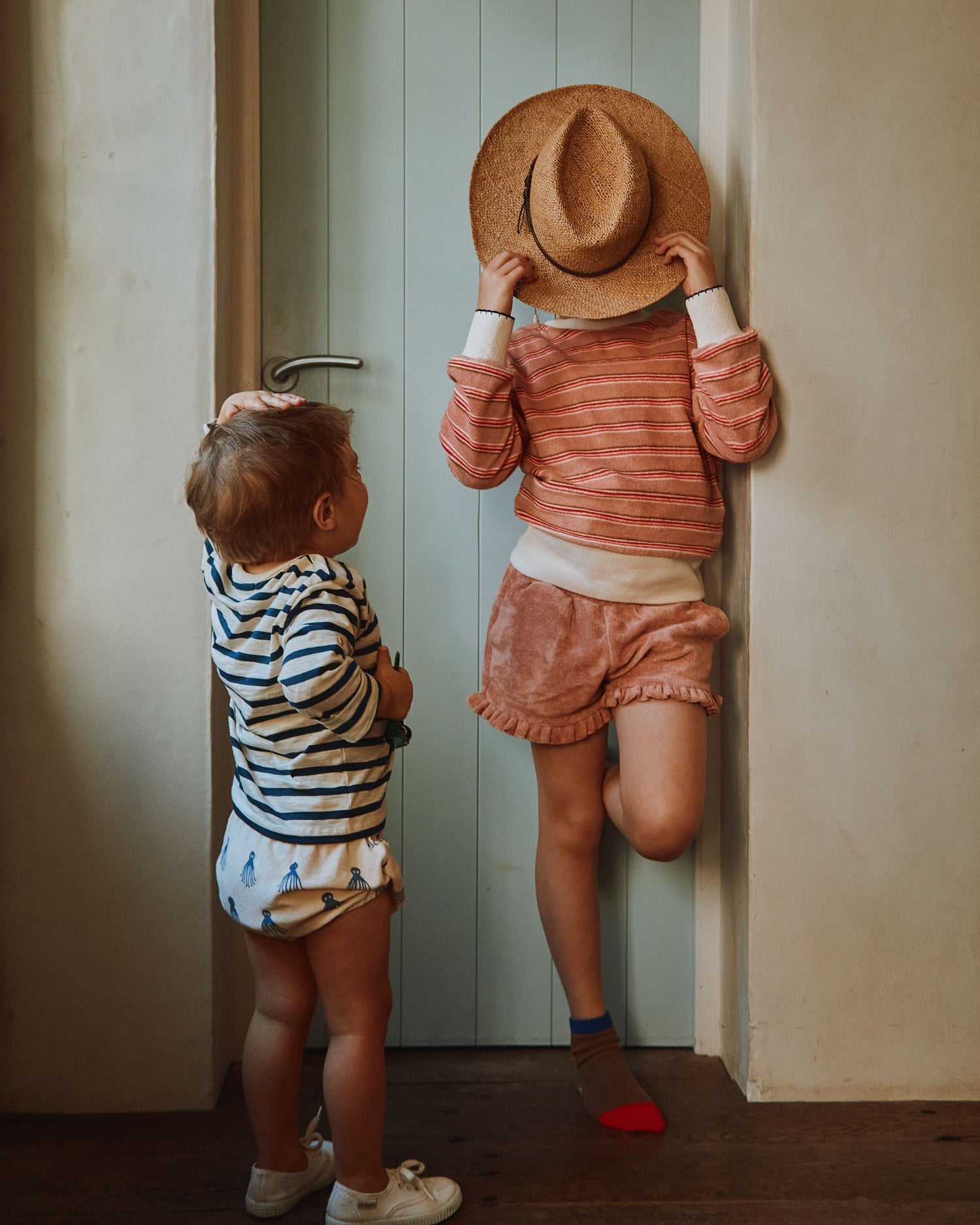 Sweatshirt en jersey éponge de coton et polyester rayé de lignes roses, blanches et caramel sur fond rose. Un sweat qui ressemble à nos sweats : manches longues, encolure ronde, bord-côte écru autour de l'encolure et à la base, bord-côte ajouré souligné de festons noirs aux poignets et bien entendu une matière toute douce. Dans la version bébé l'ouverture sur l'épaule se ferme avec des boutons en bois et facilite le passage de tête.