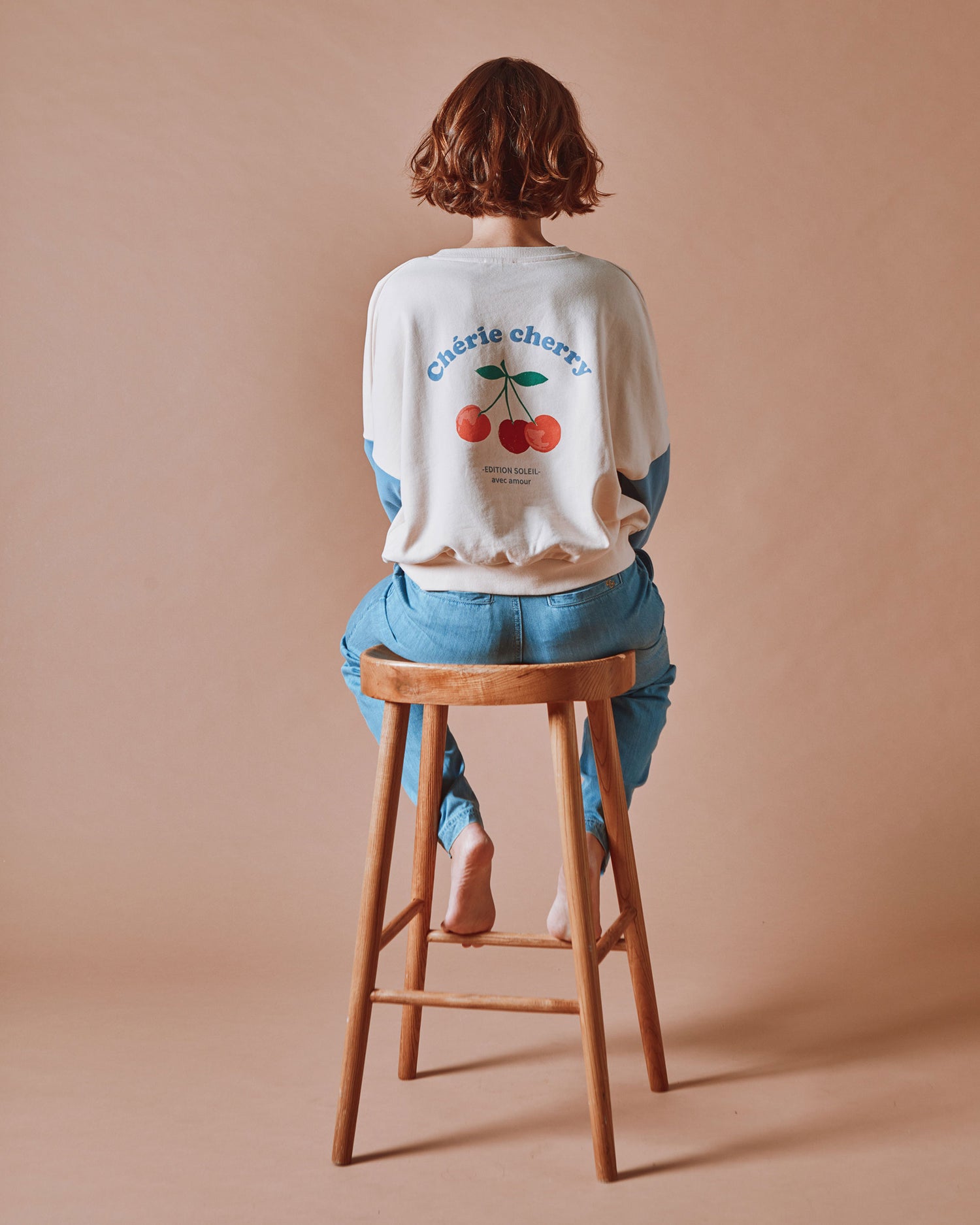 Ce sweatshirt bicolore en jersey de coton bio molletonné crème arbore sur le cœur la cerise iconique. Dans le dos un grand print du club "Chérie cherry".