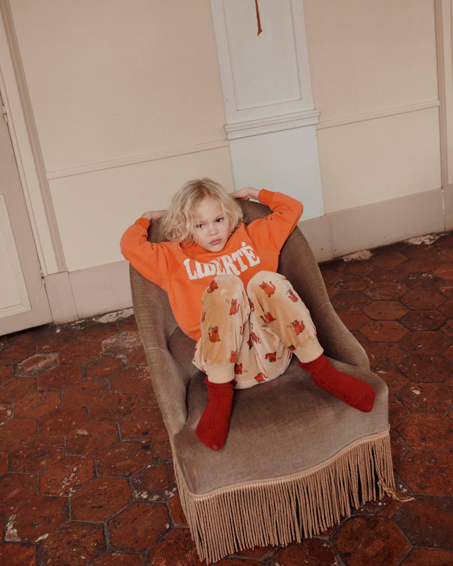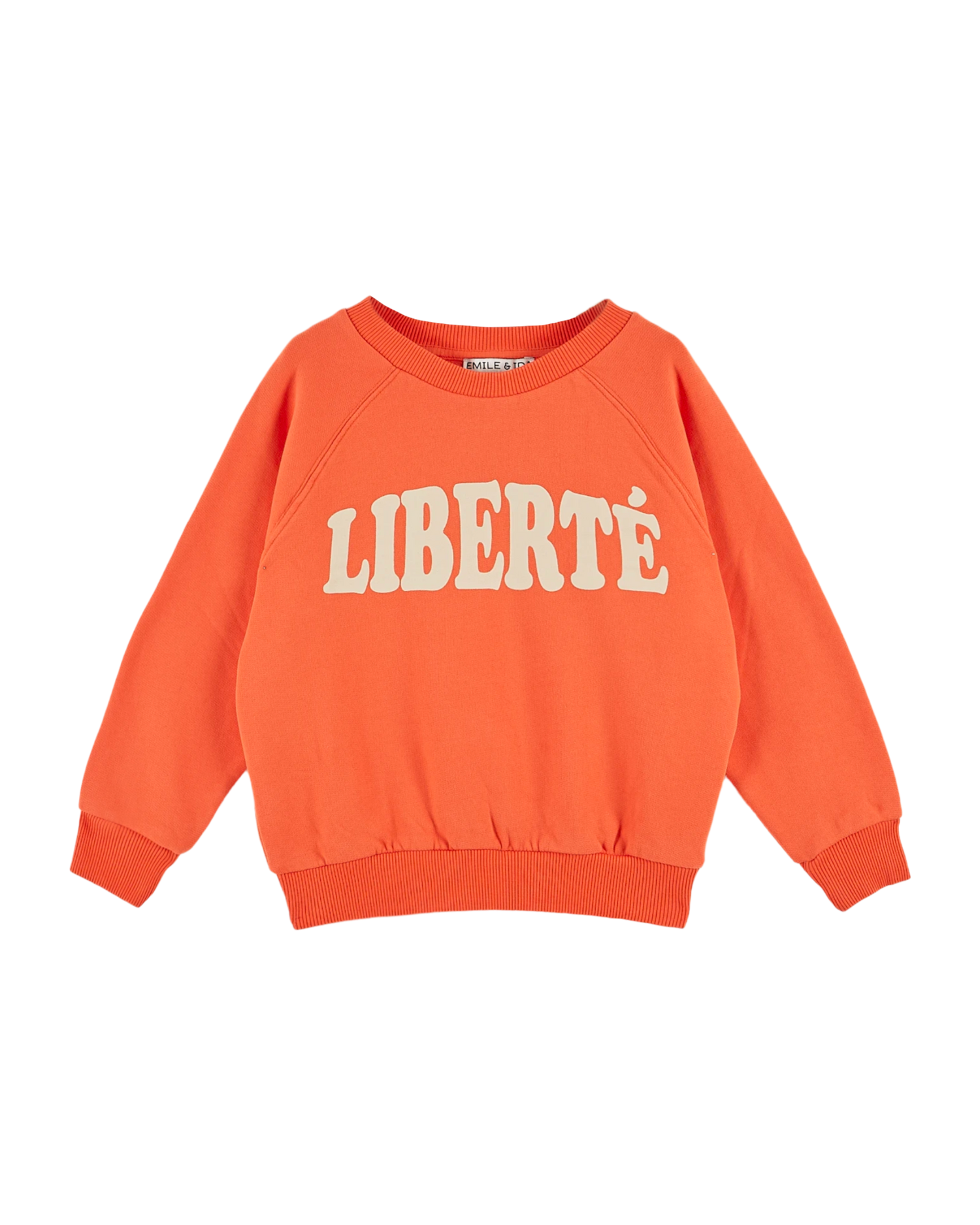 Sweatshirt en coton biologique molletonné et gratté orange. Un sweat qui ressemble à tous les sweats mais plus doux que doux avec emmanchures raglan qui conviennent à toutes les morphologies, bord-côte rapporté autour de l'encolure ras du cou, des poignets et de la base. Avec le print blanc barrant la poitrine, nous vous replongeons dans les années 70 quand un grand vent de liberté soufflait sur l'Angleterre, radios libres, rock débridé et couleurs flashy. La couleur justement, comme un lever de soleil annonçant des moments heureux, comme la promesse d'une journée aussi tonique et vitaminée qu'un verre de jus d'orange.