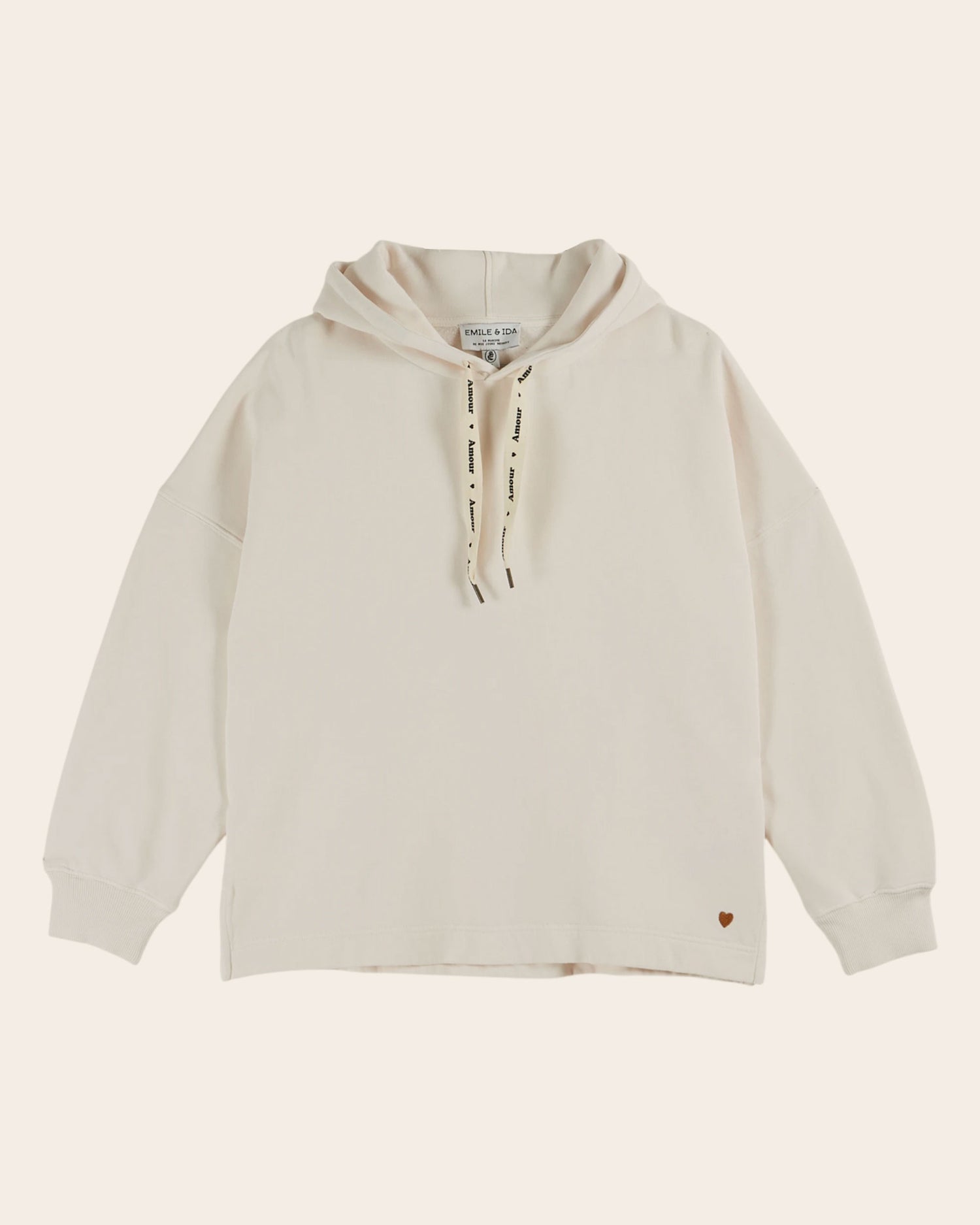 Sweatshirt en jersey de coton biologique molletonné écru. - Forme over-size - Matière d'une grande douceur - Encolure ras du cou - Fente d'aisance dans les coutures latérales - Lien en sergé de coton écru siglé "Amour" - Emmanchures décalées - Ourlet à la base du sweat - Coeur brodé marron