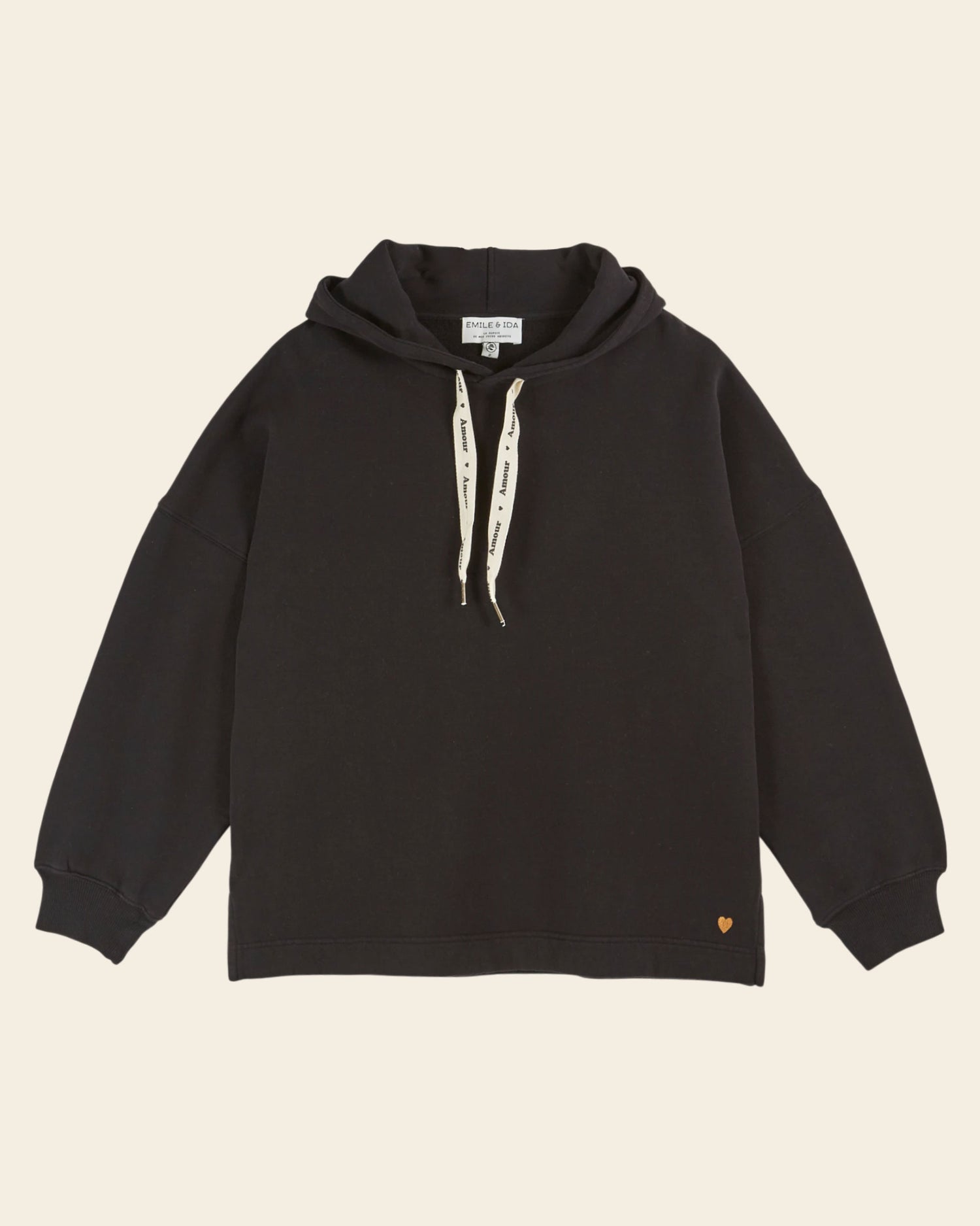 Sweatshirt en jersey de coton biologique molletonné noir. - Forme over-size - Matière d'une grande douceur - Encolure ras du cou - Fente d'aisance dans les coutures latérales - Lien en sergé de coton écru siglé "Amour" - Emmanchures décalées - Ourlet à la base du sweat - Coeur brodé doré