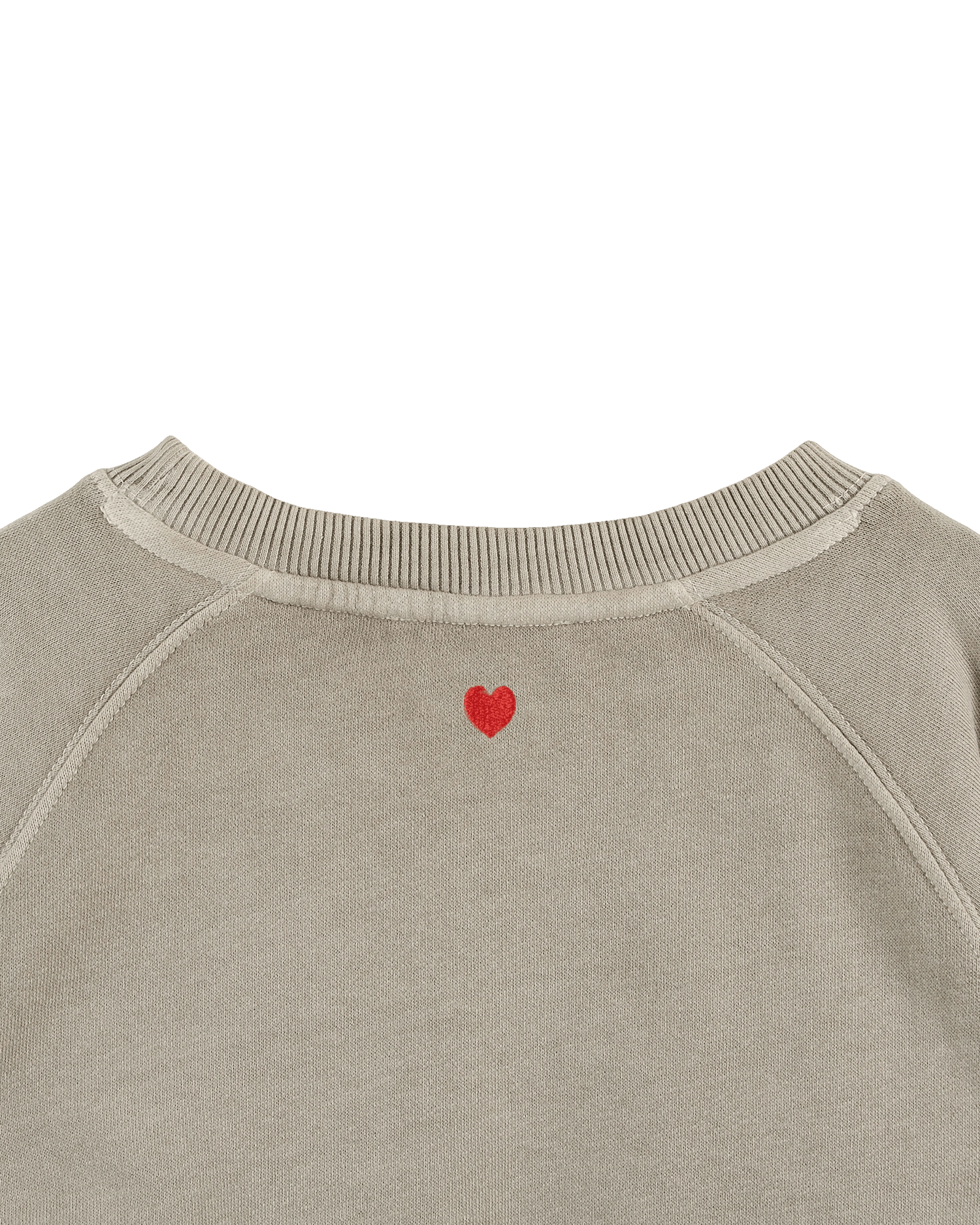 Sweatshirt en coton molletonné et gratté gris argile. En hiver il faut gratté le coton parce que cela le rend plus doux, plus moelleux et plus chaud. Comme tous les sweats il a deux manches longues aux emmanchures raglan pour s'adapter à toutes les morphologies, une encolure ras du cou et du bord-côte autour de la base, des poignets et de l'encolure. Avez-vous repéré le coeur brodé ? La spécificité du sweat ? Une teinture naturelle : il est teint en pièce, c'est-à-dire qu'il est coloré quand il est terminé avec des pigments minéraux tellement moins polluants. La teinture se patine légèrement au fil des lavages, ce qui rend la pièce unique. Il peut y avoir de petites différences entre les pièces, puisqu'il s'agit d'une teinture irrégulière.