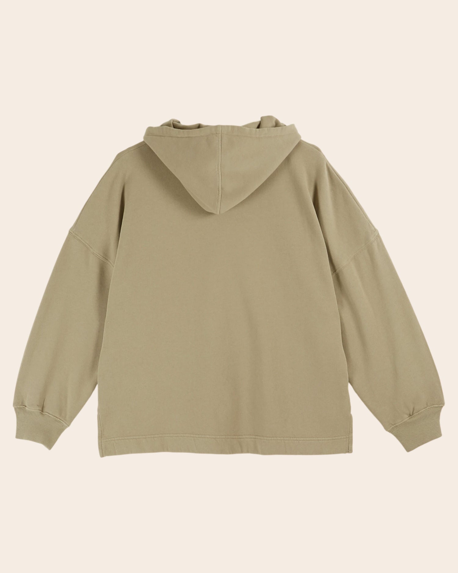 Sweatshirt en jersey de coton biologique molletonné kaki clair. - Forme over-size - Matière d'une grande douceur - Encolure ras du cou - Fente d'aisance dans les coutures latérales - Lien en sergé de coton écru siglé "Amour" - Emmanchures décalées - Ourlet à la base du sweat - Coeur brodé crème