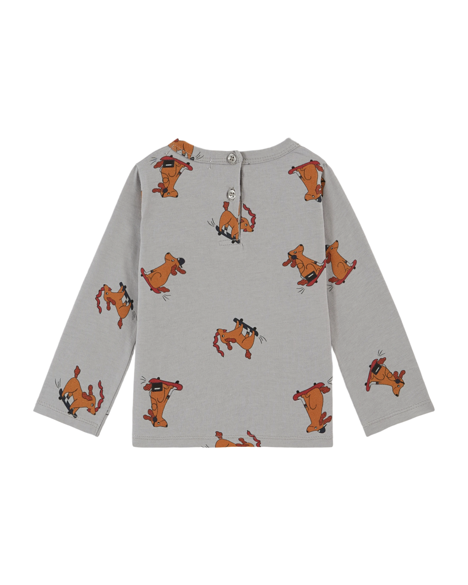 Tee-shirt en jersey de coton biologique gris sur lequel s'amusent des chiens facétieux. Ils font du skateboard assis, debout ou couchés, font des pirouettes ou se sauvent après avoir dérobé un chapelet de saucisses. Un tee-shirt de première classe puisqu'il a deux manches longues dont les poignets sont surpiqués, une encolure ronde terminée par du bord-côte, une matière toute douce et un print exclusif pour une pièce basique du vestiaire Emile & ida. Existe en bébé avec une patte de boutonnage dans le dos ou sur l'épaule pour faciliter le passage de tête.