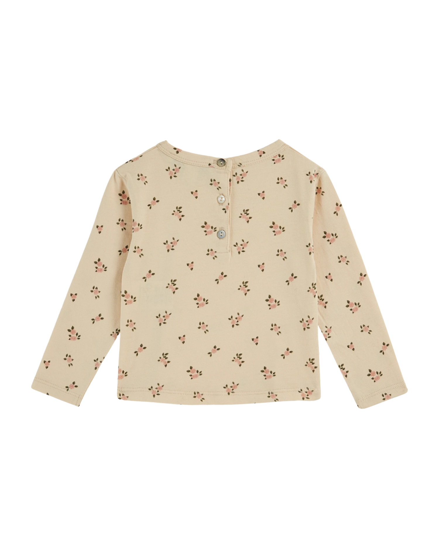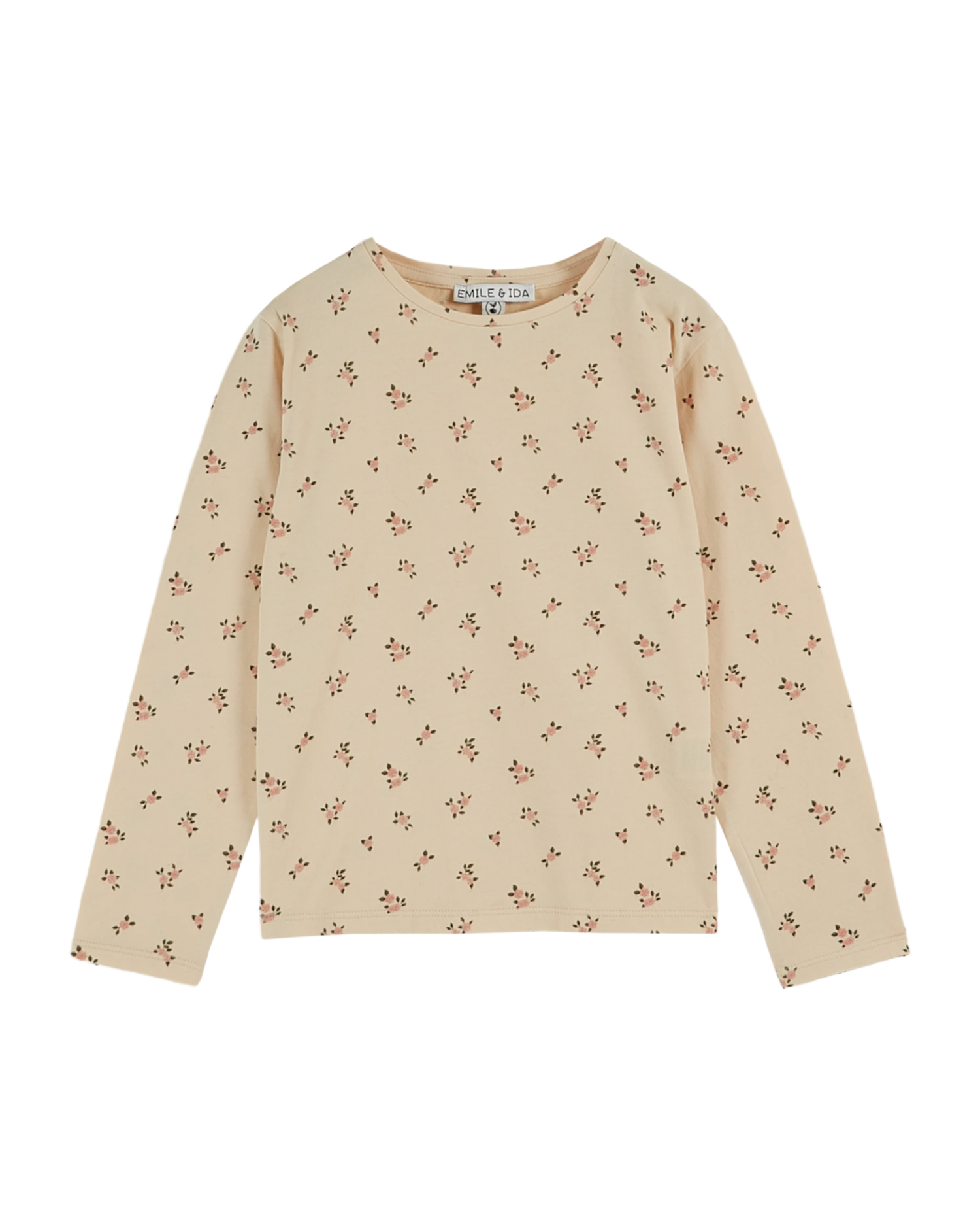 Tee shirt à manches longues en coton biologique brioche parsemé d'une multitude de petites roses. L'encolure est terminée par un fin bord-côte rapporté, les manches et le bas du tee shirt par un ourlet surpiqué.