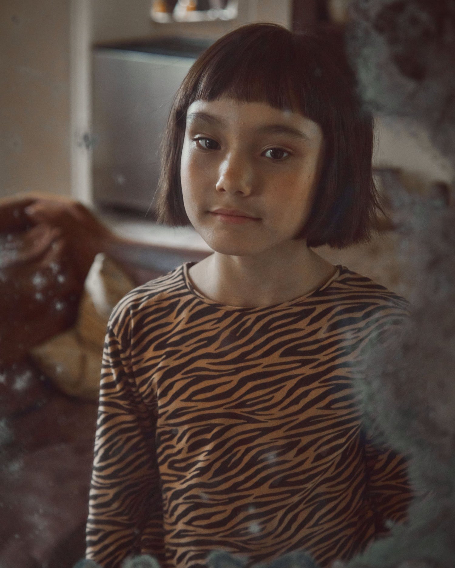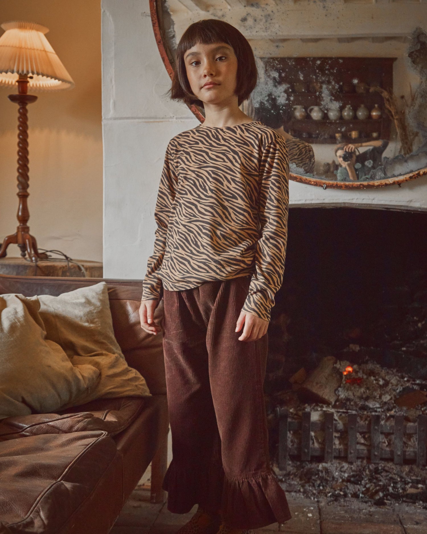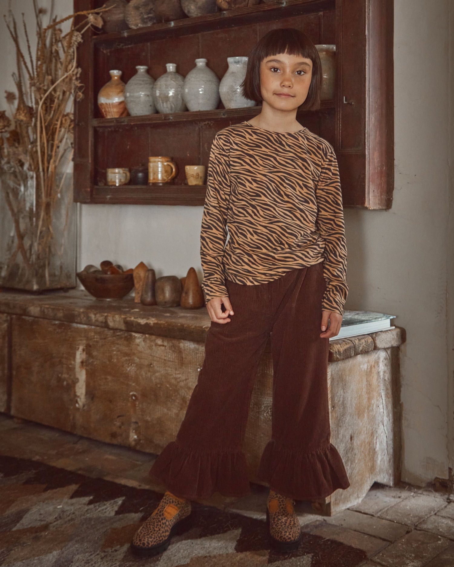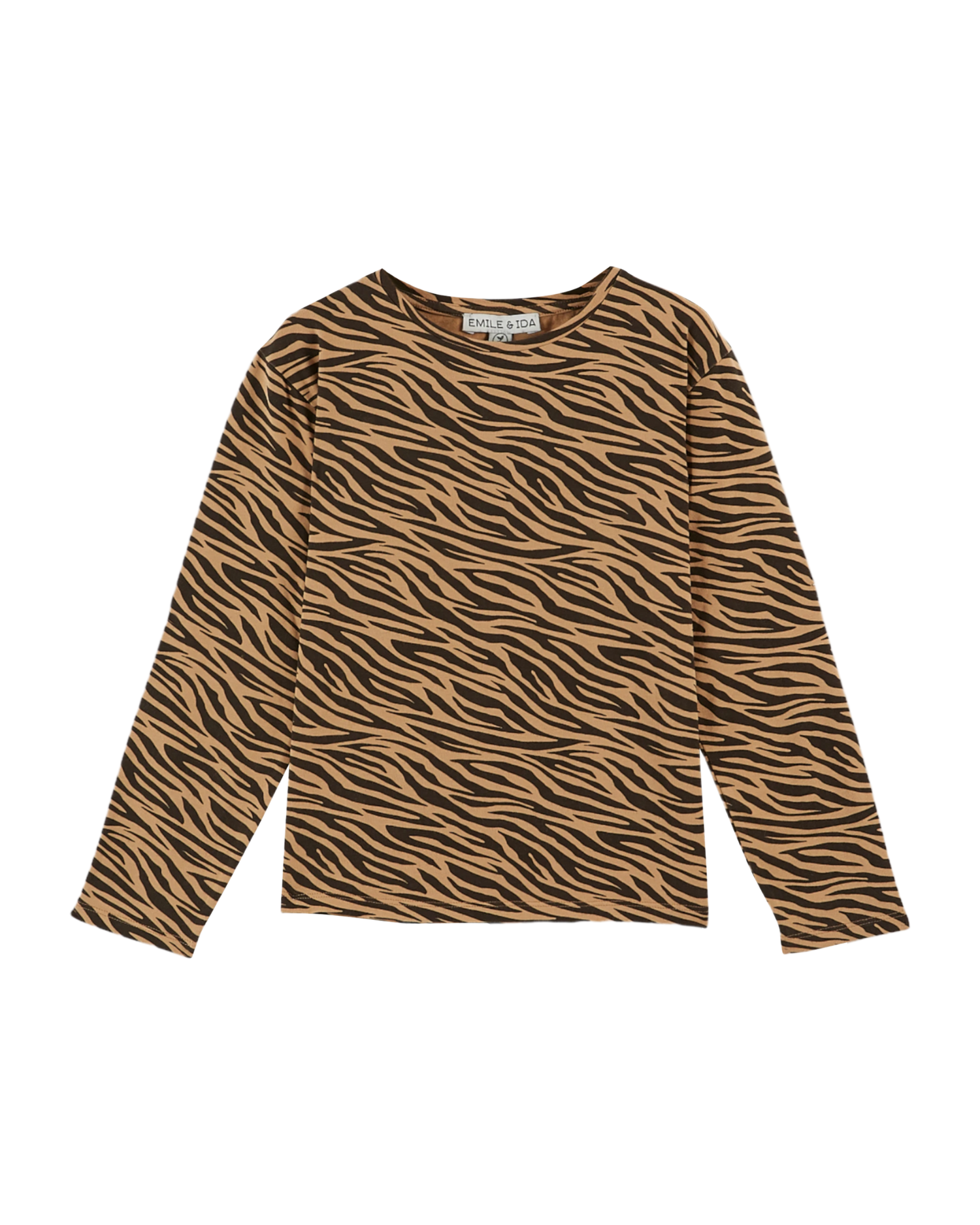 Tee-shirt en jersey de coton biologique beige et noir. Encore un tee-shirt..., celui-là a des manches longues et l'encolure est terminée par une bande de bord-côte…, qui ressemble à un tee-shirt… mais l'imprimé tigré aidera vos filles à passer inaperçues dans les lieux sauvages.