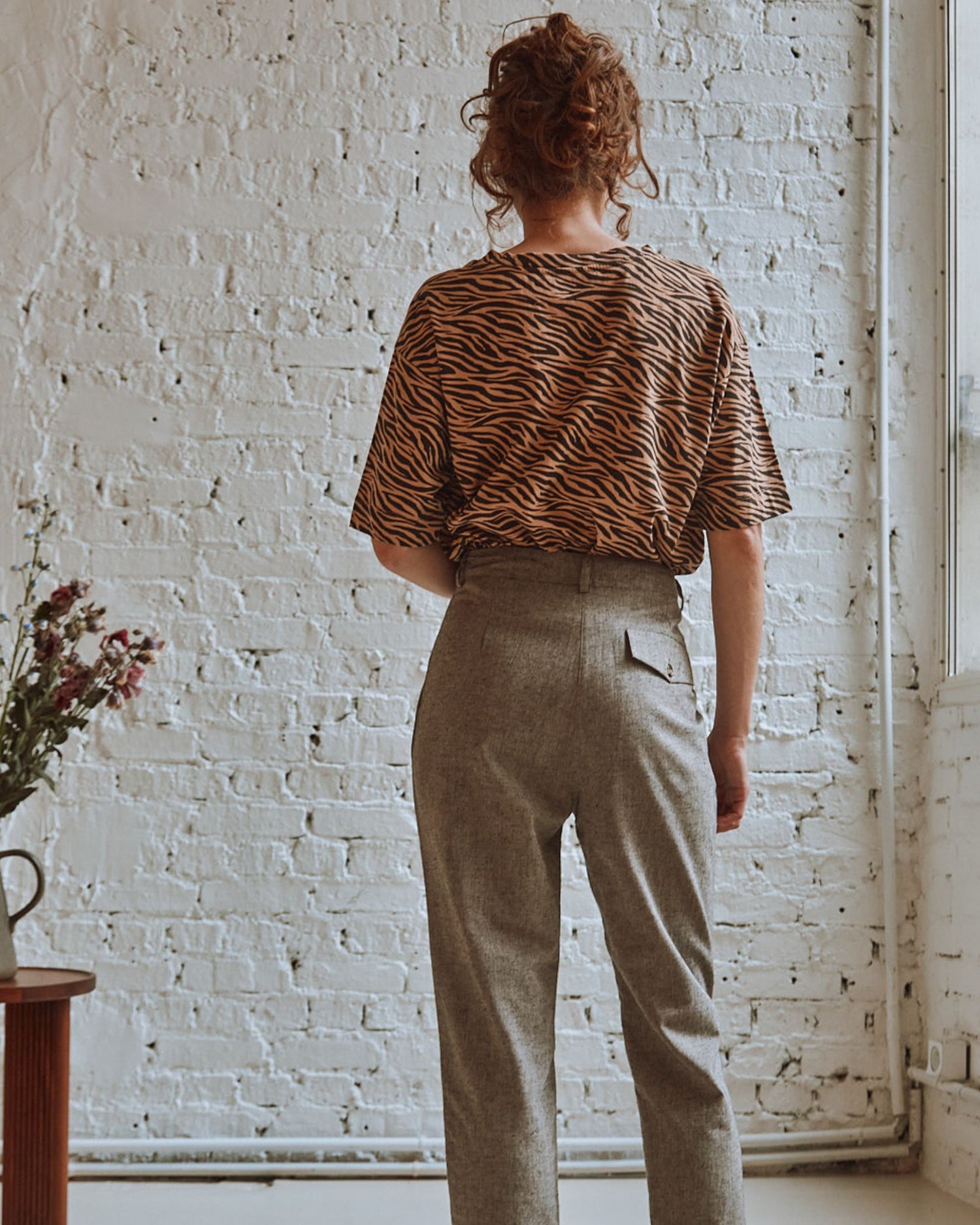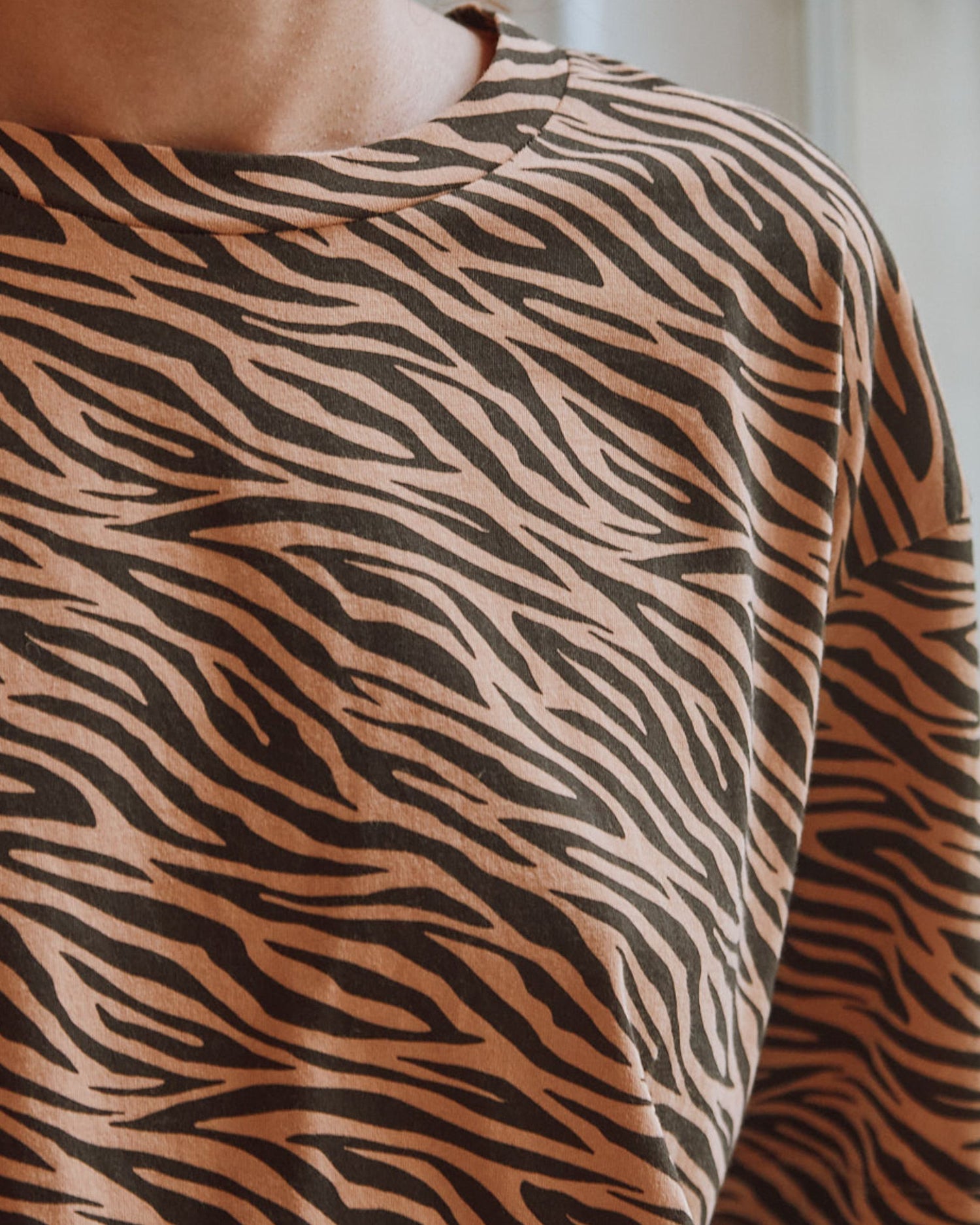 Un tee-shirt oversize à manches courtes avec l'encolure terminé par une bande de bord-côte… qui ressemble à un tee-shirt… mais l'imprimé vous aidera à passer inaperçue dans les lieux sauvages.