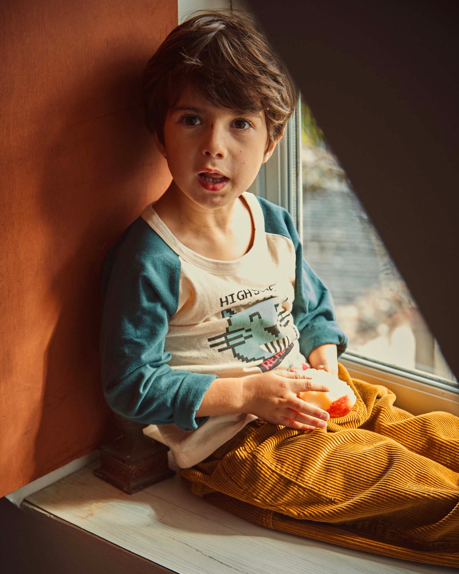 Tee-shirt en jersey de coton biologique écru et vert sapin. On vous emmène pour une petite balade dans les années 80. Le raglan des emmanchures surpiqué délimite les couleurs : vert des manches longues et écru du corps dont le print, tête de chat pixellisée, nous rappelle les premiers jeux vidéo. L'encolure ronde est bordée par un bord-côte écru. Allez hop, on enfile ce tee-shirt tout doux et on file jouer au baseball. Existe en bébé avec une patte de boutonnage dans le dos ou sur l'épaule pour faciliter le passage de tête.