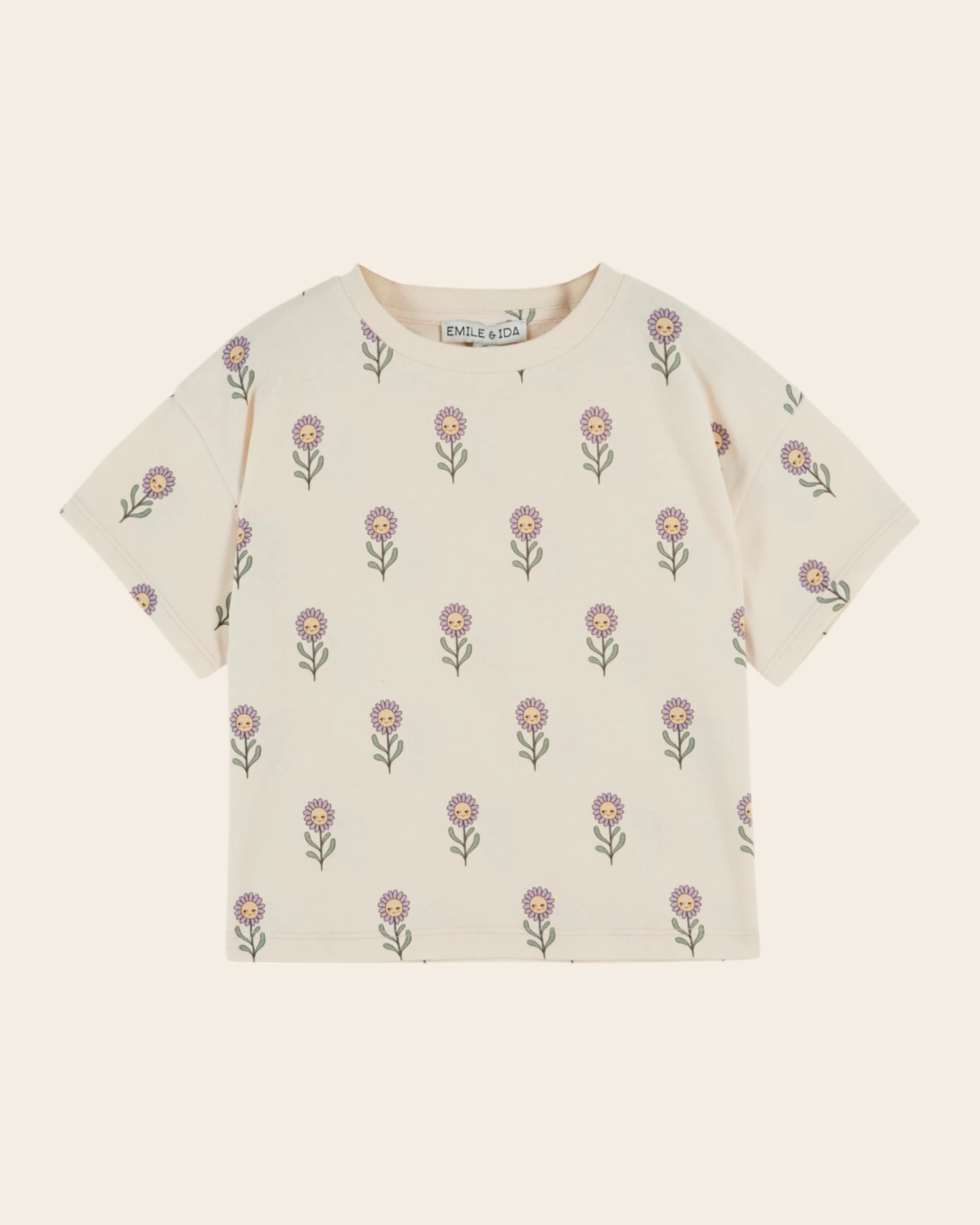 Tee-shirt en jersey de coton biologique crème imprimés en all-over de fleurs joyeuses mauve.