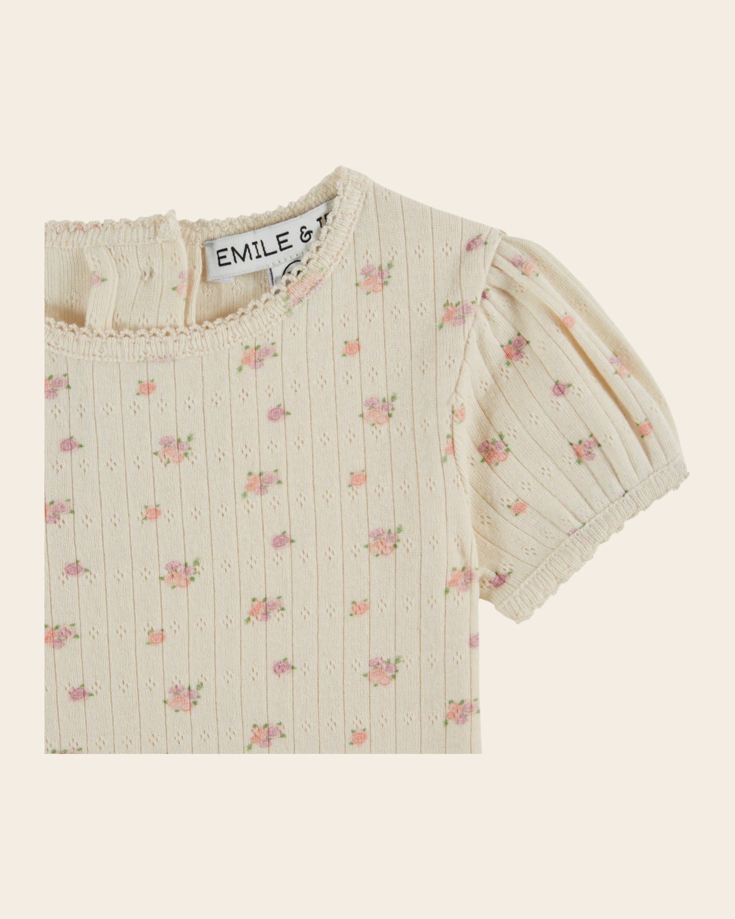 Tee-shirt en côtes et mailles pointelle de coton biologique et modal crème imprimé en all-over de fleurettes aux couleurs pastels. Les motifs ajourés de losanges permettent une meilleure respirabilité et un rendu visuellement raffiné.