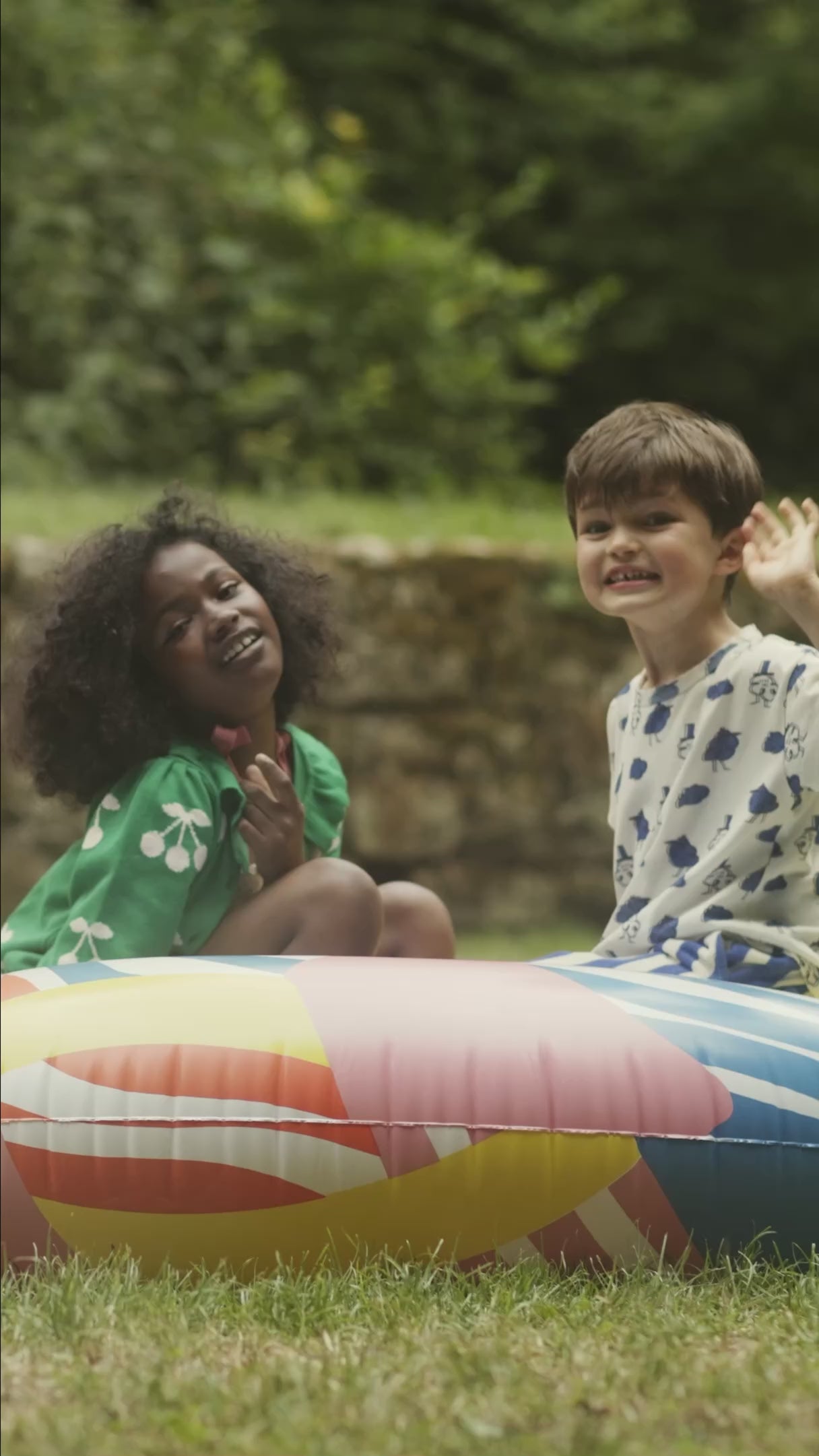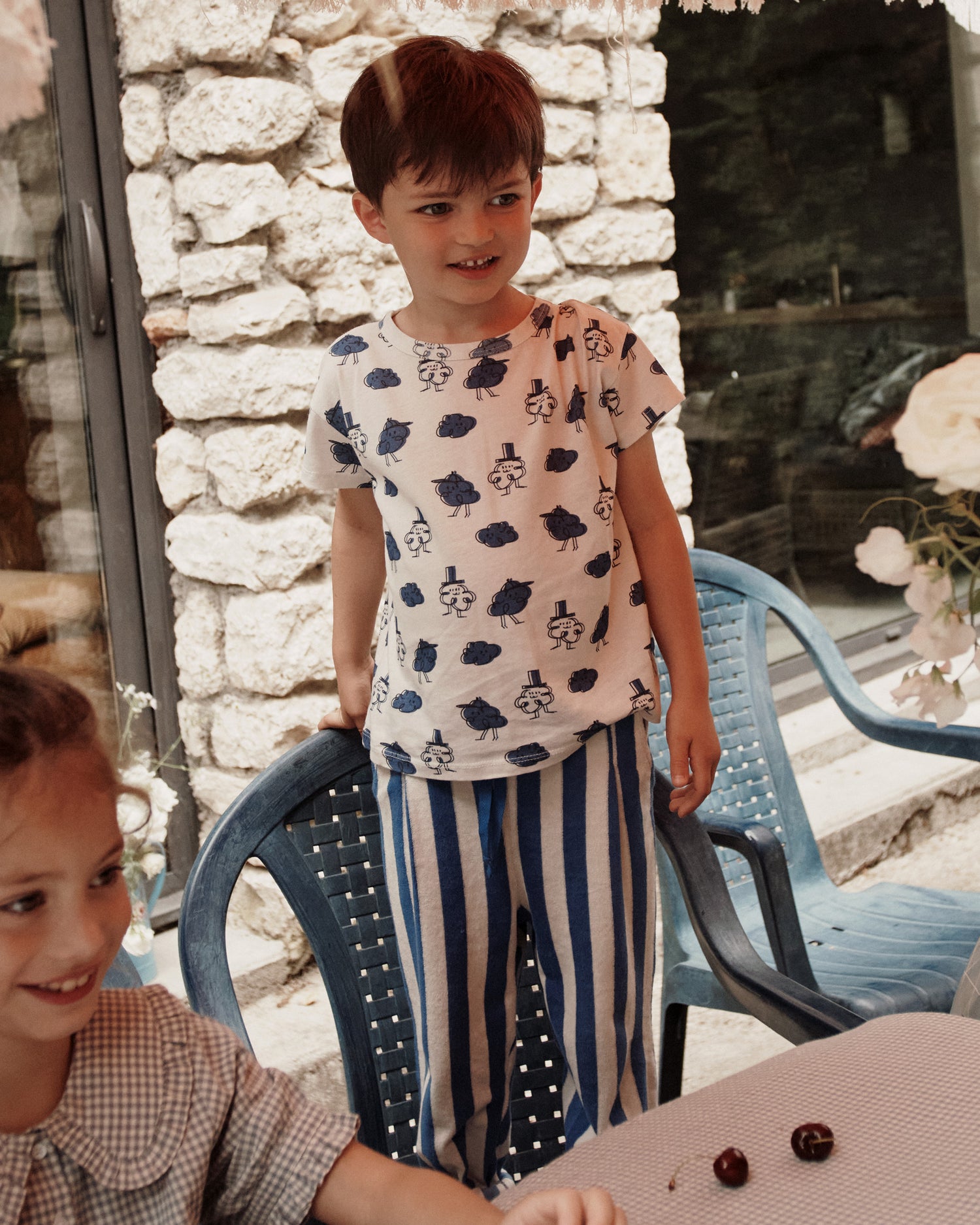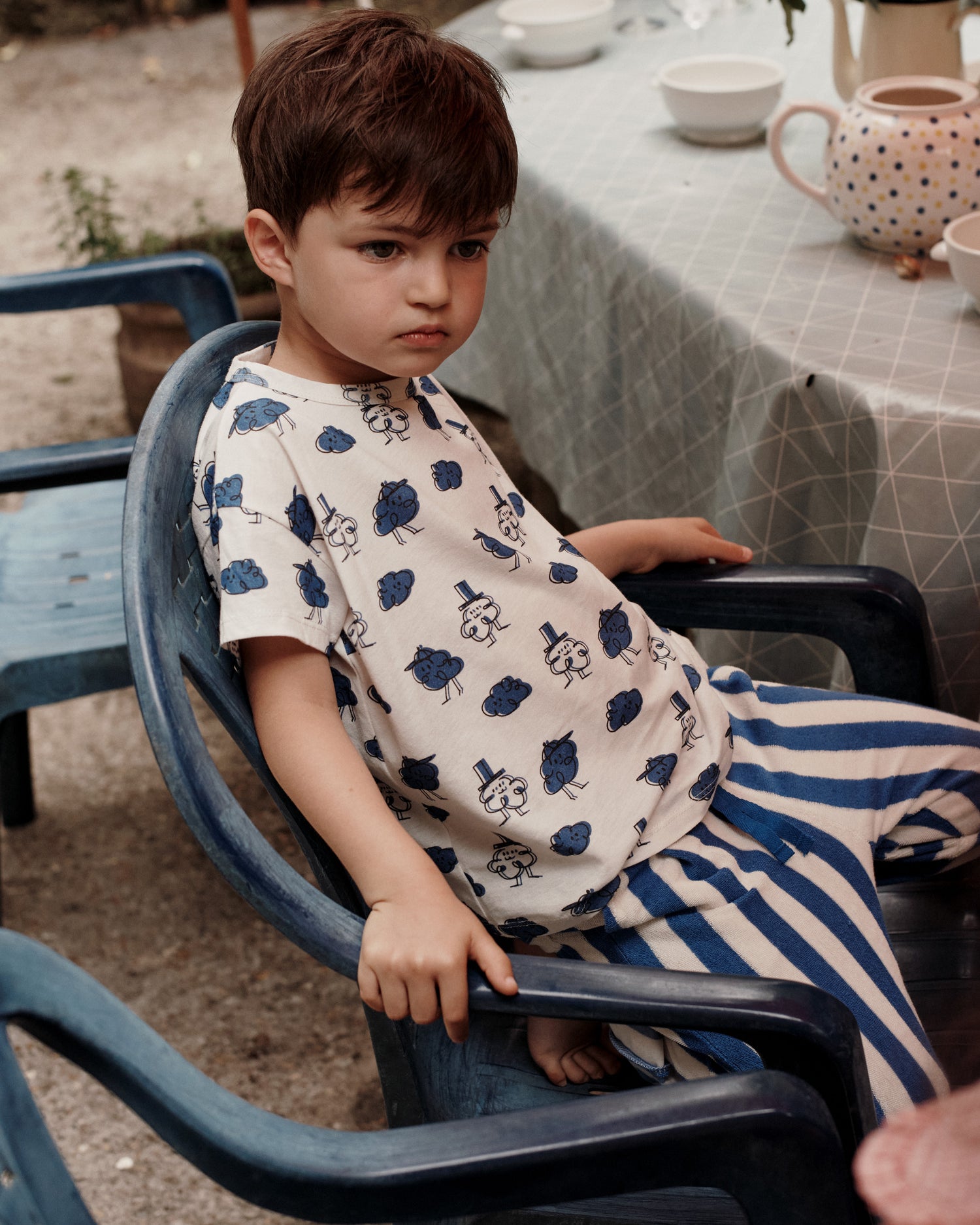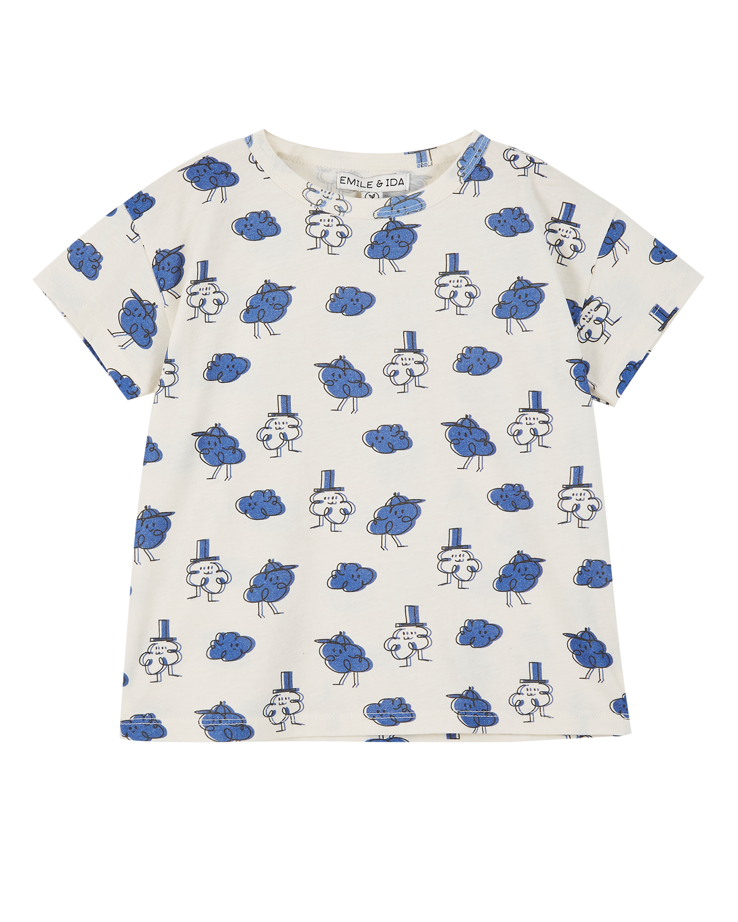 Dans la famille tee-shirt en jersey de coton biologique, je voudrais… Monsieur Météo ! Des nuages de beaux temps, bleus, coiffés de chapeaux haut de forme ou de casquettes se pavanent en all-over sur le fond écru. En taille bébé, une ouverture sur l'épaule avec deux boutons en nacre naturelle facilite le passage de tête.