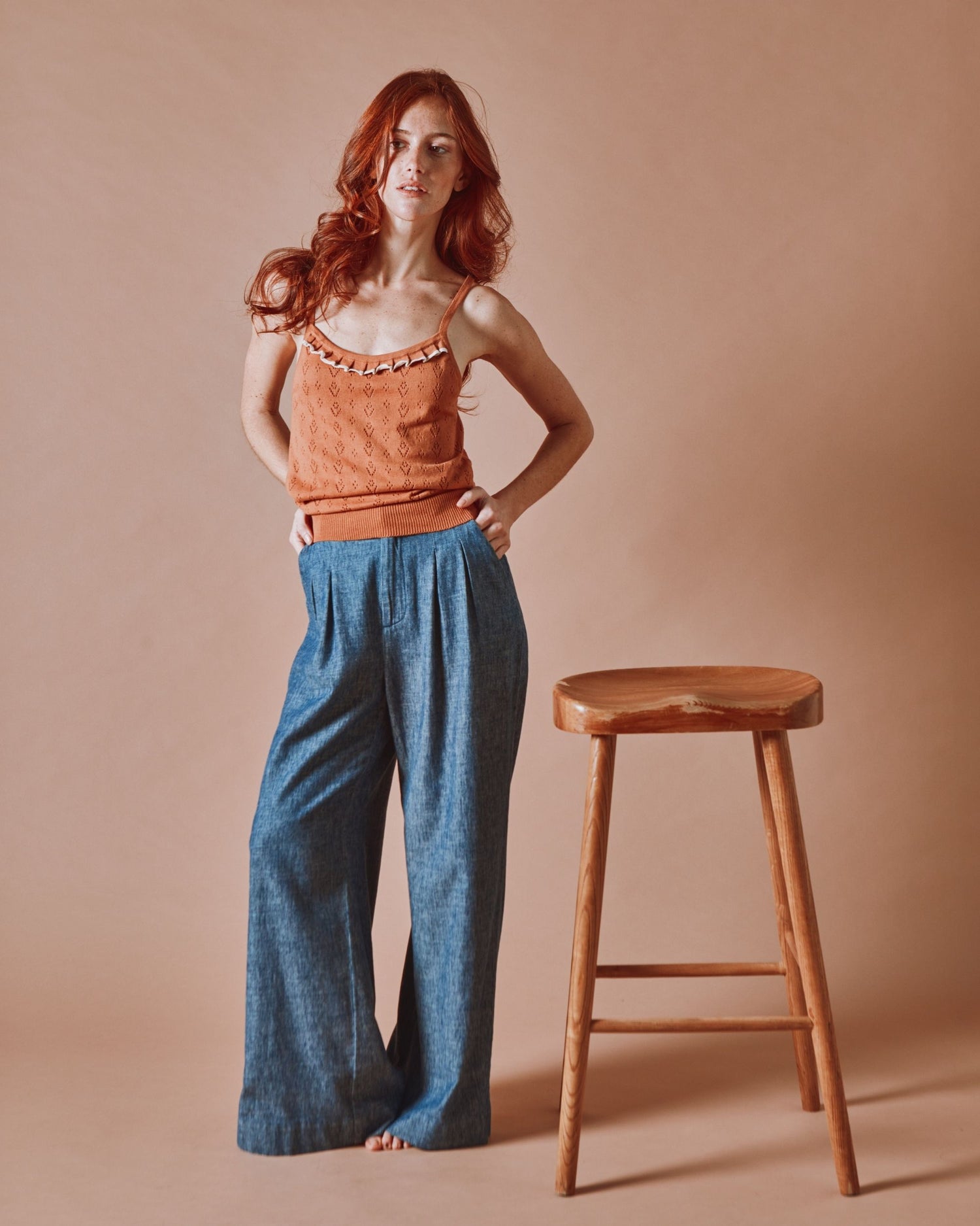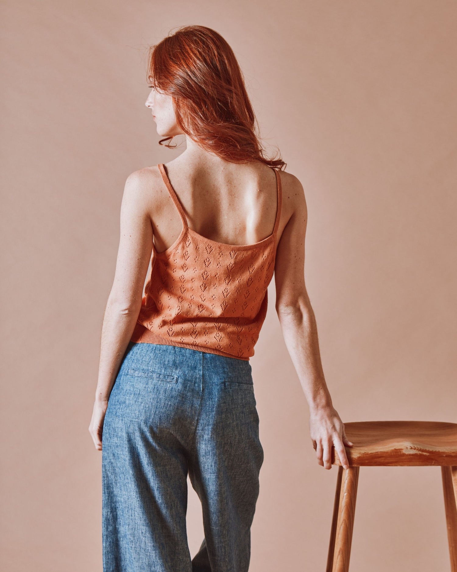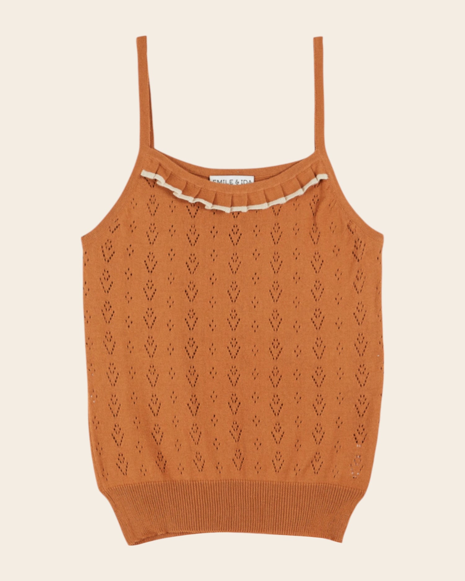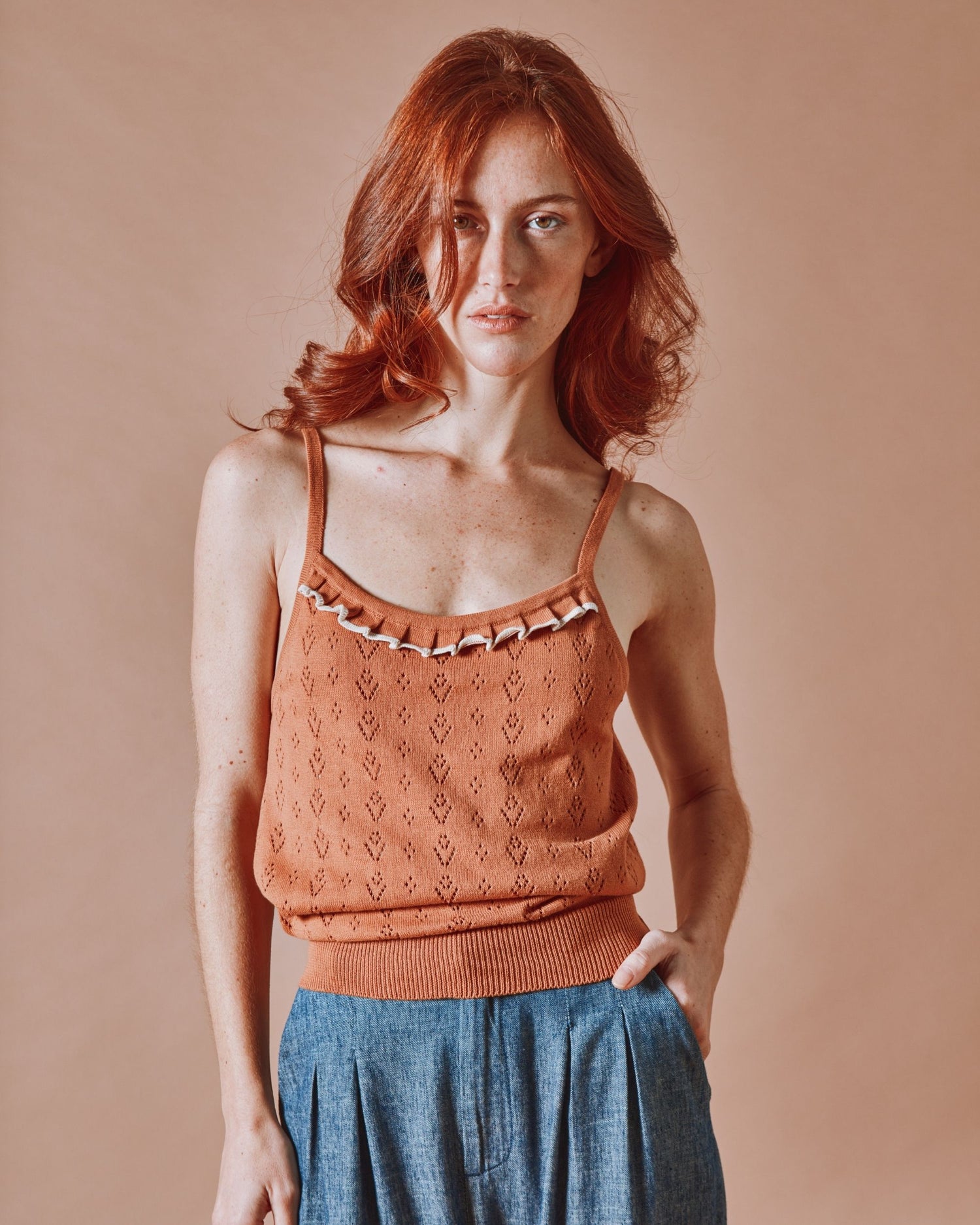 Top à bretelles en coton bio marron canelle, une pièce délicate et raffinée qui conjugue élégance et confort.
